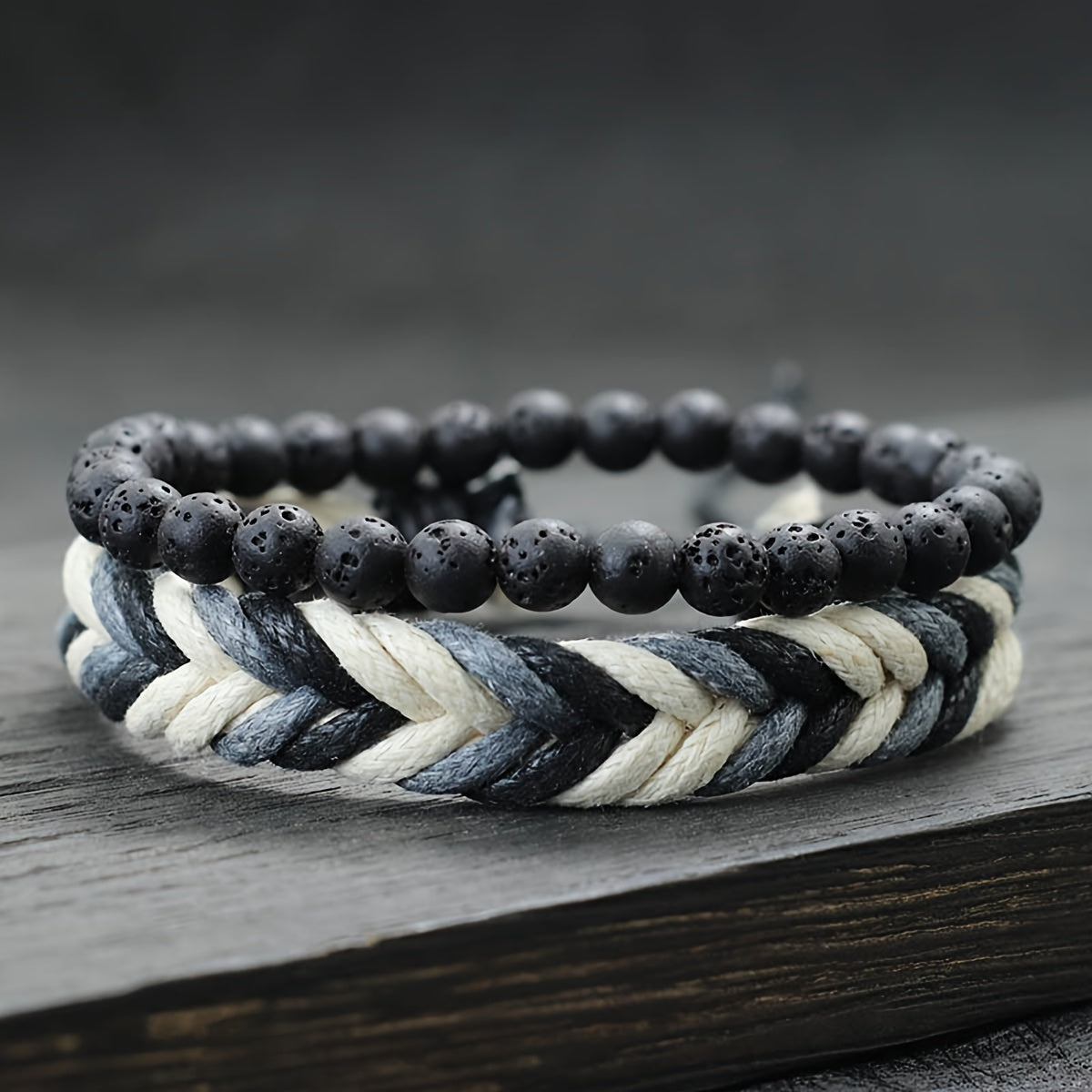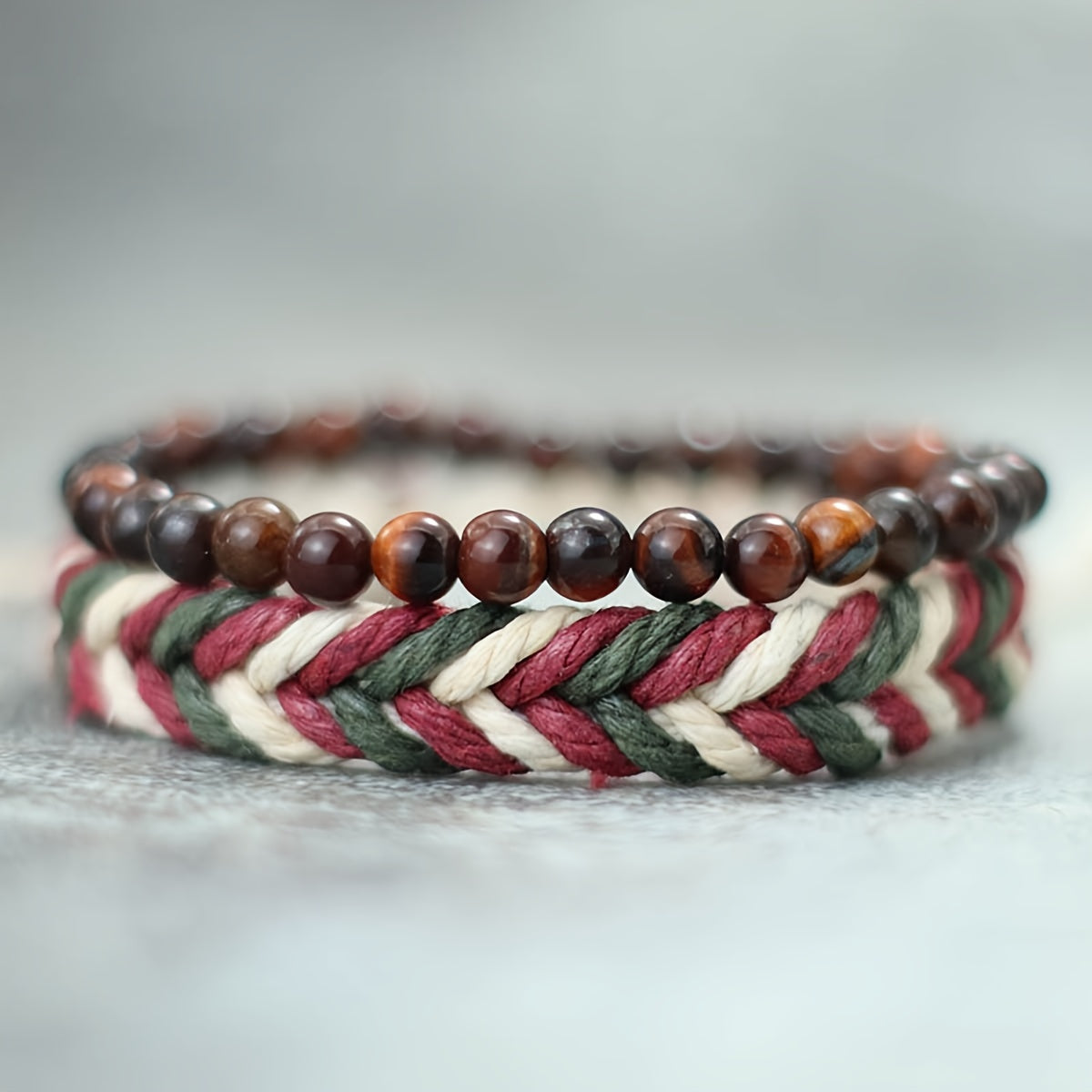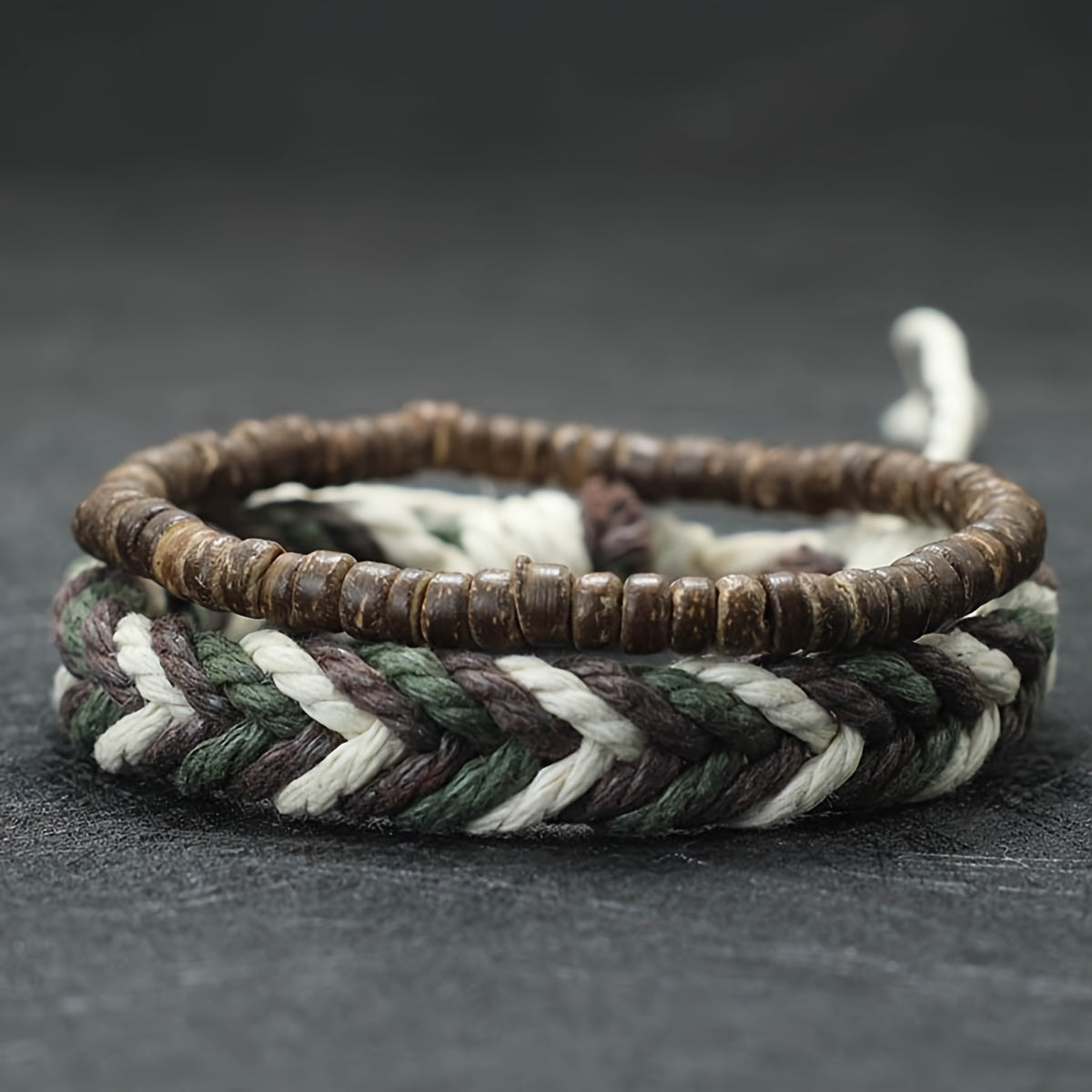 This 2-piece set features bohemian style bracelets made of natural wood beads woven together with synthetic stones. Crafted from non-plated nylon material, perfect for bohemian couples.