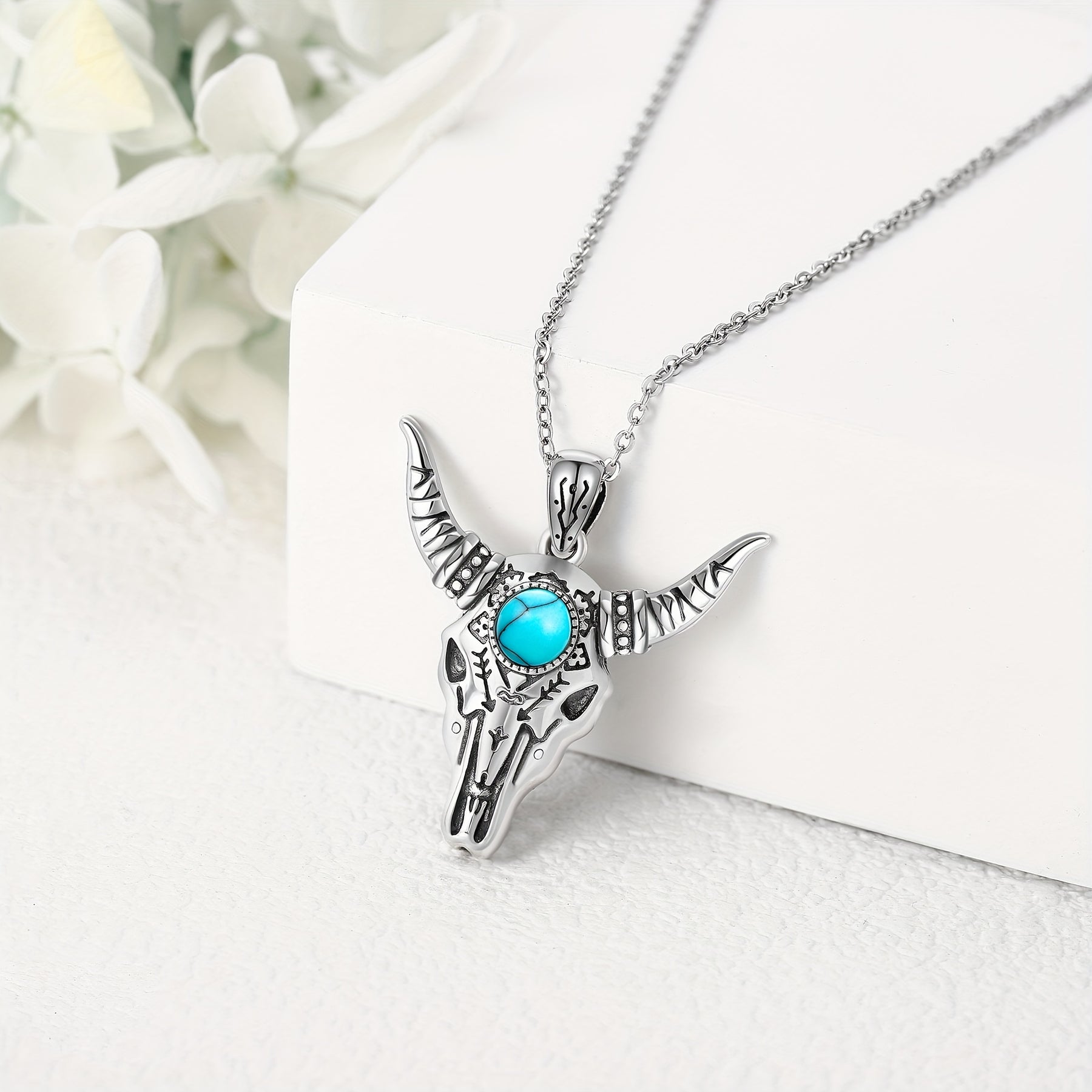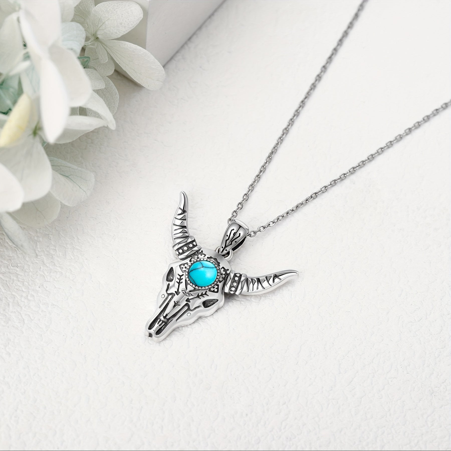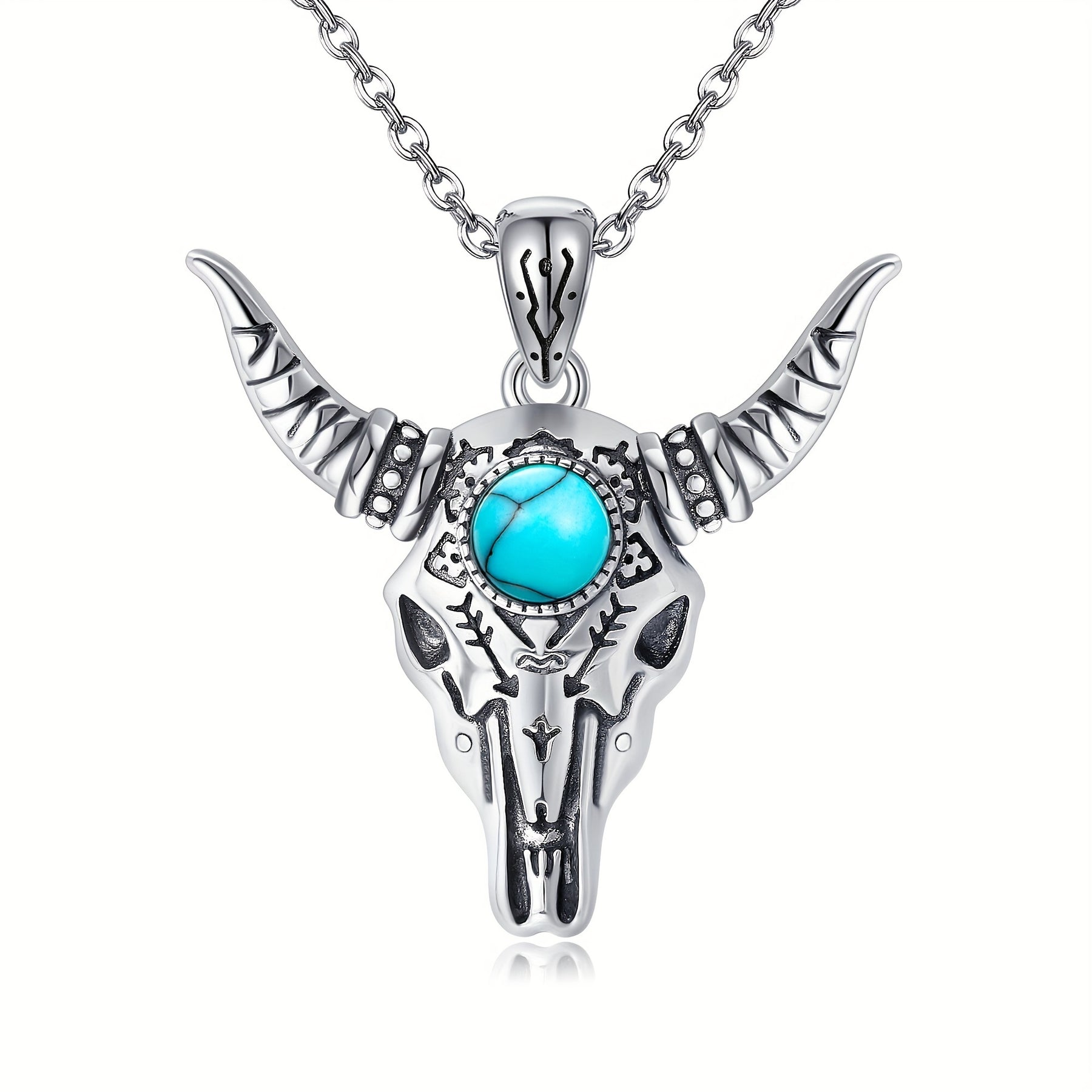 This bull skull necklace features a pure silvery design with a bohemian turquoise pendant, making it suitable for both men and women. Add a touch of western style to your outfit with this unique piece of jewelry.