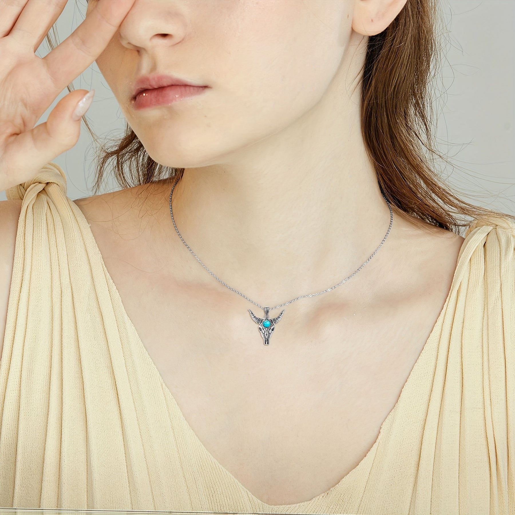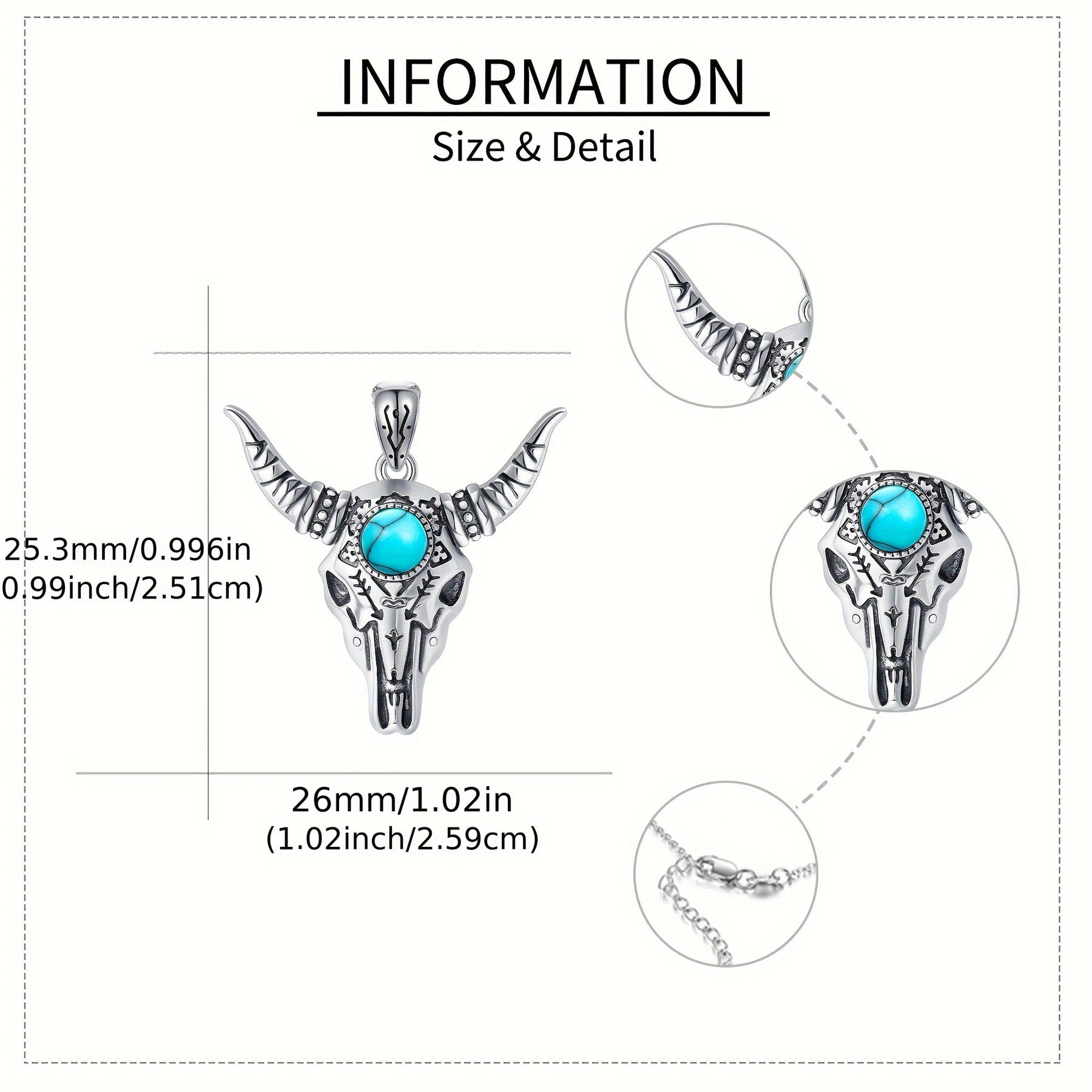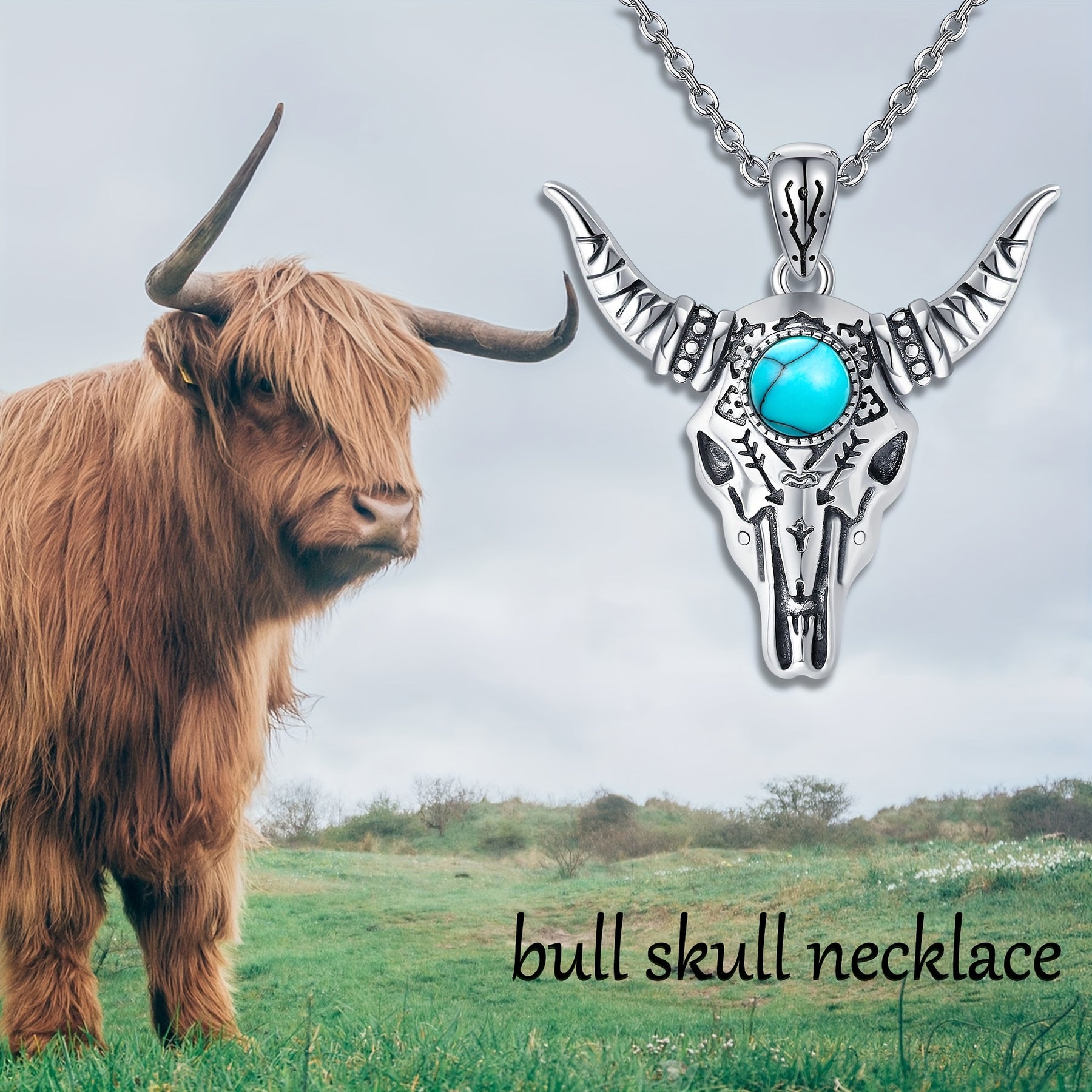 This bull skull necklace features a pure silvery design with a bohemian turquoise pendant, making it suitable for both men and women. Add a touch of western style to your outfit with this unique piece of jewelry.