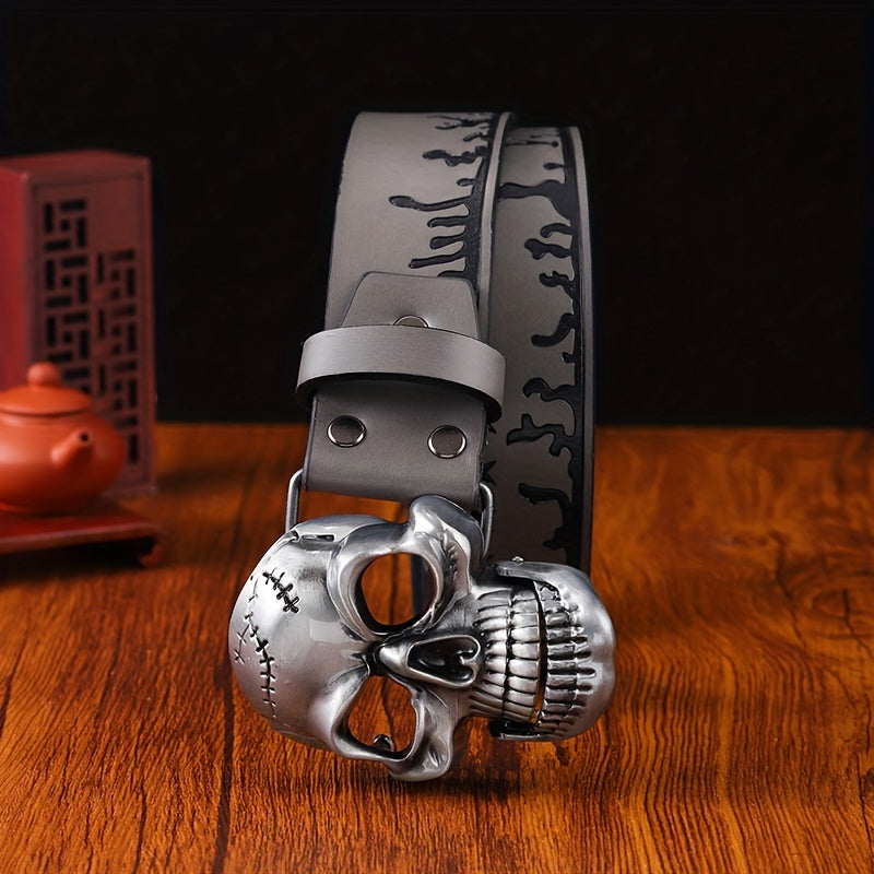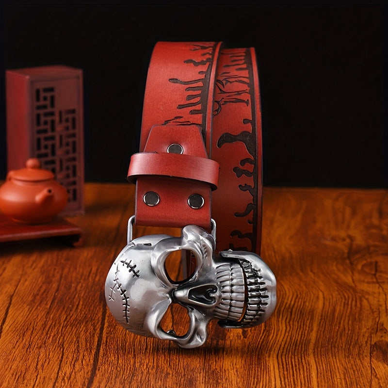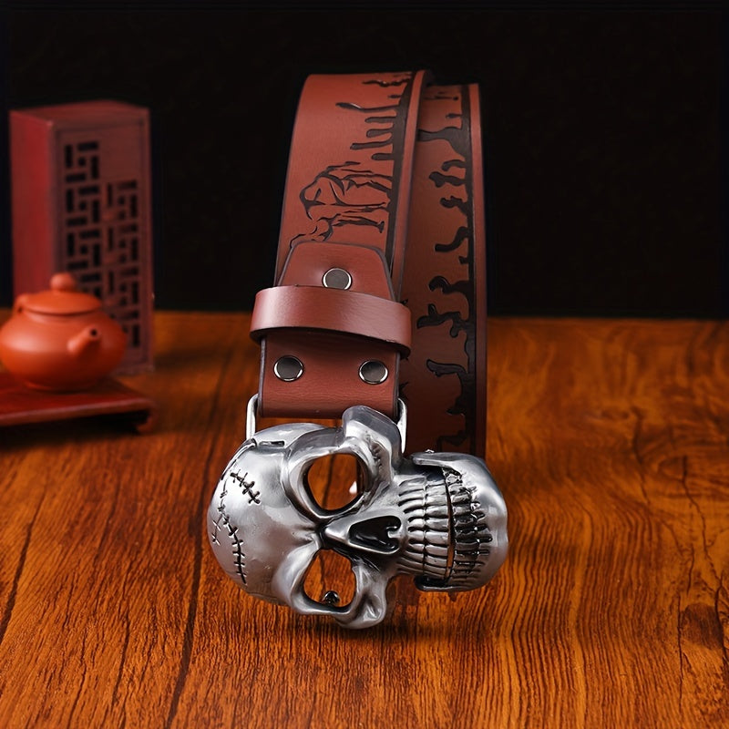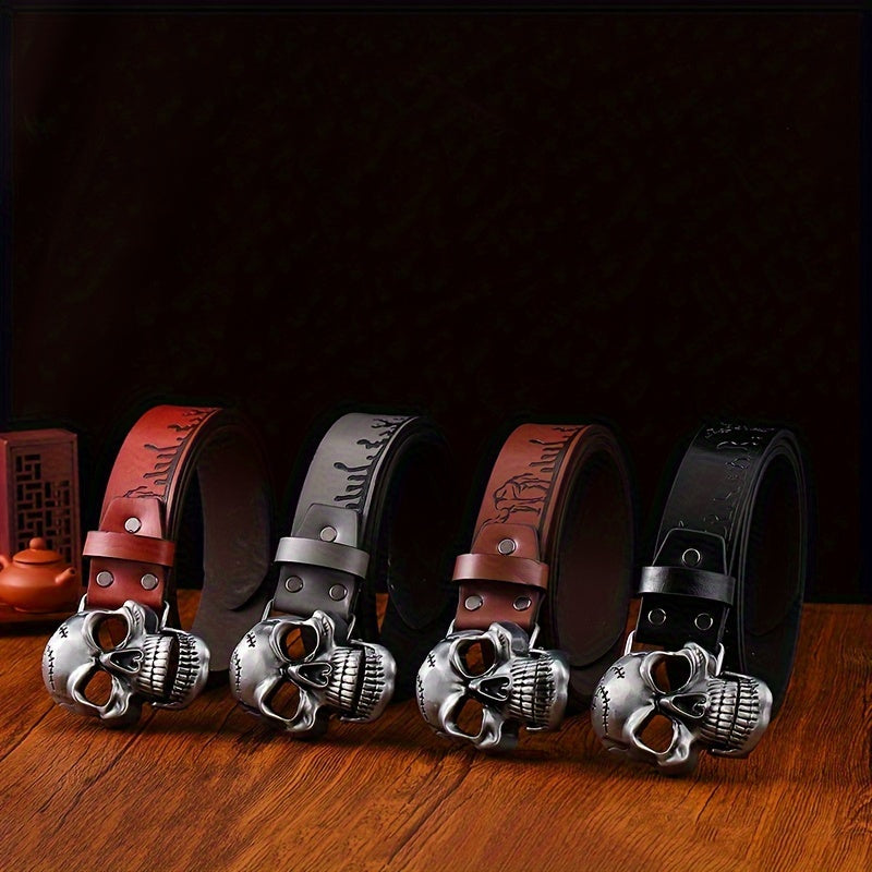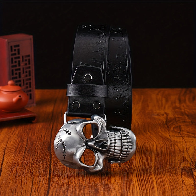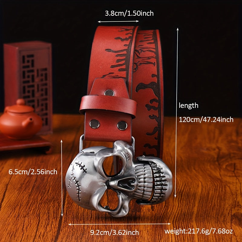 Add a touch of vintage Western cowboy style to your outfit with this stylish embossed faux leather belt. The skull buckle adds an edgy touch to your casual streetwear look.