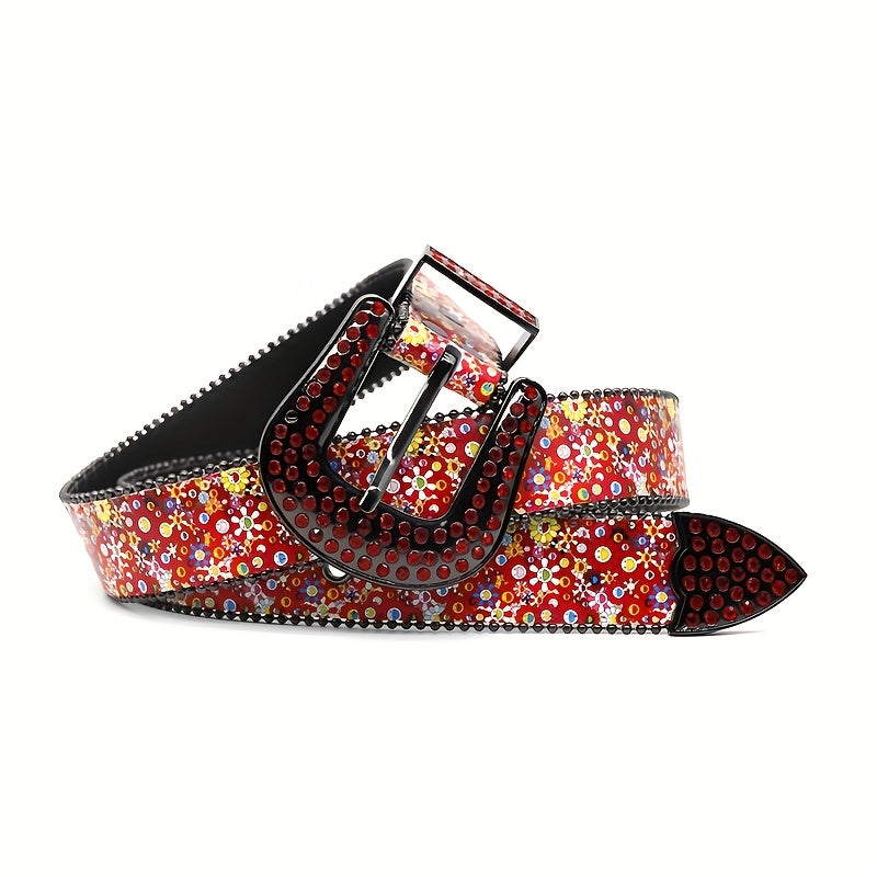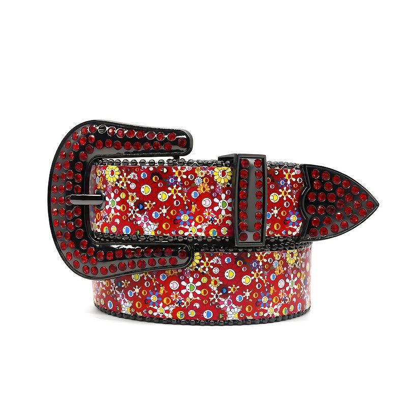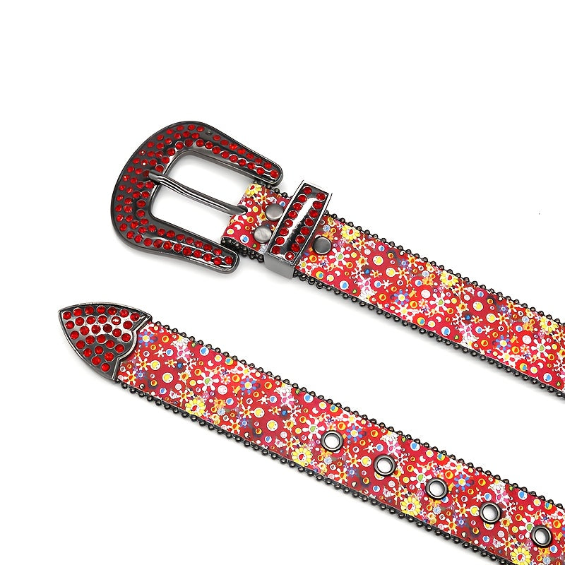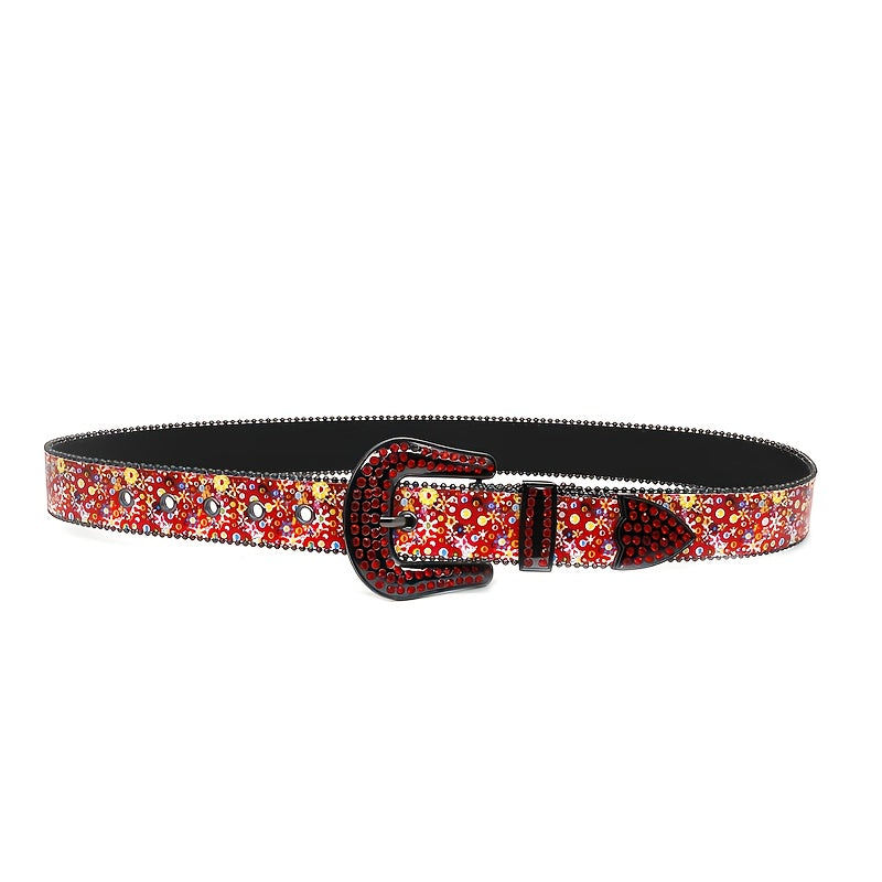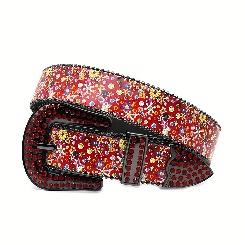 Add a touch of punk flair to your outfit with this red sunflower rhinestone belt. Featuring a sparkling studs carved buckle and floral print faux leather, this belt is perfect for adding a pop of color and style to your jeans or hip hop look.