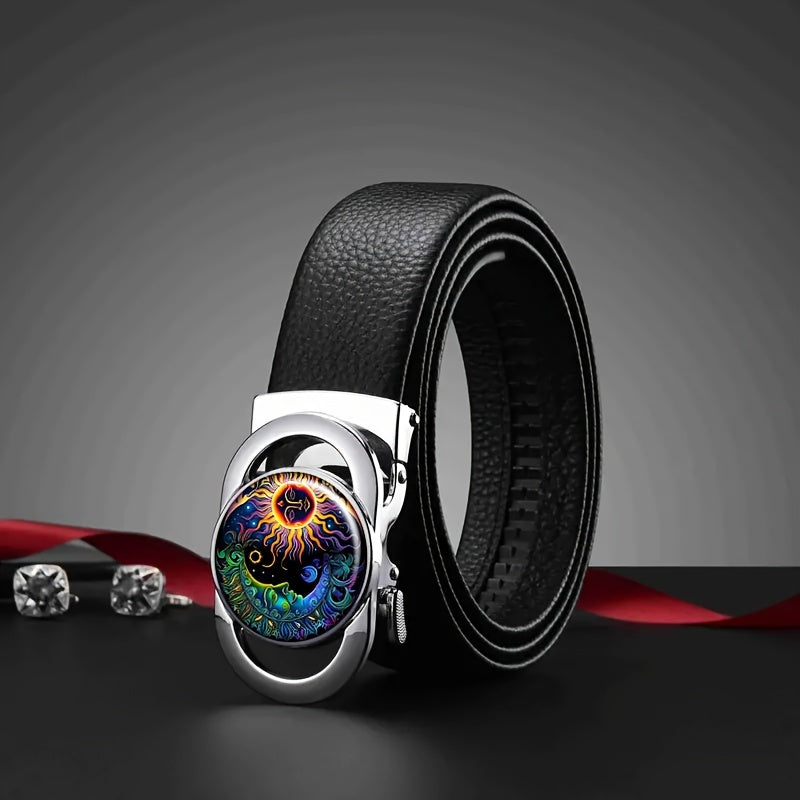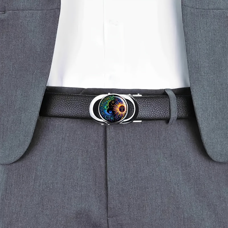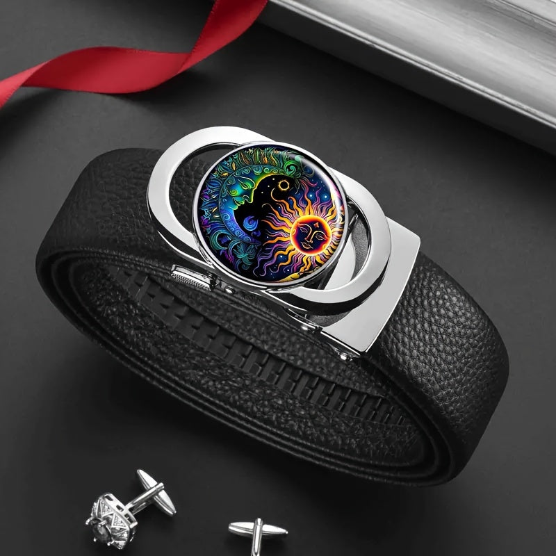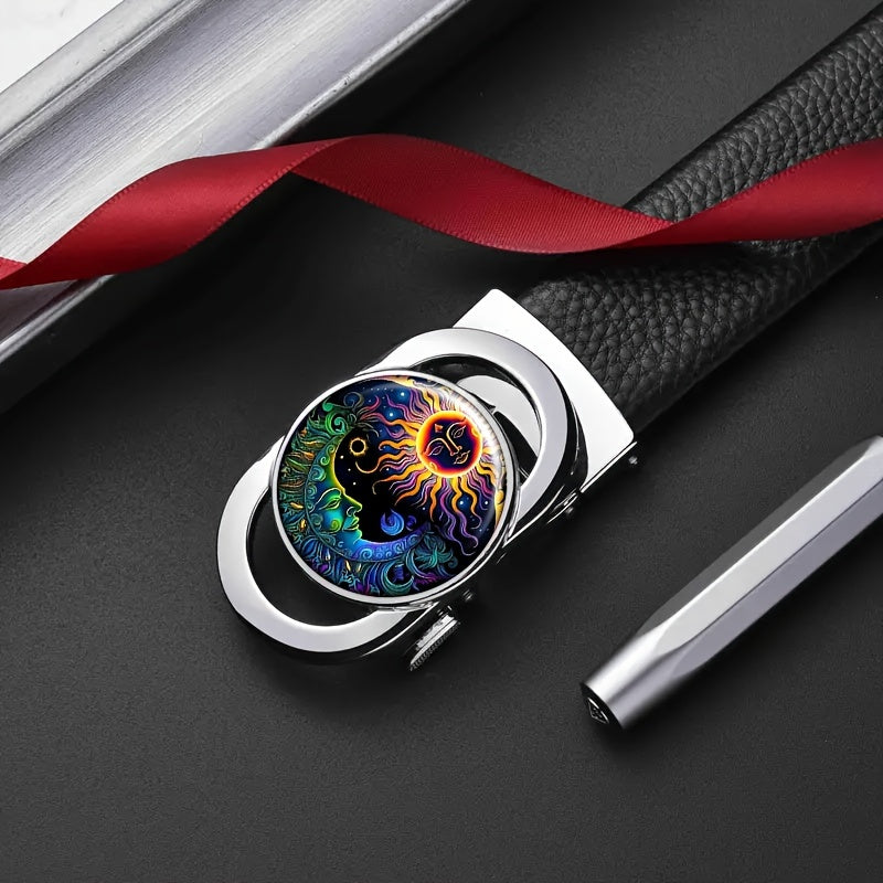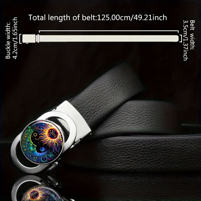 Upgrade your style with this men's adjustable leather belt featuring an automatic buckle with a sun and moon design. Perfect for casual and sporty outfits.