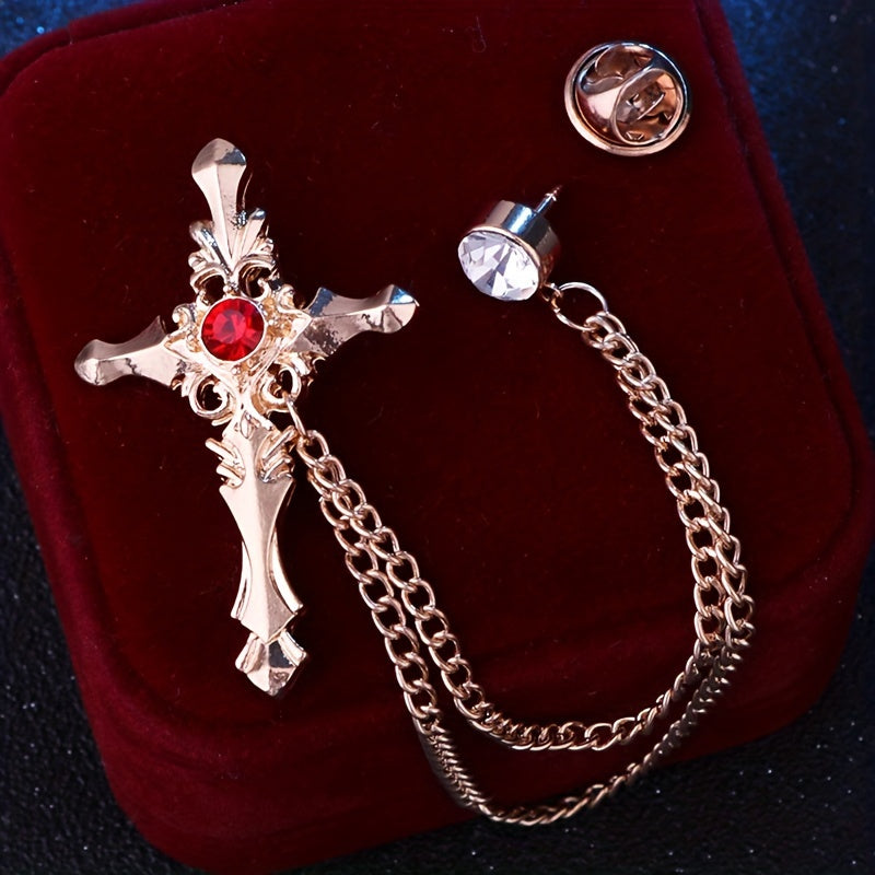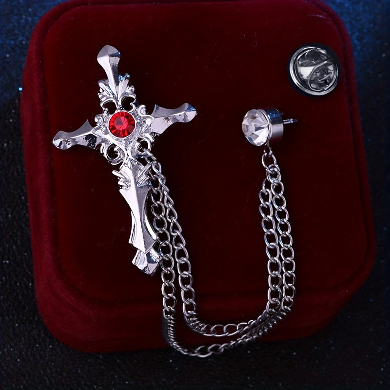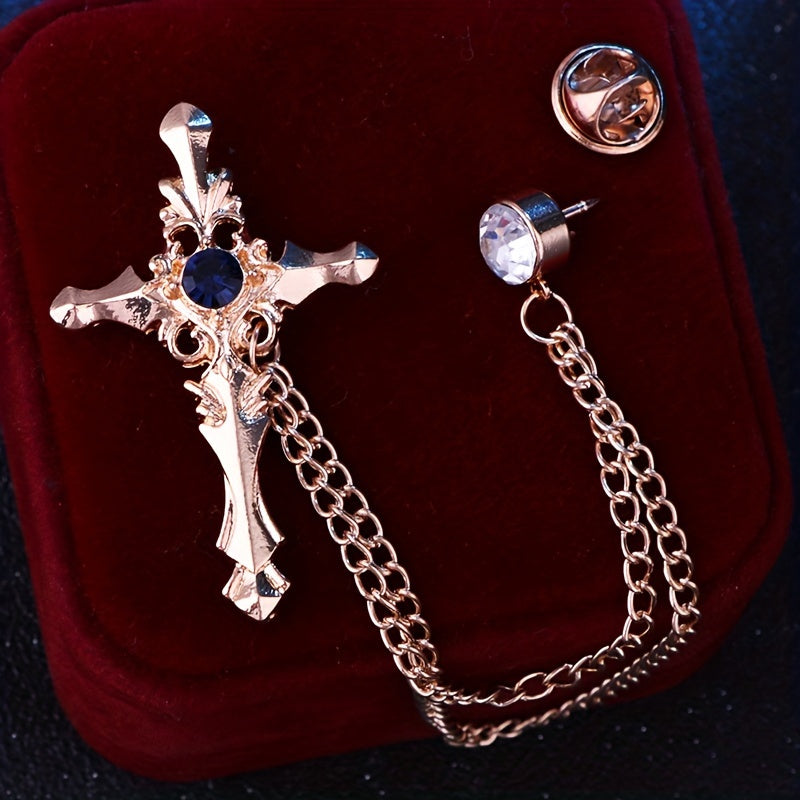 Men's Cross Brooch with Rhinestones & Vintage Chain Tassel