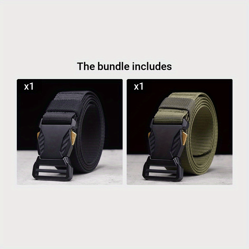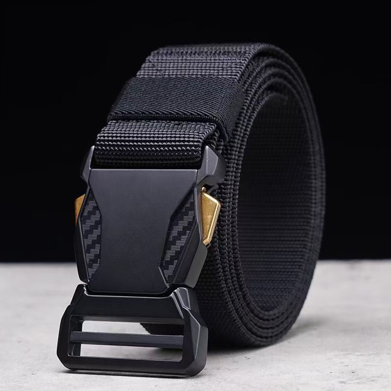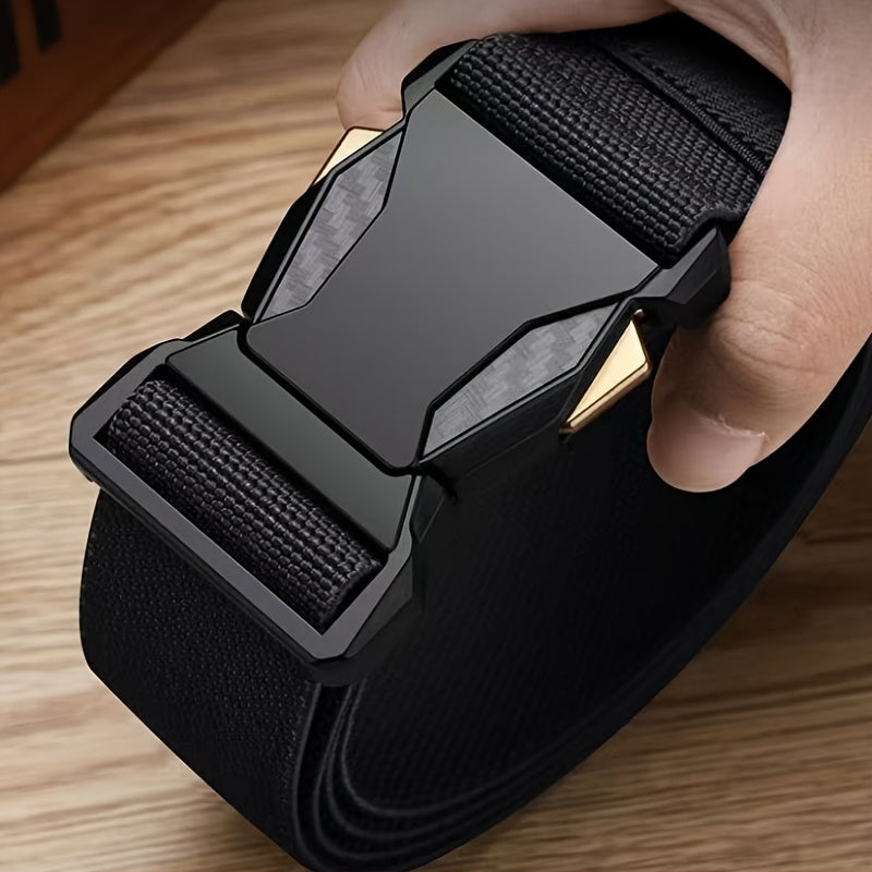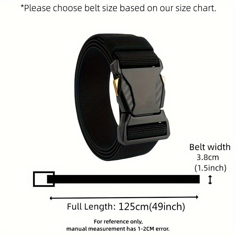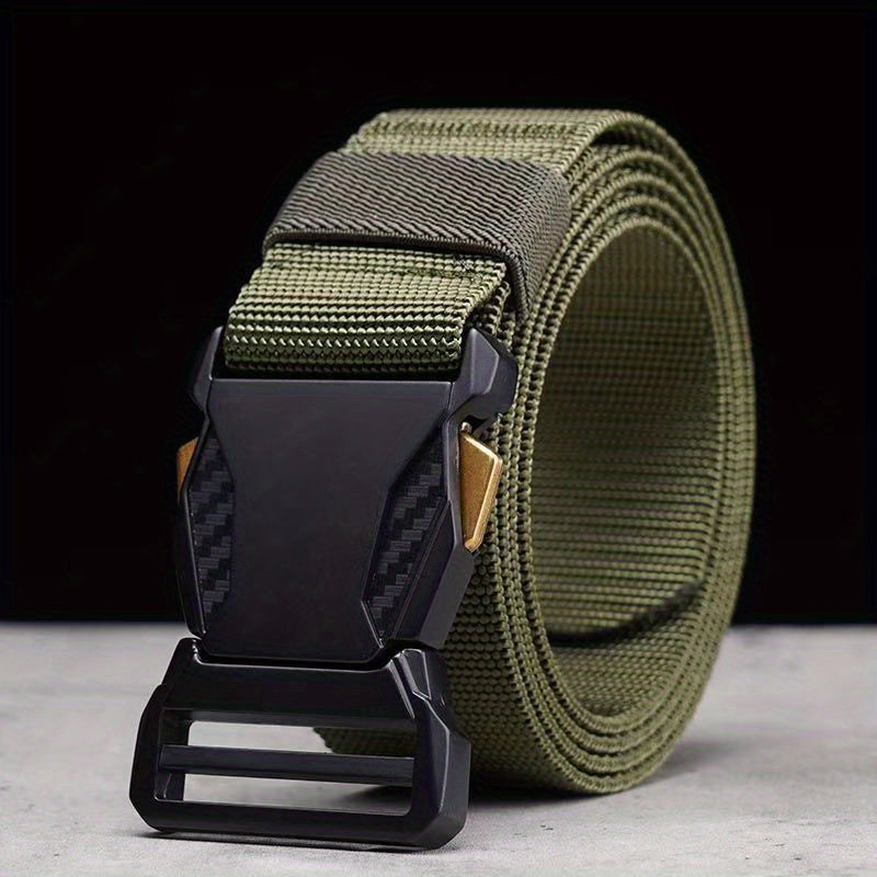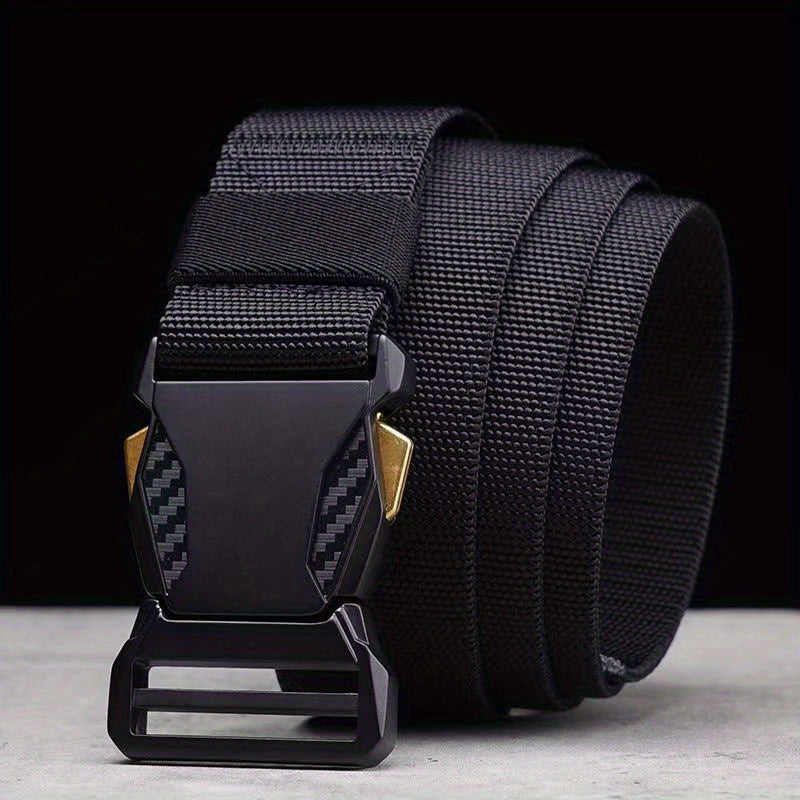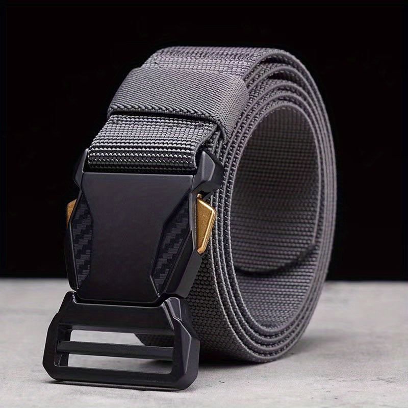 This lightweight men's tactical canvas belt is adjustable and perfect for outdoor travel and casual wear. The belt features a durable plastic buckle and a golden geometric design.