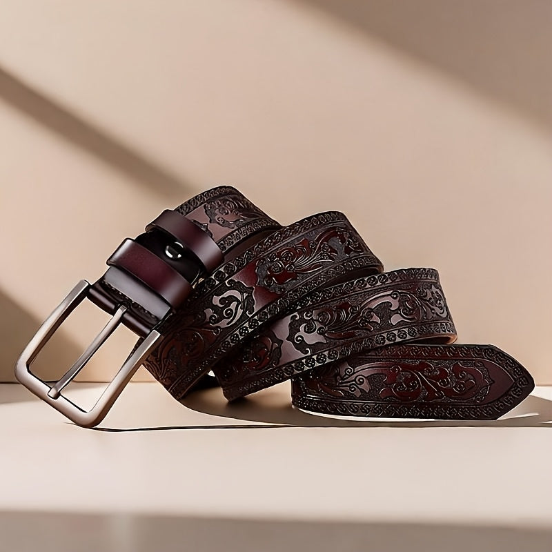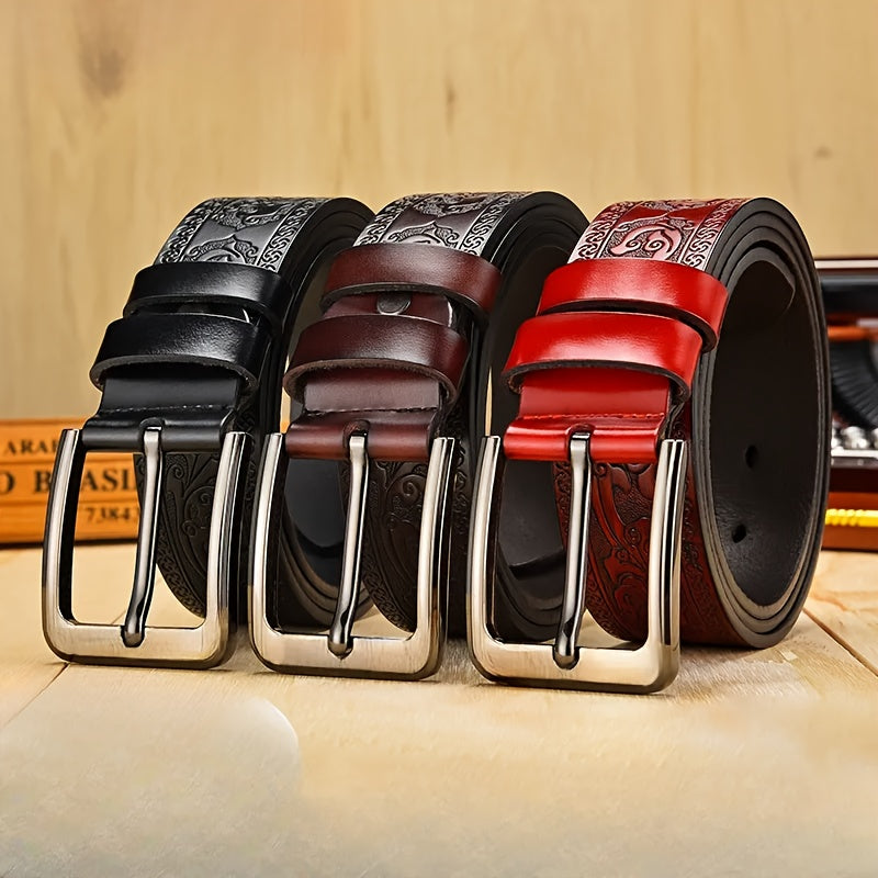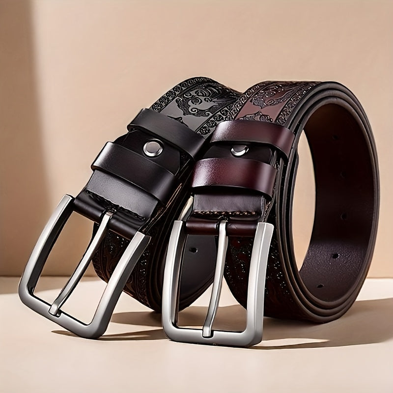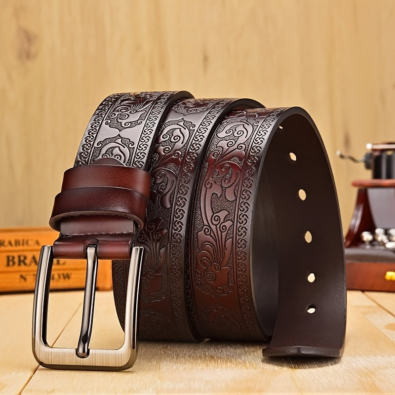 This men's vintage leather belt features an alloy buckle with a carved design. It is perfect for both business and casual wear, making it an ideal gift for a father or husband.