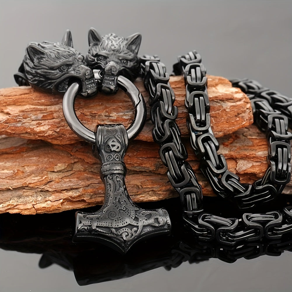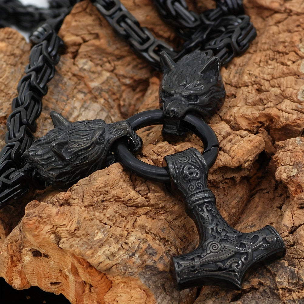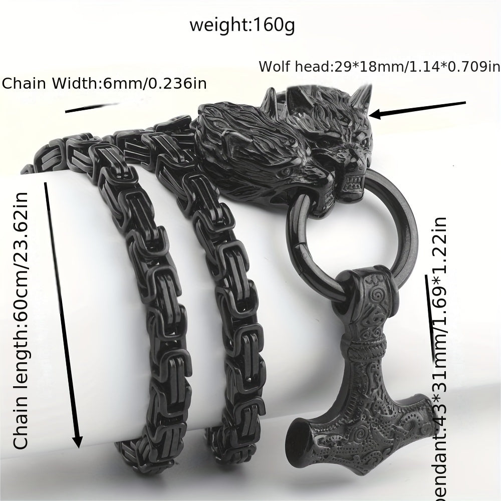 Add a touch of rebellious style to your outfit with this stainless steel hammer pendant necklace featuring a Viking-inspired wolf head totem. Perfect for those who embrace punk rock fashion.