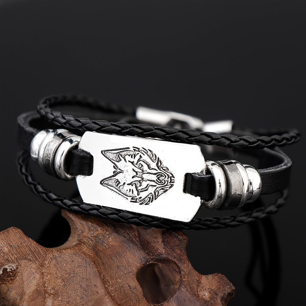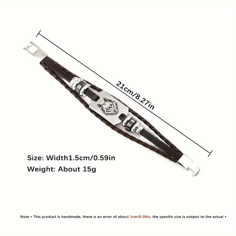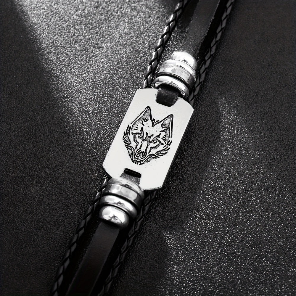 This handcrafted unisex bracelet features a Siberian wolf head emblem and vintage style. Made from faux leather, it is a unique accessory that adds a touch of personality to any outfit.