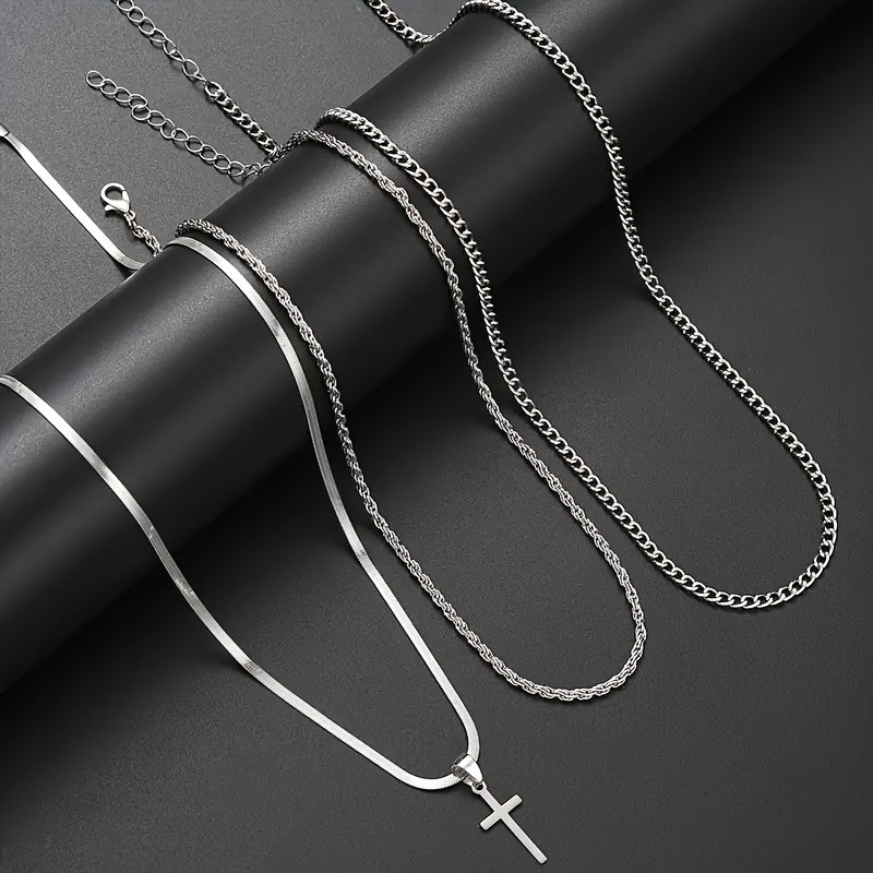 This stainless steel jewelry set features a street style design that is perfect for both men and women. It includes a stylish cross pen that adds a unique touch to your outfit.