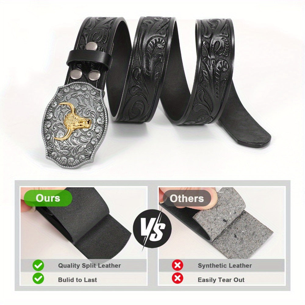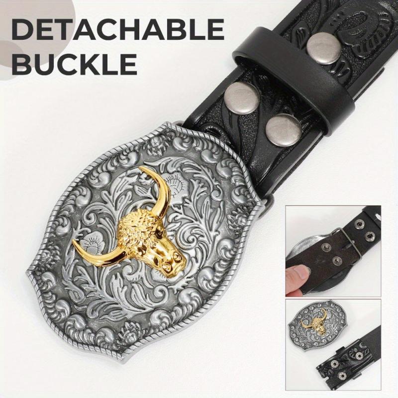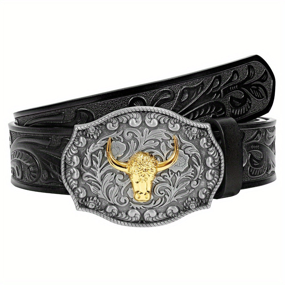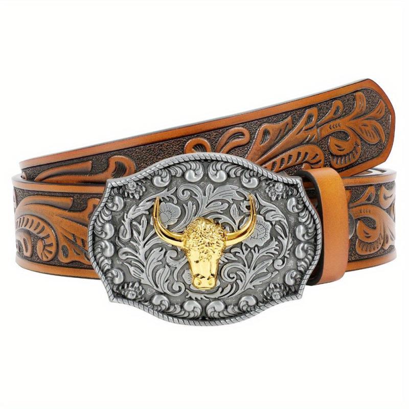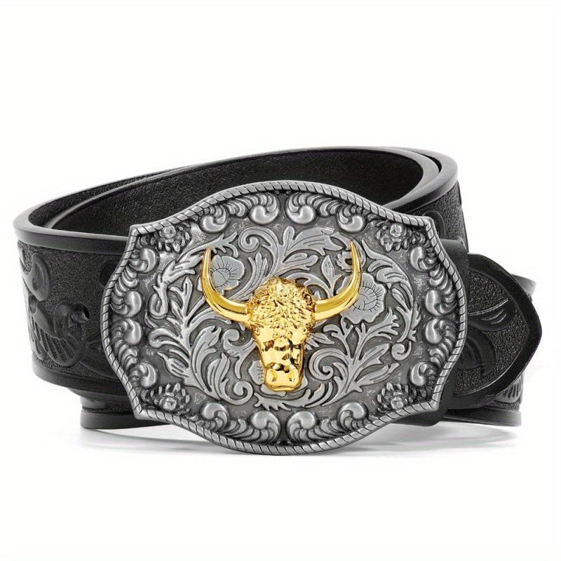 This WHIPPY cowboy belt features a vintage Western design with a faux leather strap and a golden tone bull head buckle. Perfect for casual or Western-inspired outfits.