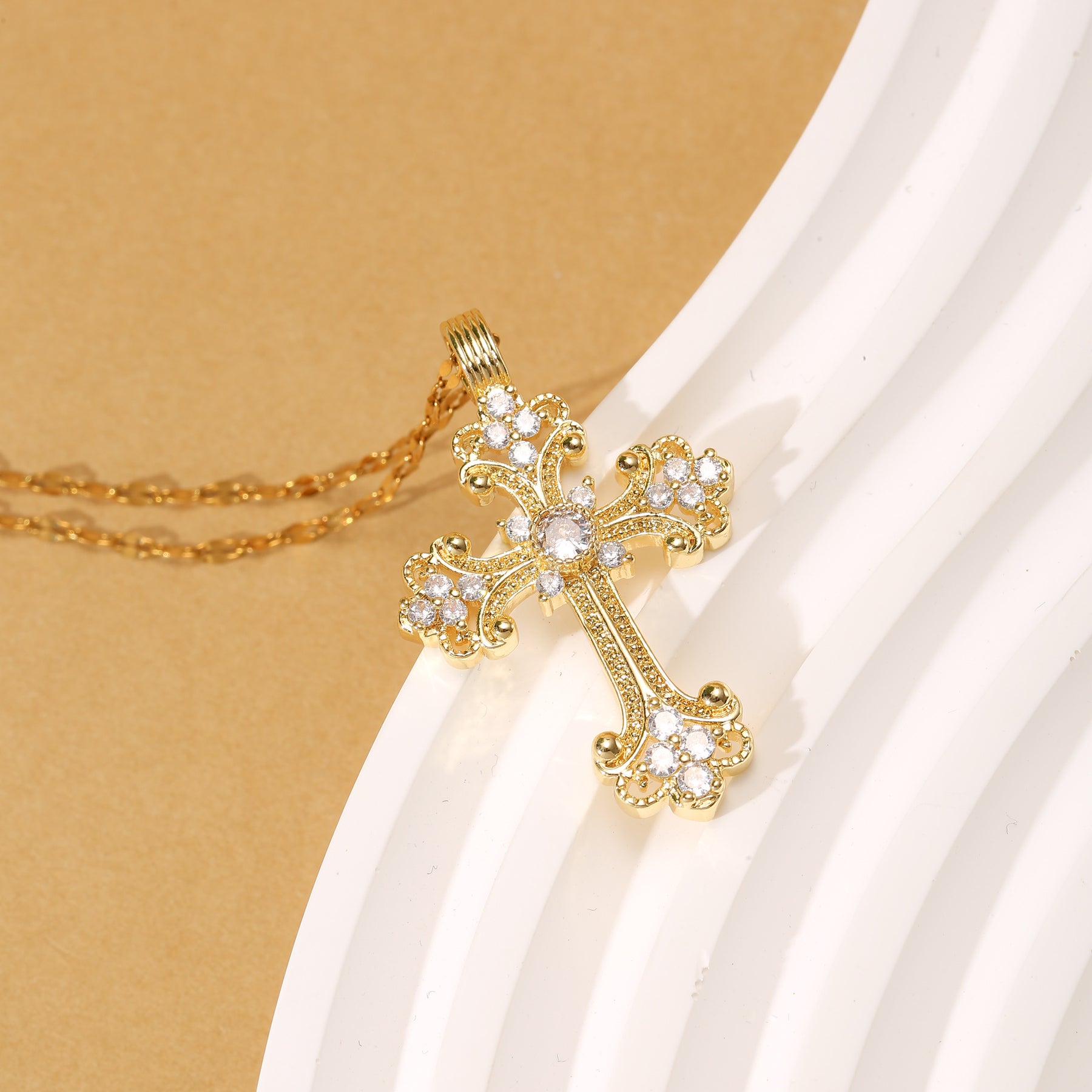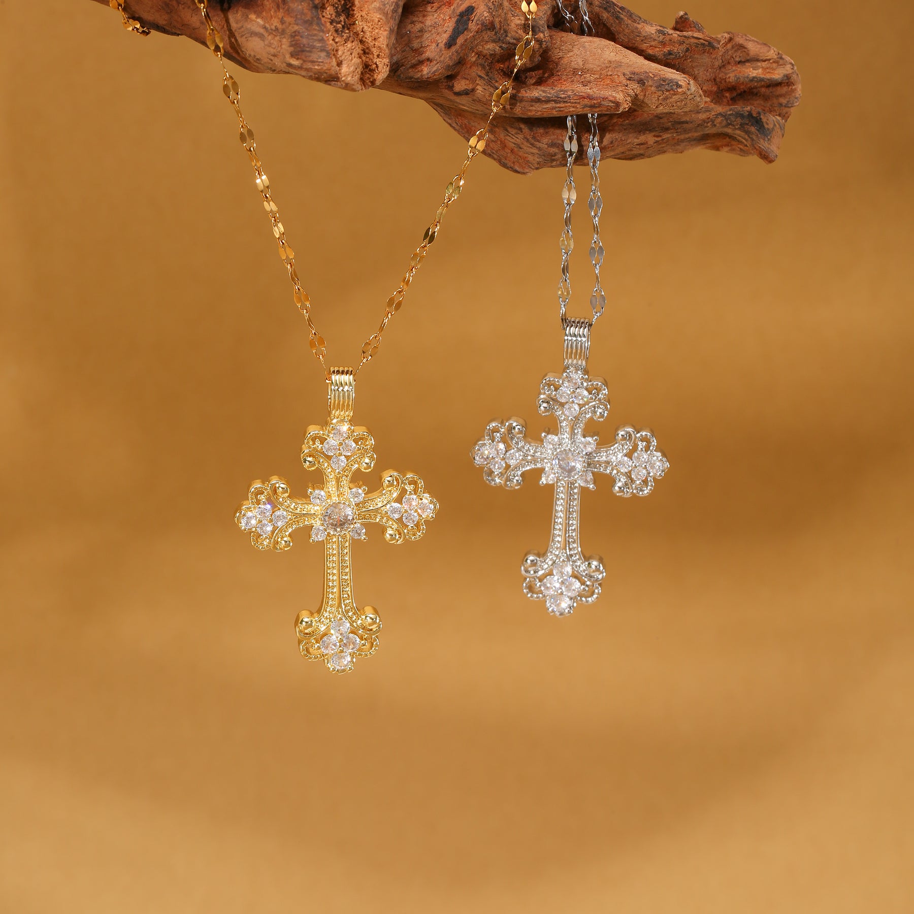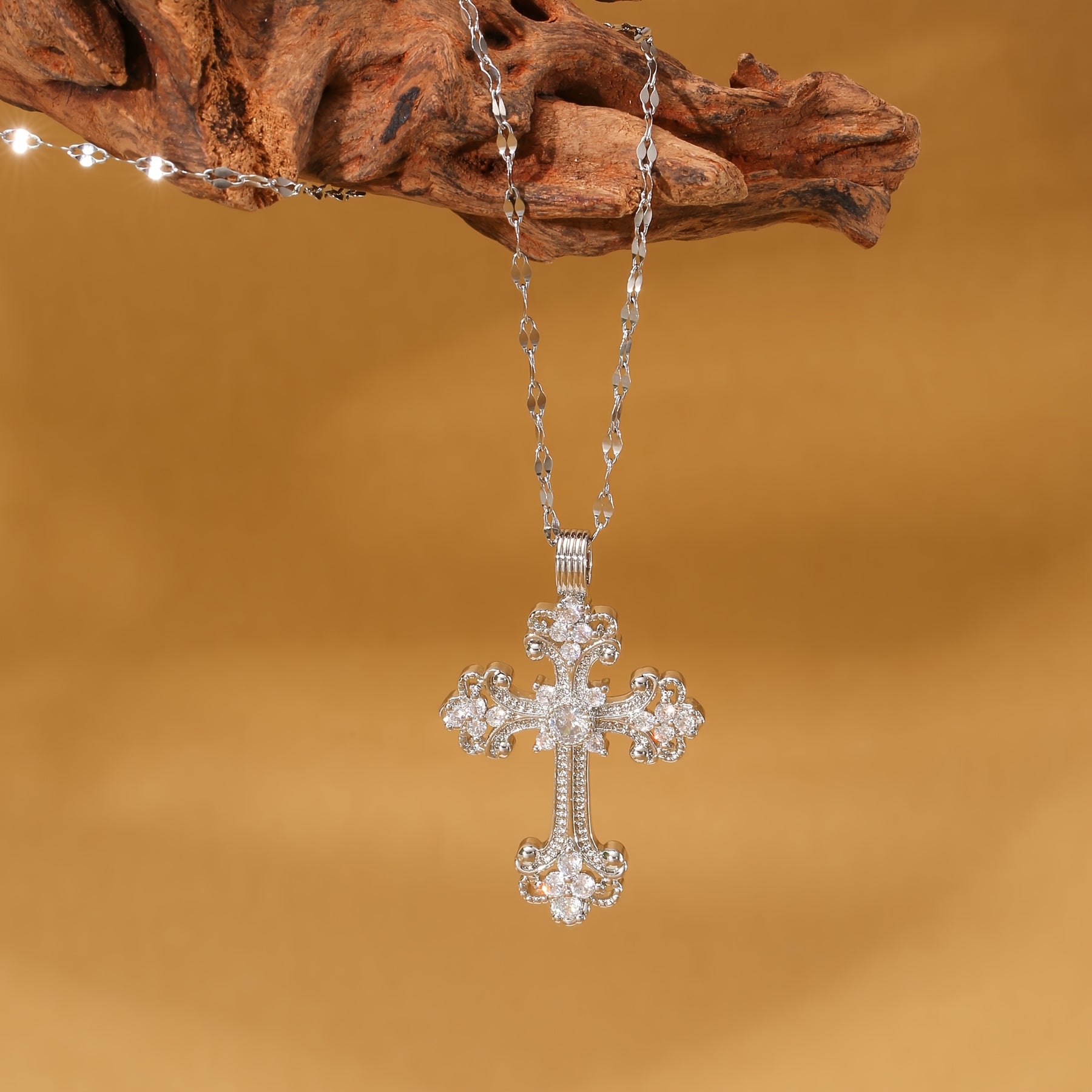 Enhance your style with this stunning vintage cross necklace featuring 4 cubic zirconia stones. The low allergy stainless steel chain is 45 inches long, making it perfect for parties and formal events.