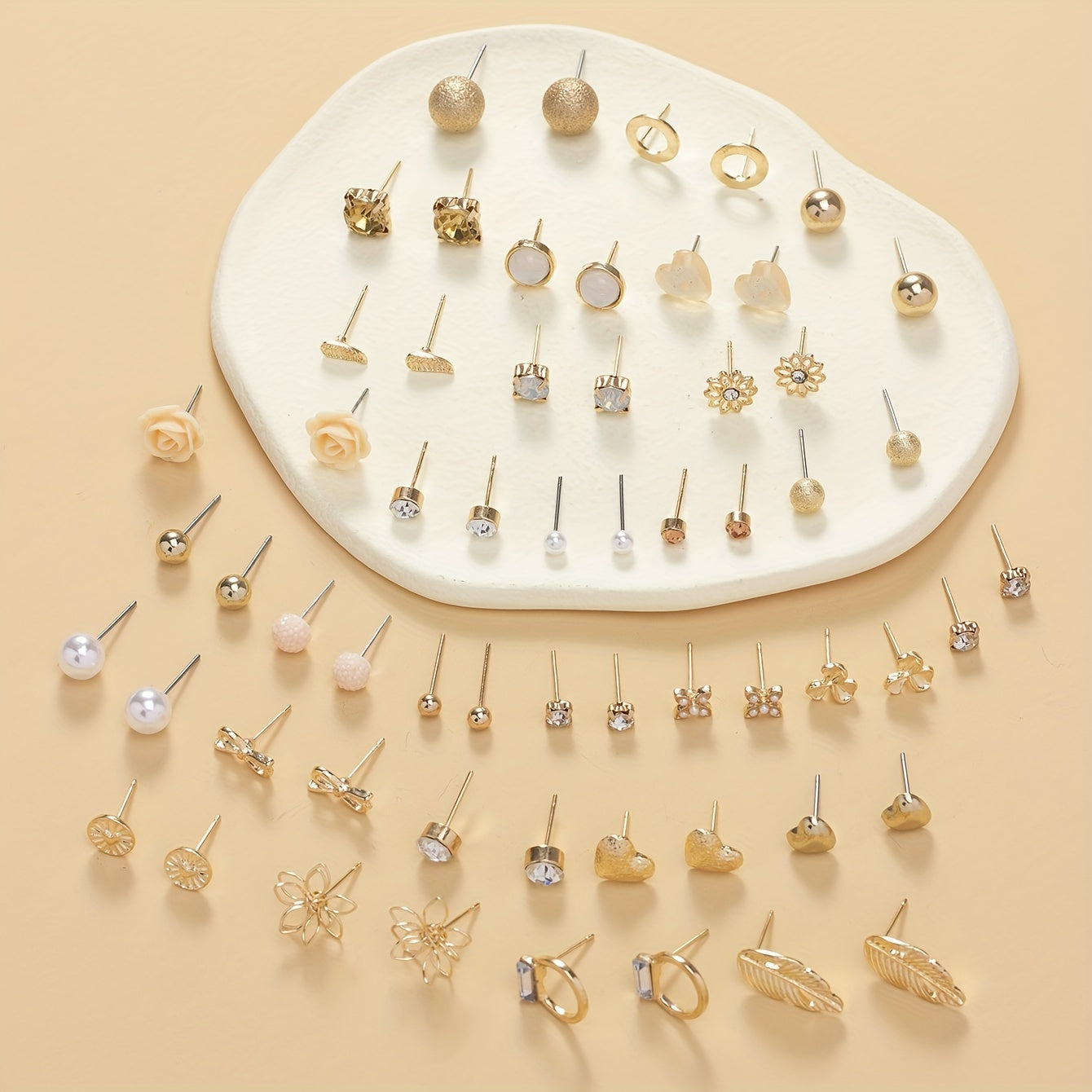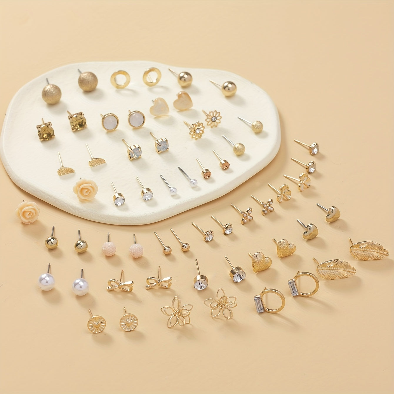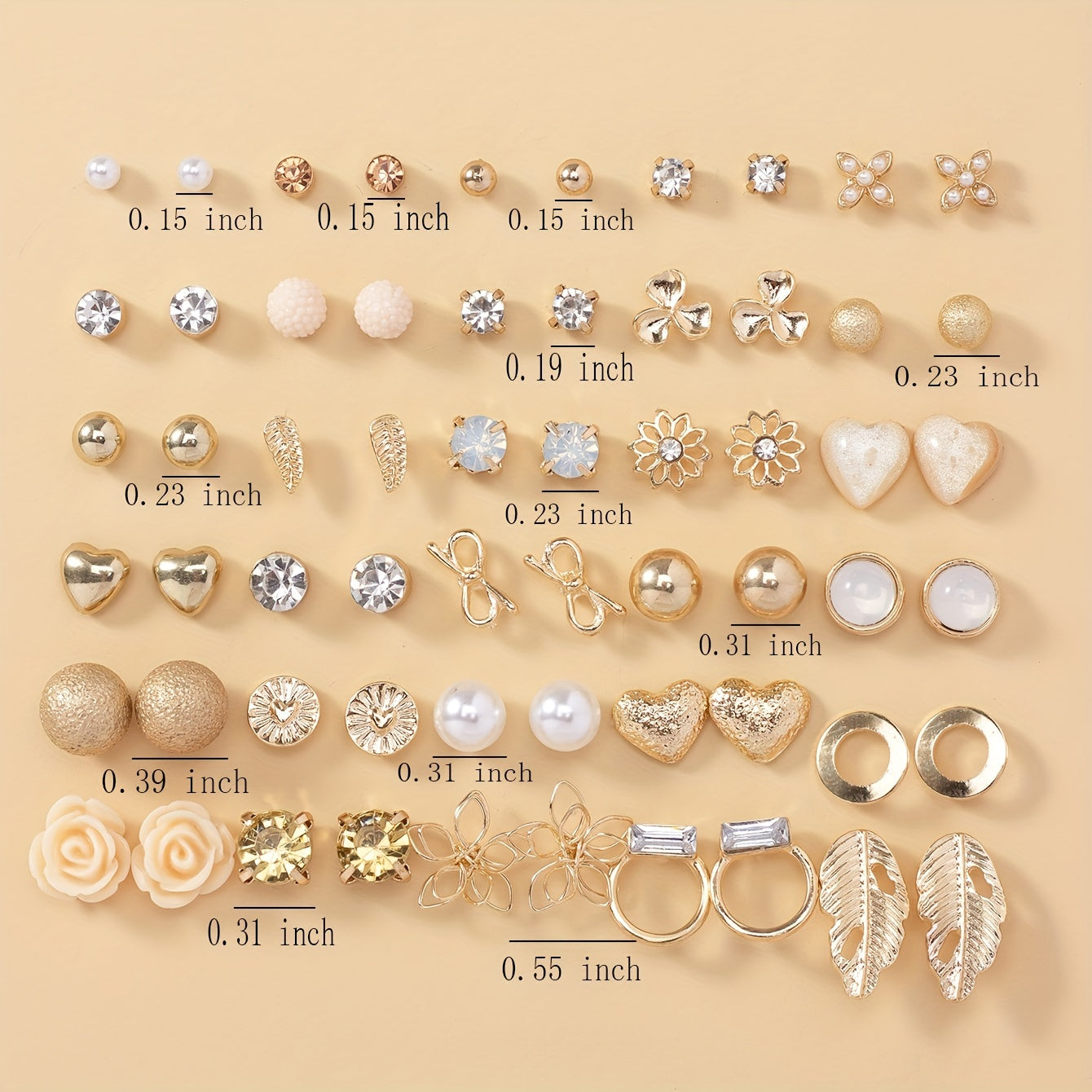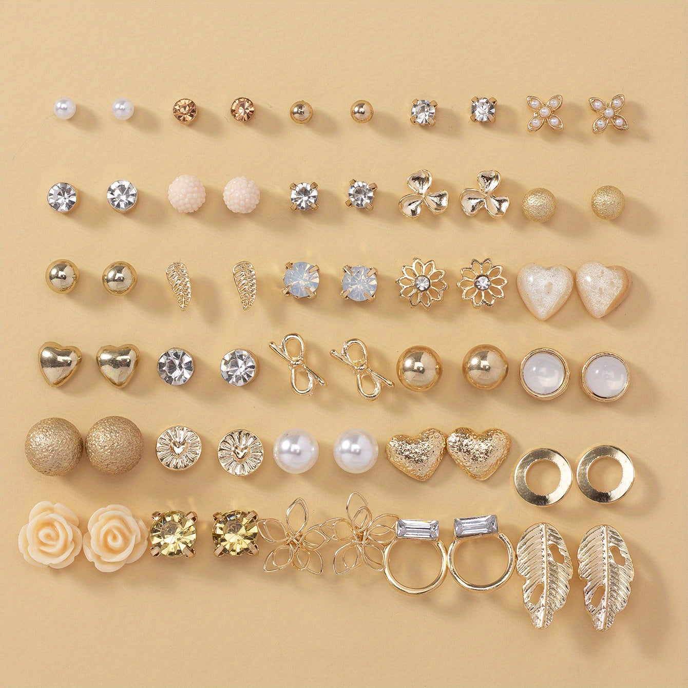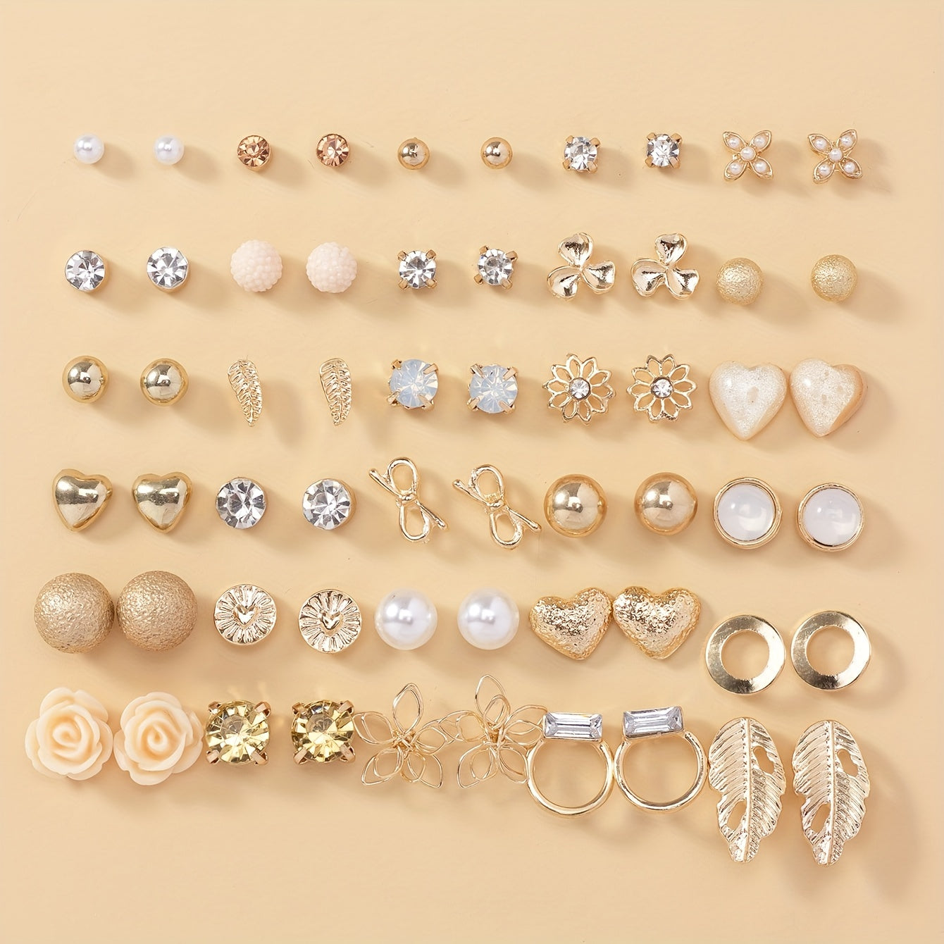 This set includes 30 pairs of stainless steel stud earrings featuring leaf, butterfly, heart, rhinestone, and flower designs. Perfect for everyday wear or special occasions.