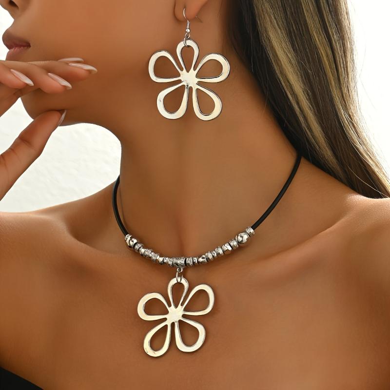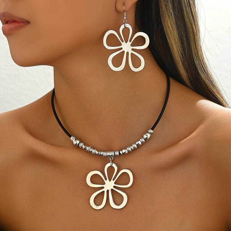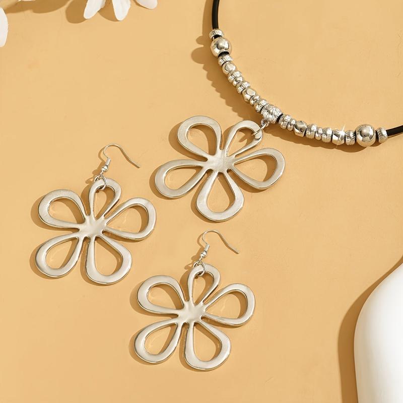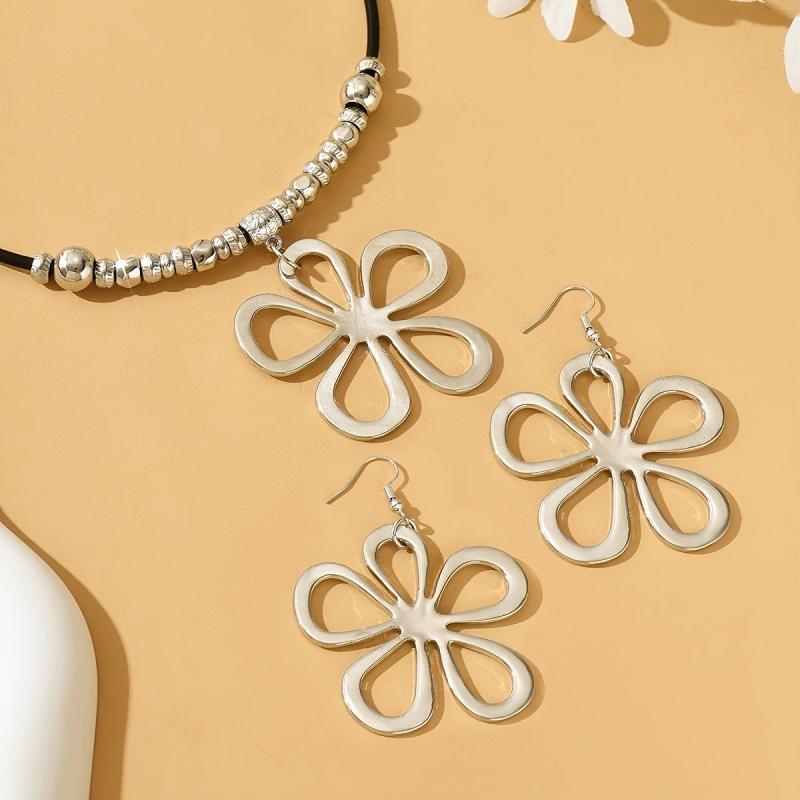 Complete your daily outfits with this versatile jewelry set featuring a rope necklace with a geometric hollow flower pendant and matching dangle earrings. Perfect for any occasion.