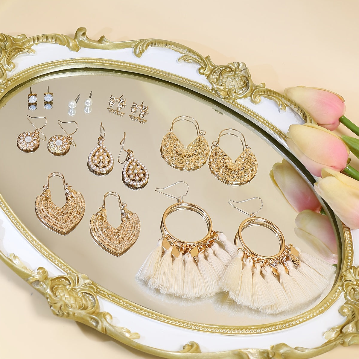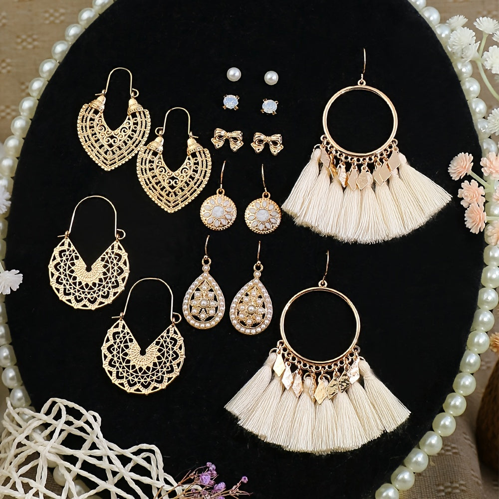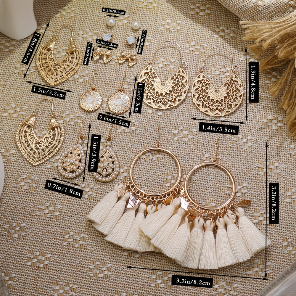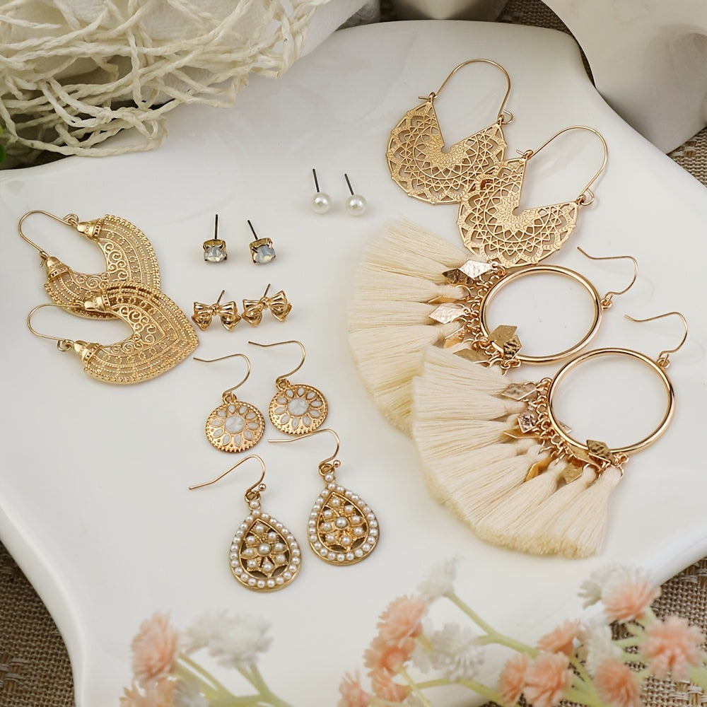 This set includes 8 pairs of stud earrings in various designs. The earrings feature water drop, round, U shape, tassel, bow, pearl, and rhinestone accents. Perfect for adding a touch of elegance to any outfit.