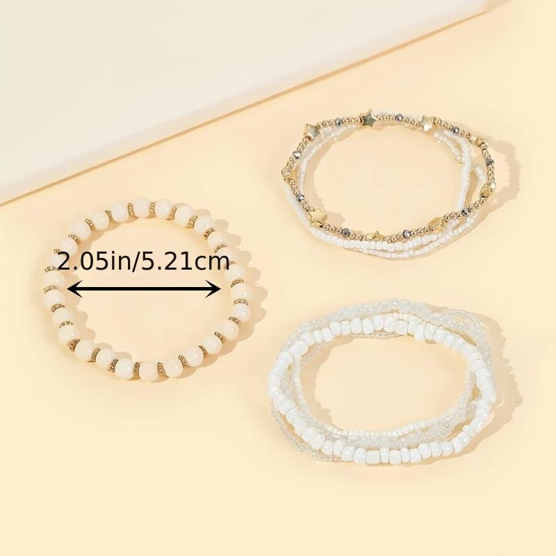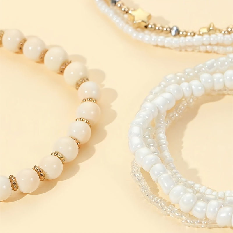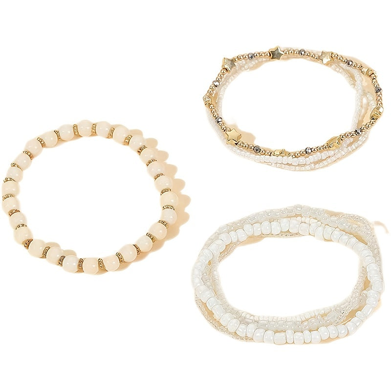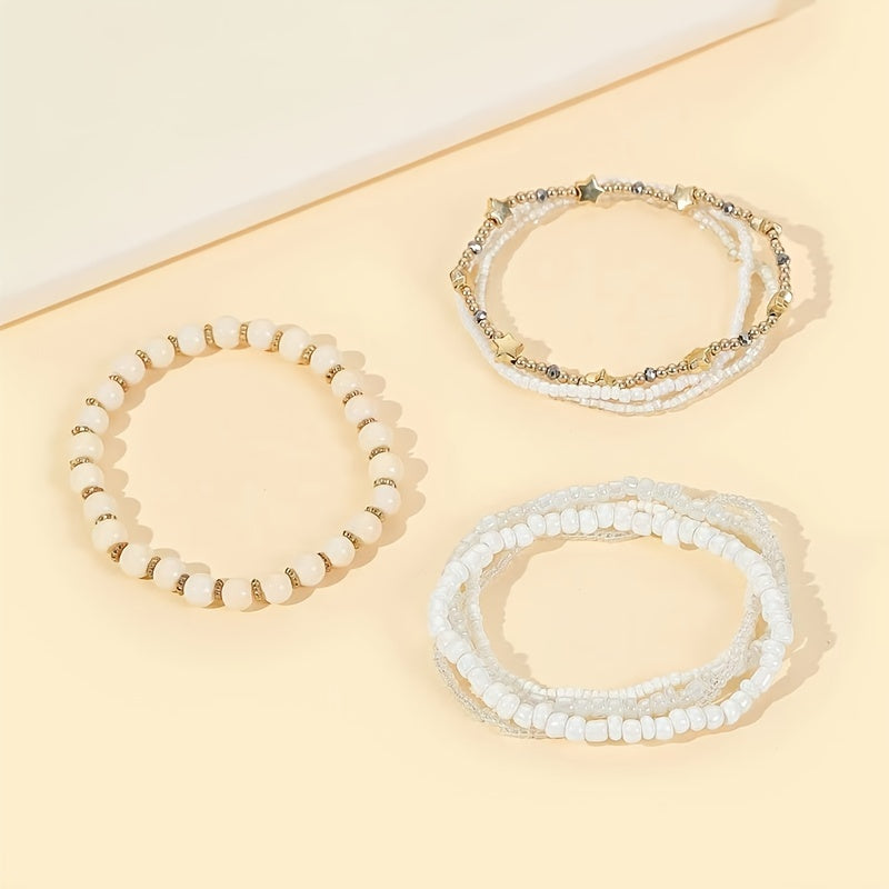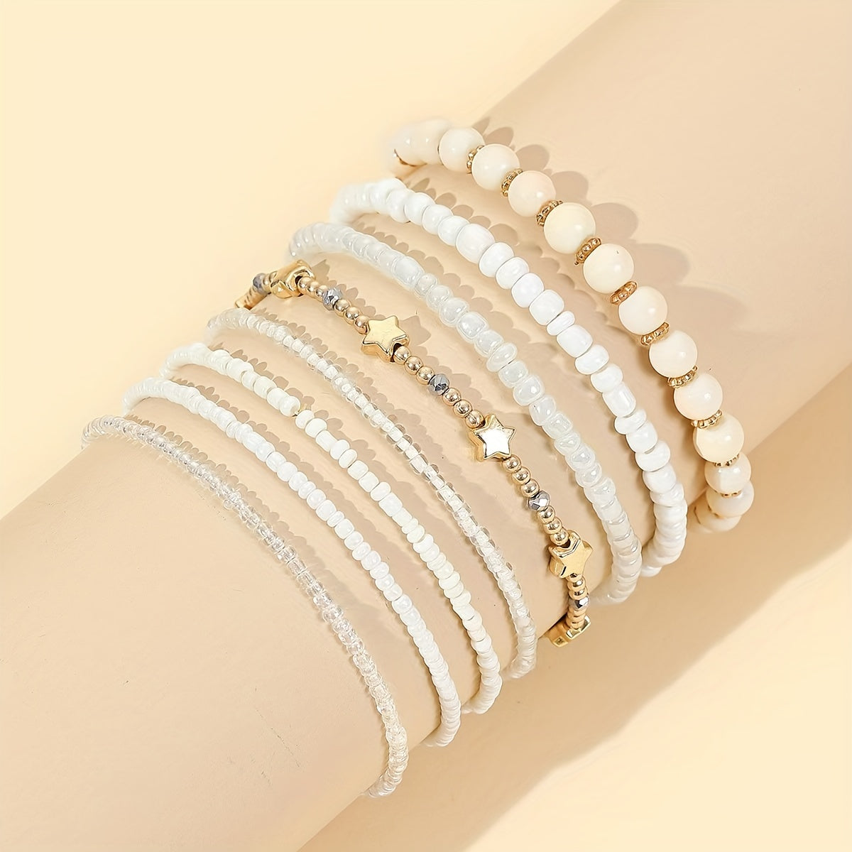 This set includes 8 beaded bracelets with star-shaped glass beads. Perfect for stacking and adding a touch of sparkle to any outfit.