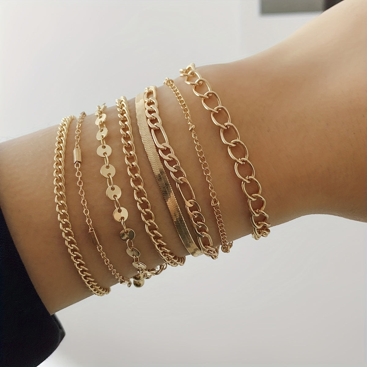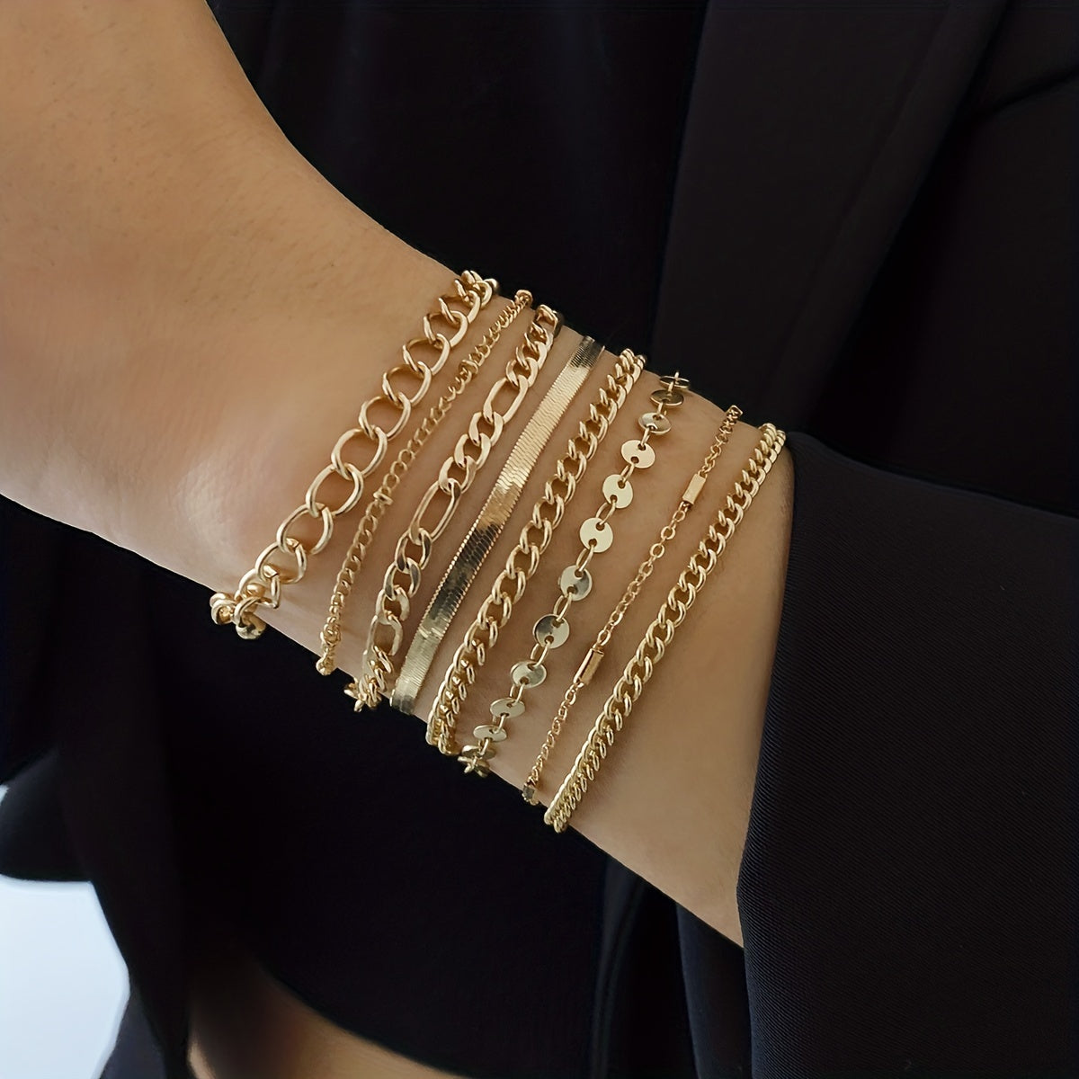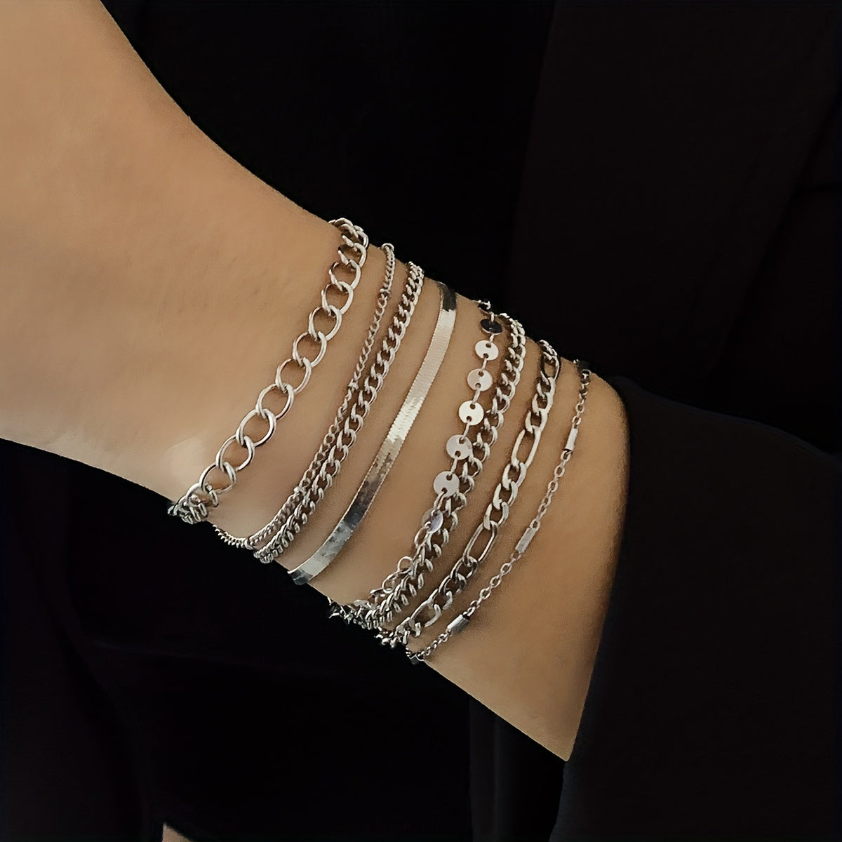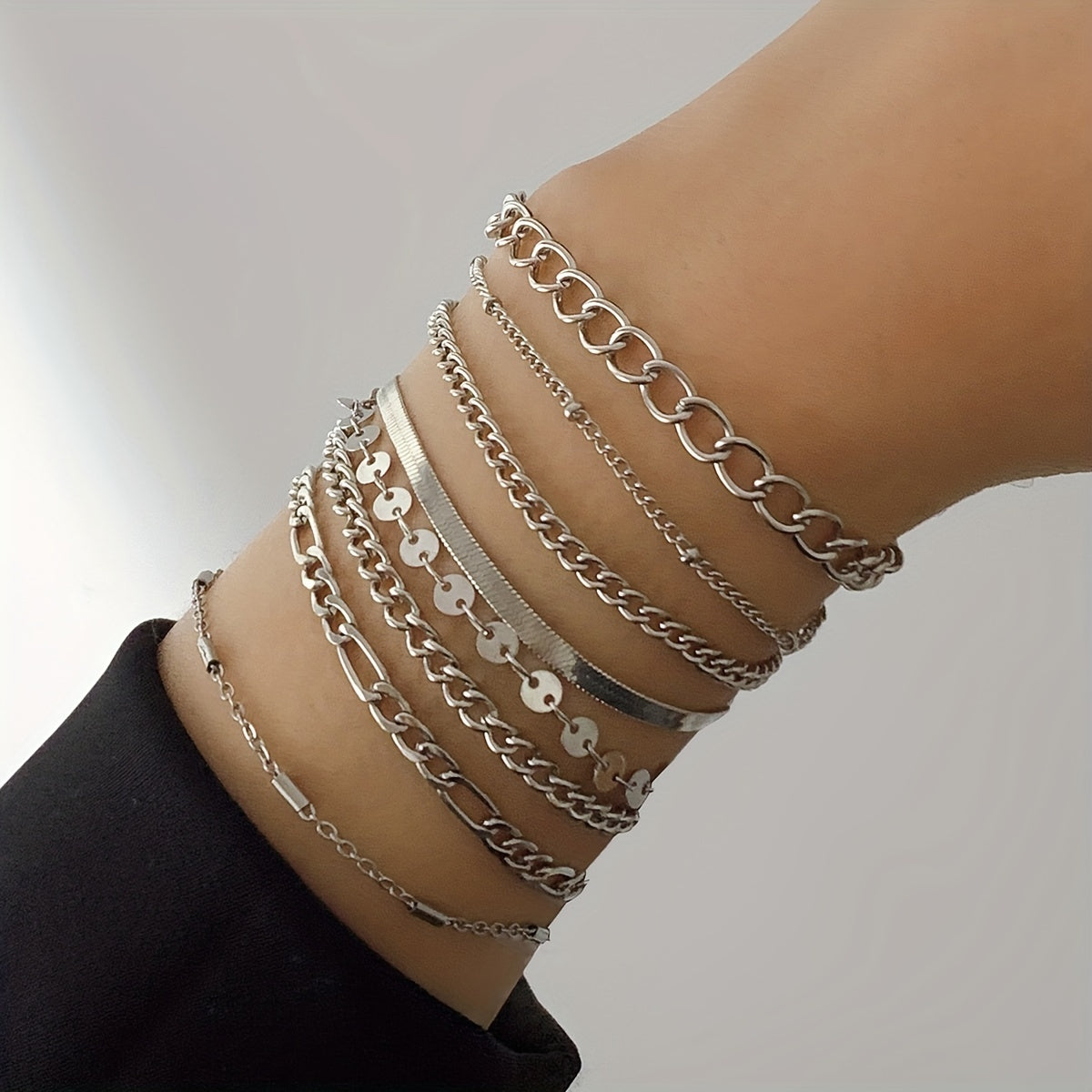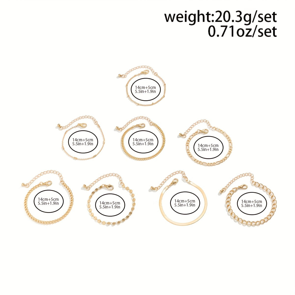 Elevate your style with this set of 8 geometric alloy metal chain bracelets. Each bracelet is adjustable to fit various wrist sizes.