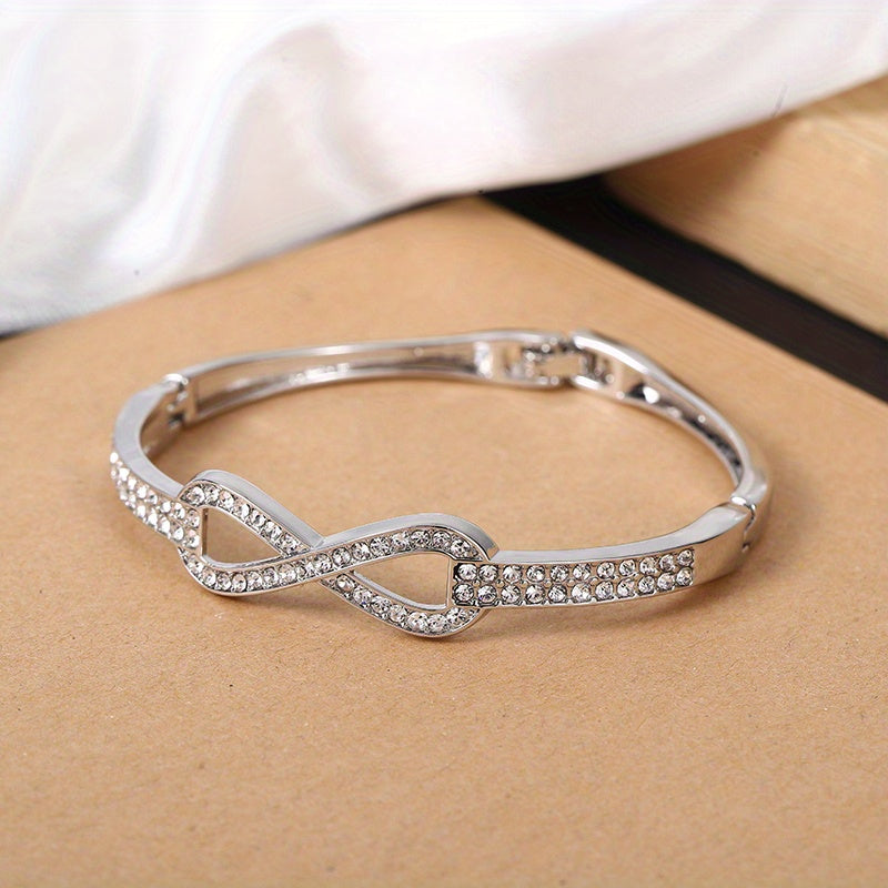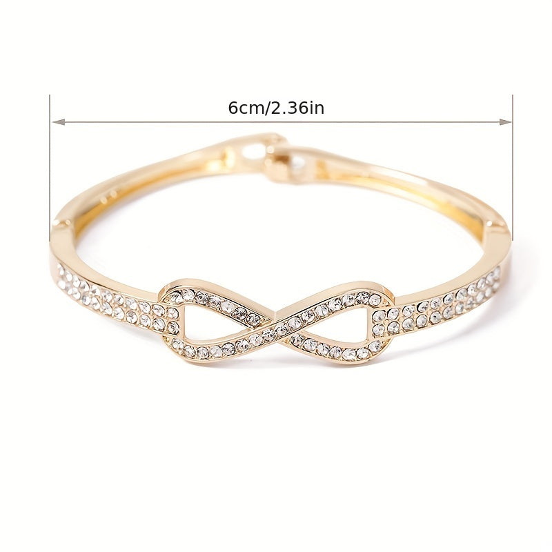 This stunning 8 shaped cuff bangle bracelet features inlaid synthetic gems, making it a versatile piece of jewelry that can be worn with any outfit. It adds a touch of elegance and sparkle to your look.