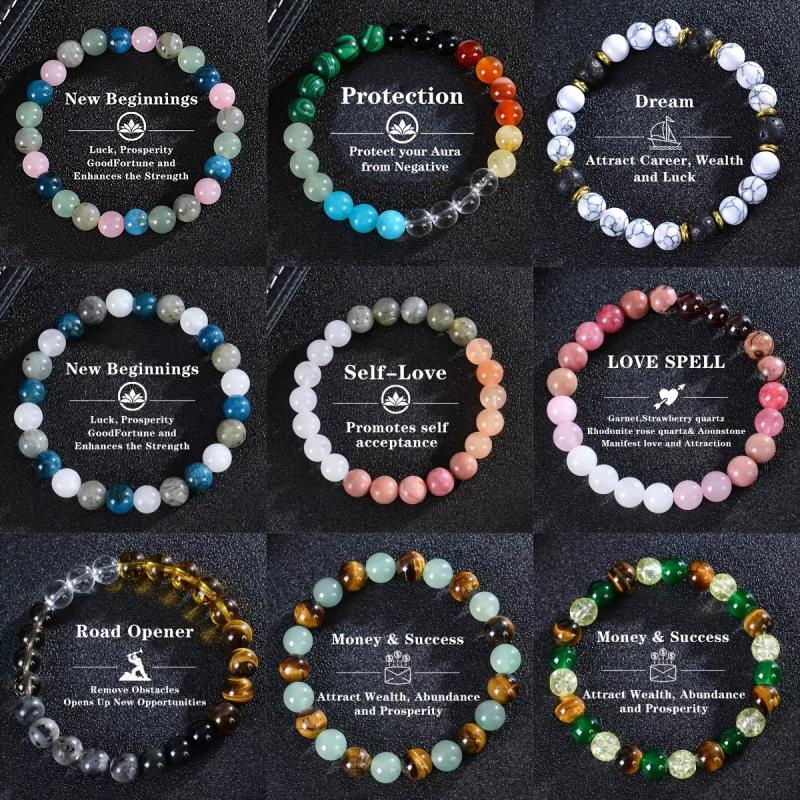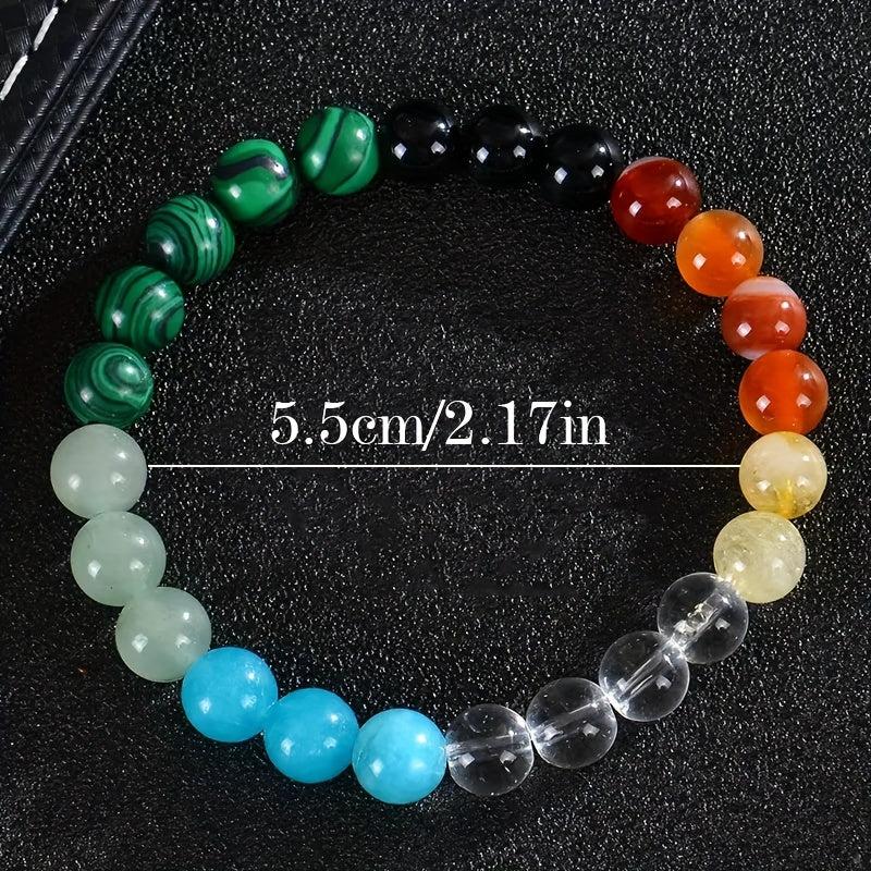 Elevate your everyday style with this set of 9 multicolored natural stone elastic bracelets. Featuring phosphosiderite, rhodochrosite, and labradorite, these bracelets add a touch of color and elegance to any outfit.