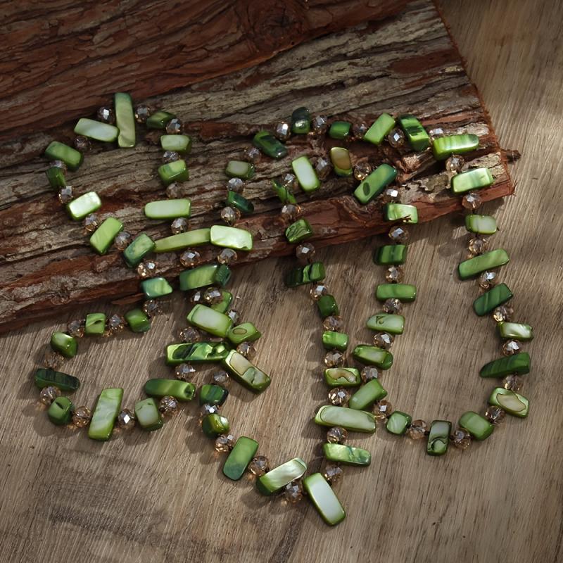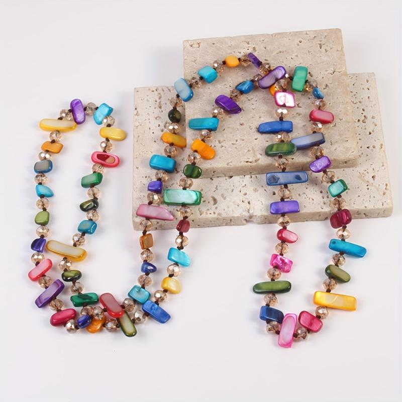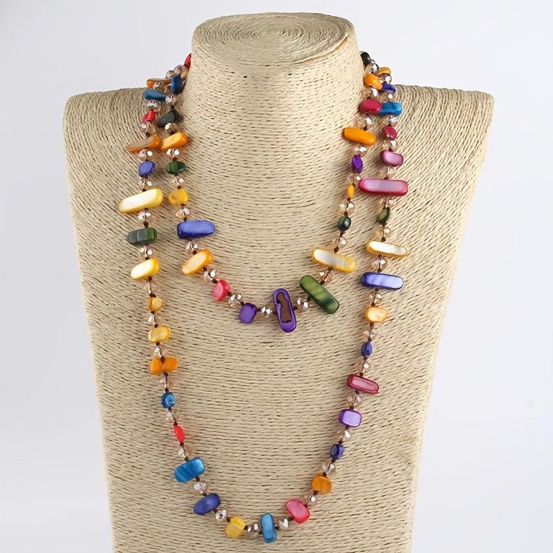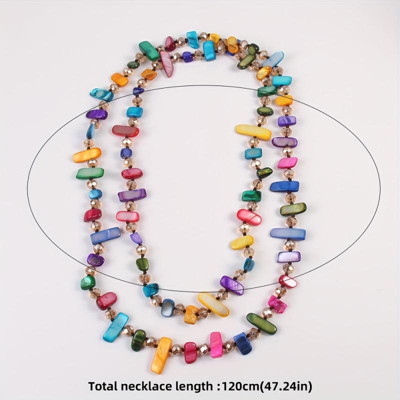 Add a touch of ocean wave vibes with this stylish and creative long necklace featuring colorful shells and glass layers. Perfect for adding a pop of color to your outfit.