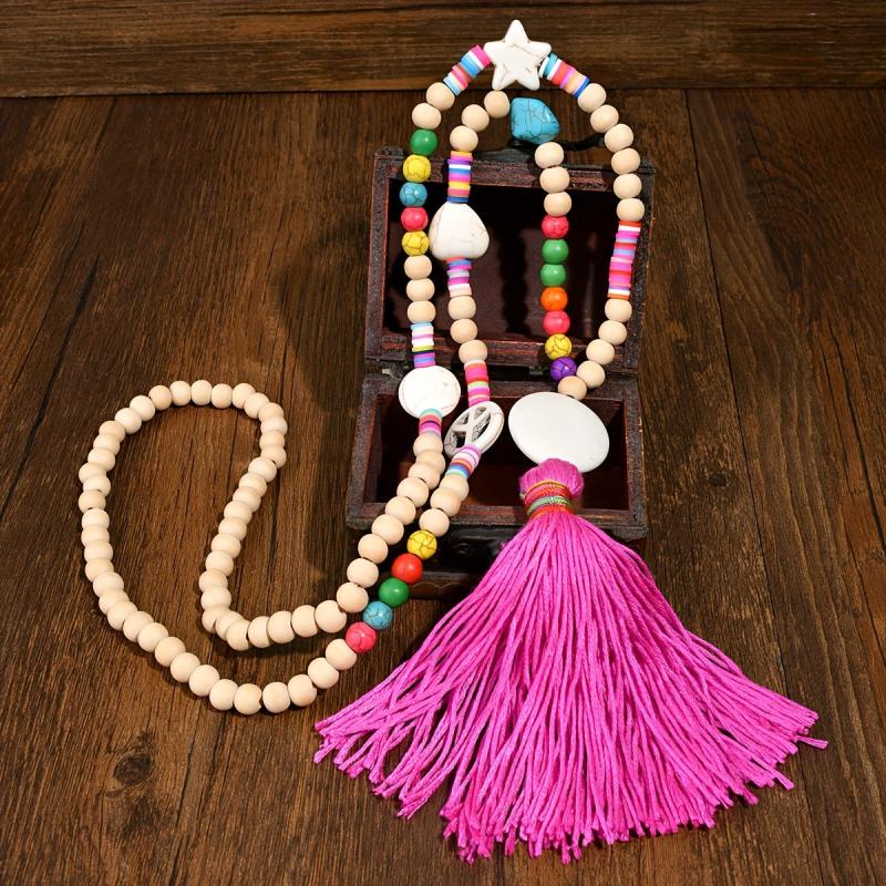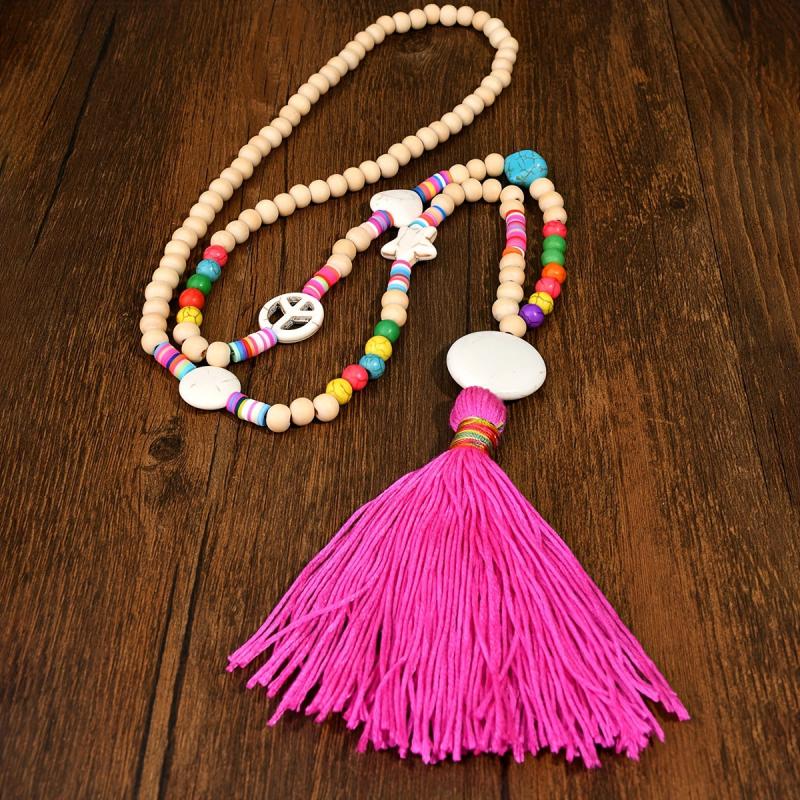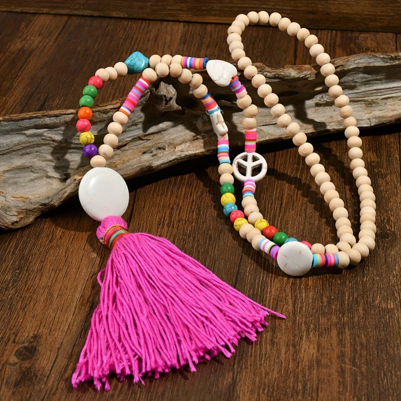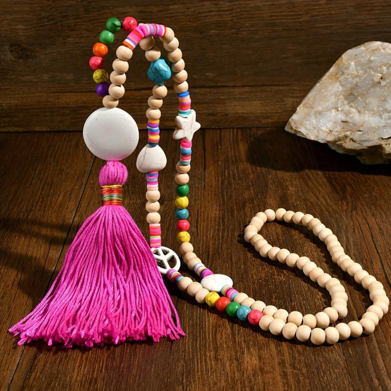 Bohemian Long Necklace Fuchsia Tassel Pendant Wooden Beads Multicolor Stones