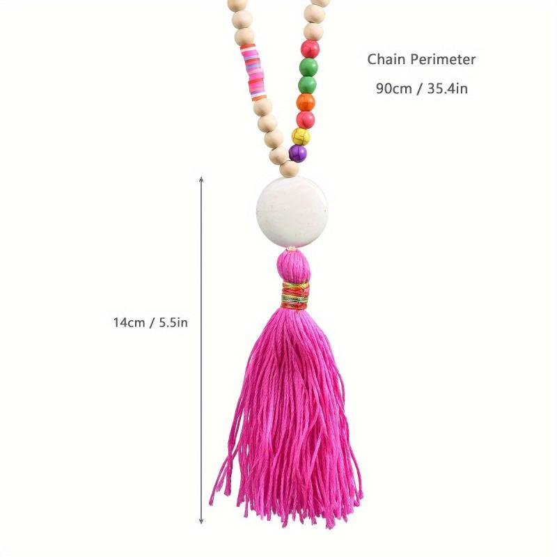 Elevate your style with this bohemian long necklace featuring a fuchsia fleece tassel pendant, wooden beads, and multicolor polymer clay stones. This natural wood and synthetic stone jewelry is perfect for women who love unique accessories.