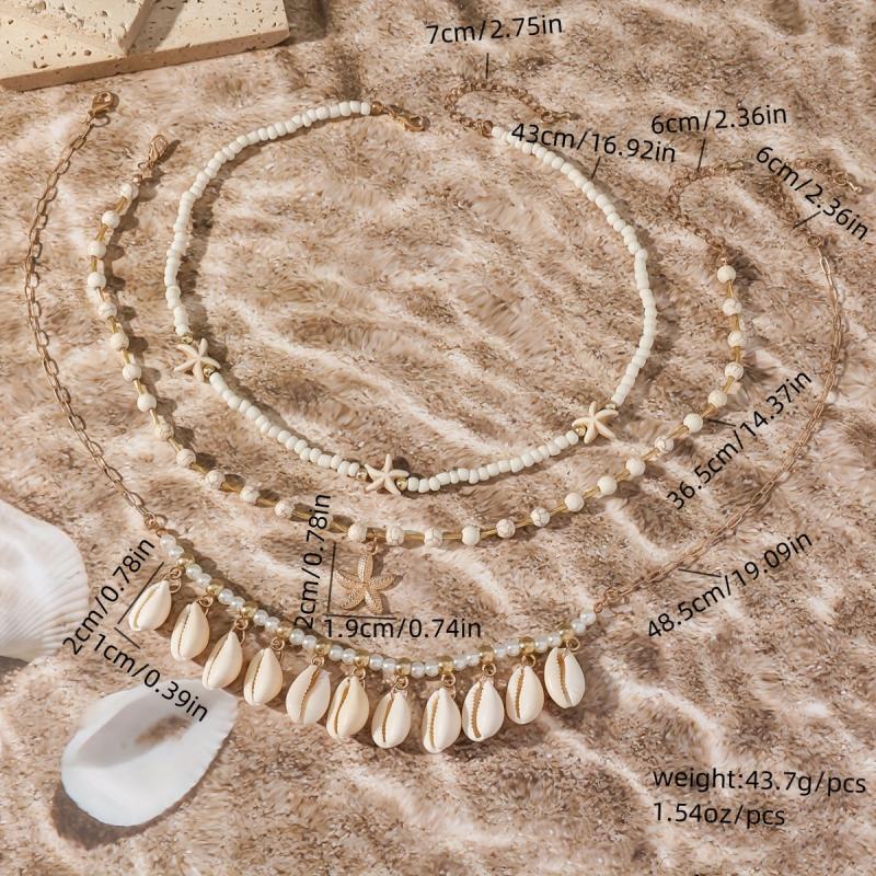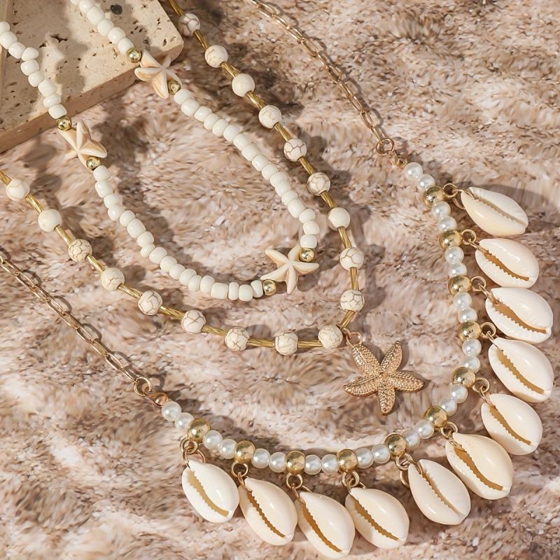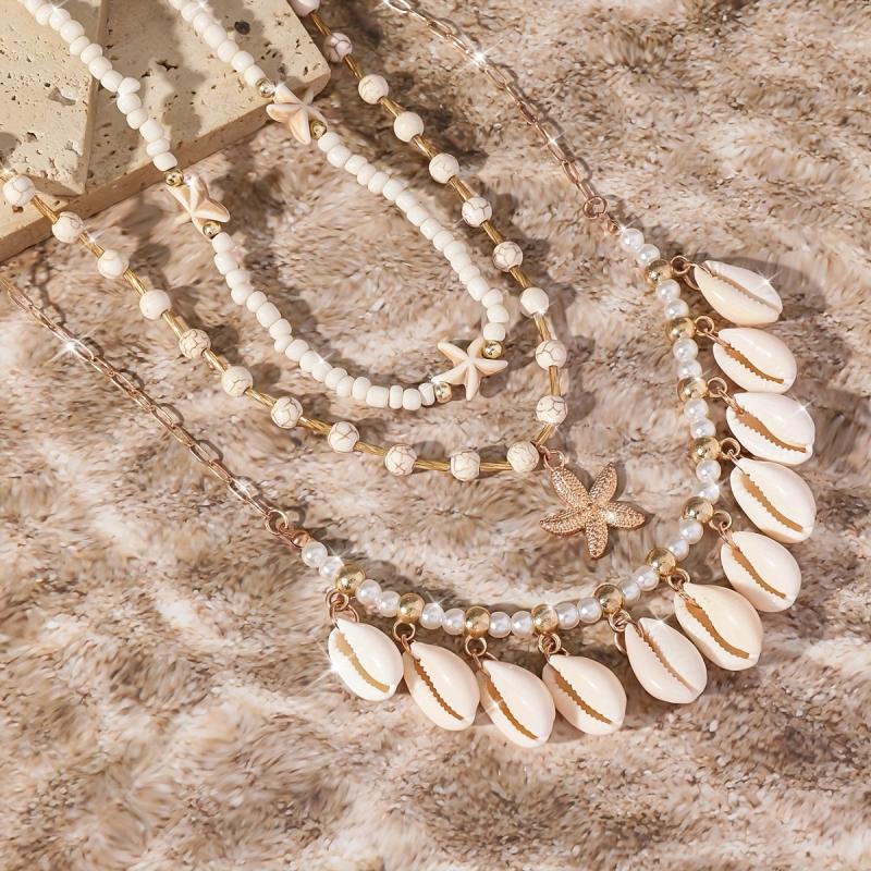 Elevate your style with this unique and high-end necklace set featuring a mix of beads and shells. The layered design adds a touch of bohemian chic to any outfit.