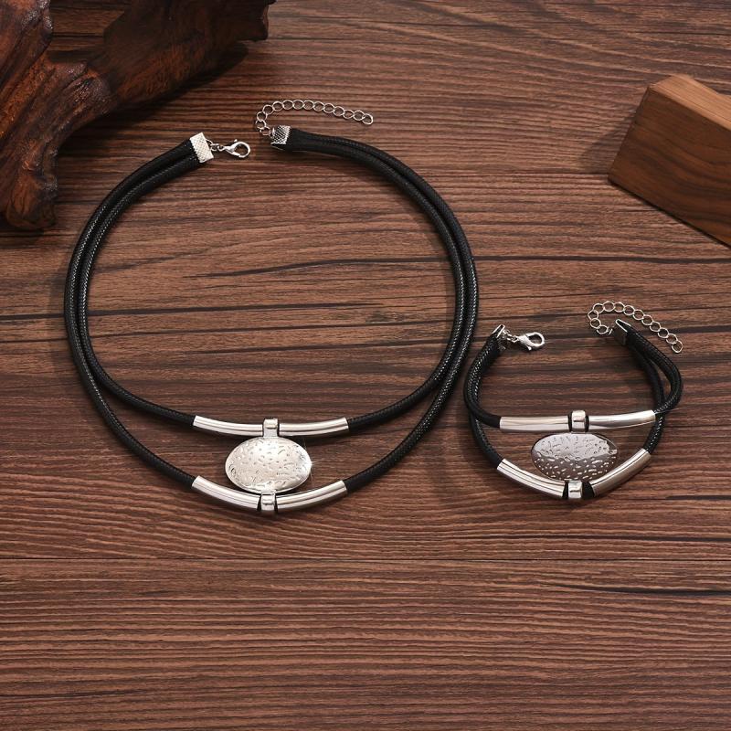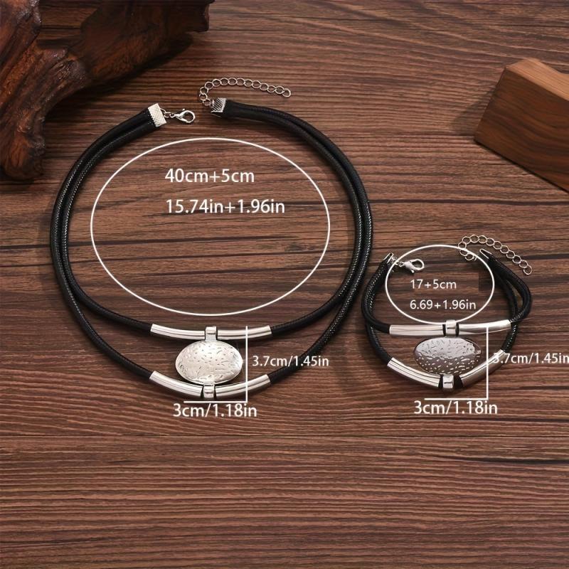 Elevate your boho look with this double layer necklace and bracelet set featuring an oval pendant and long bead design.