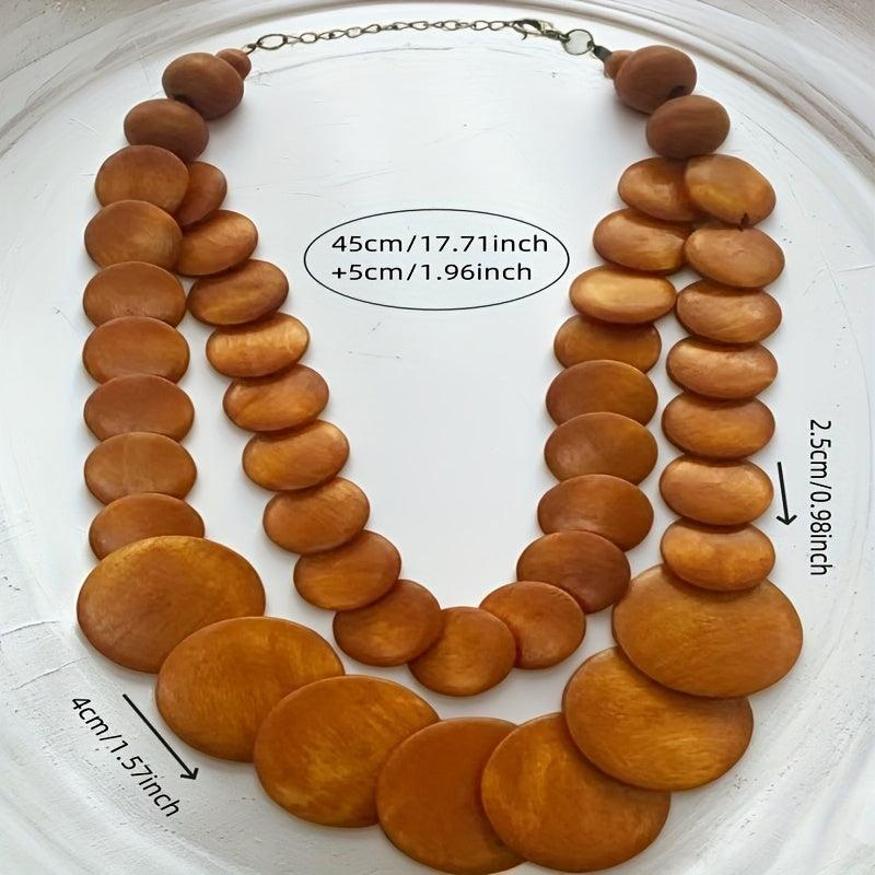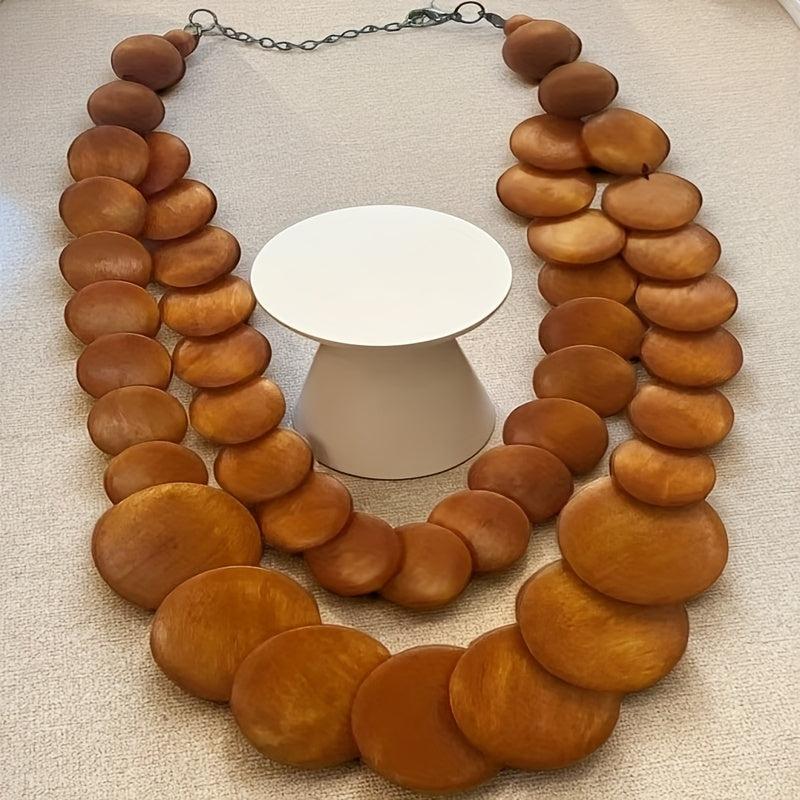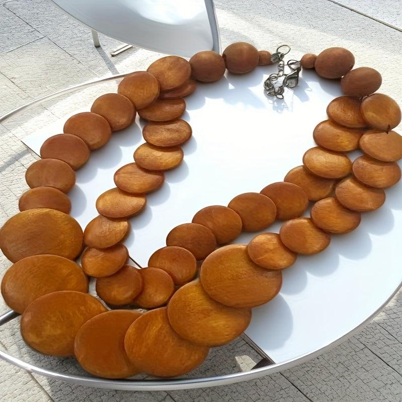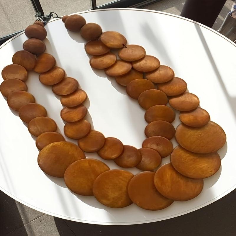 This necklace features recycled coconut wood beads in earthy brown tones, ideal for casual attire or gifting to women. It comes with an adjustable chain for a perfect fit.