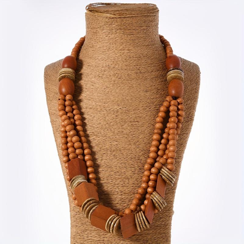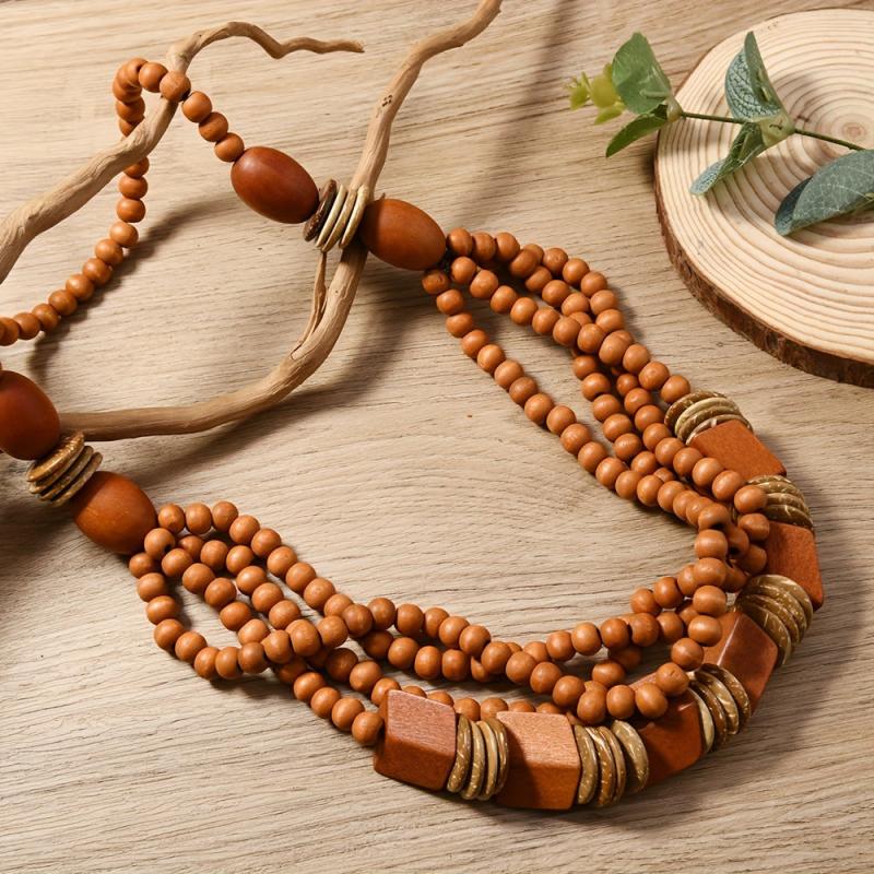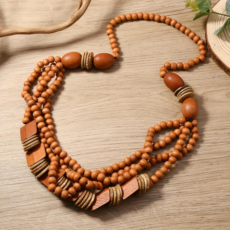 • Layered design with recycled wood beads