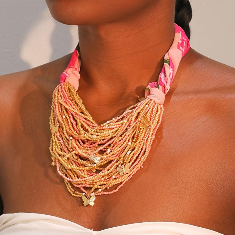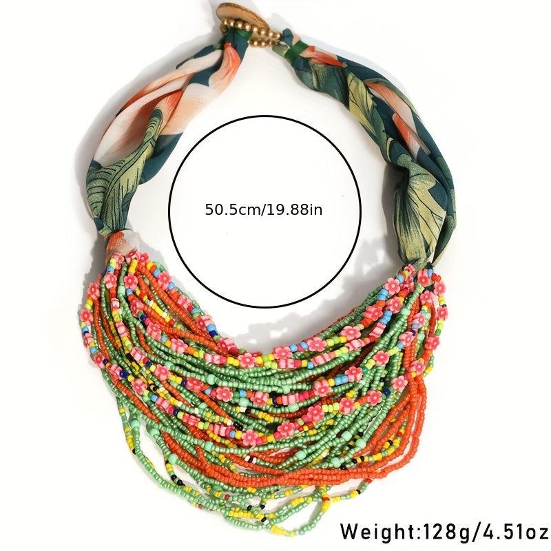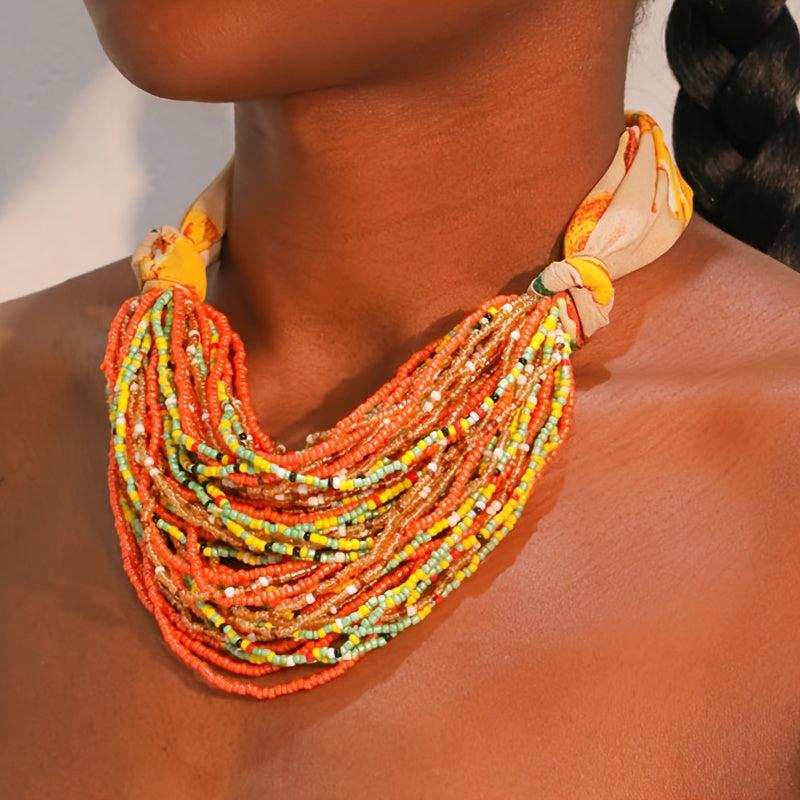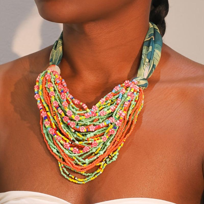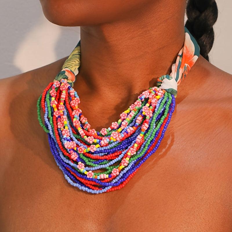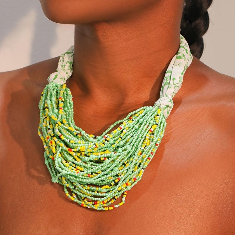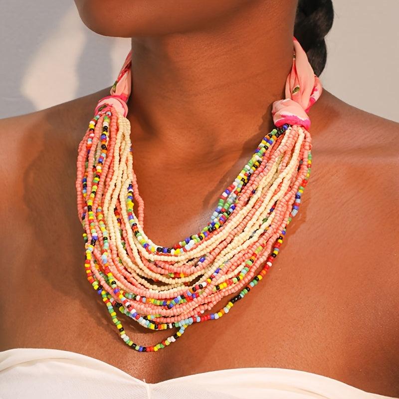 Add a pop of color to your outfit with this Bohemian layered glass bead necklace. Lightweight and durable, perfect for casual or resort wear.