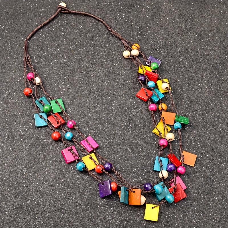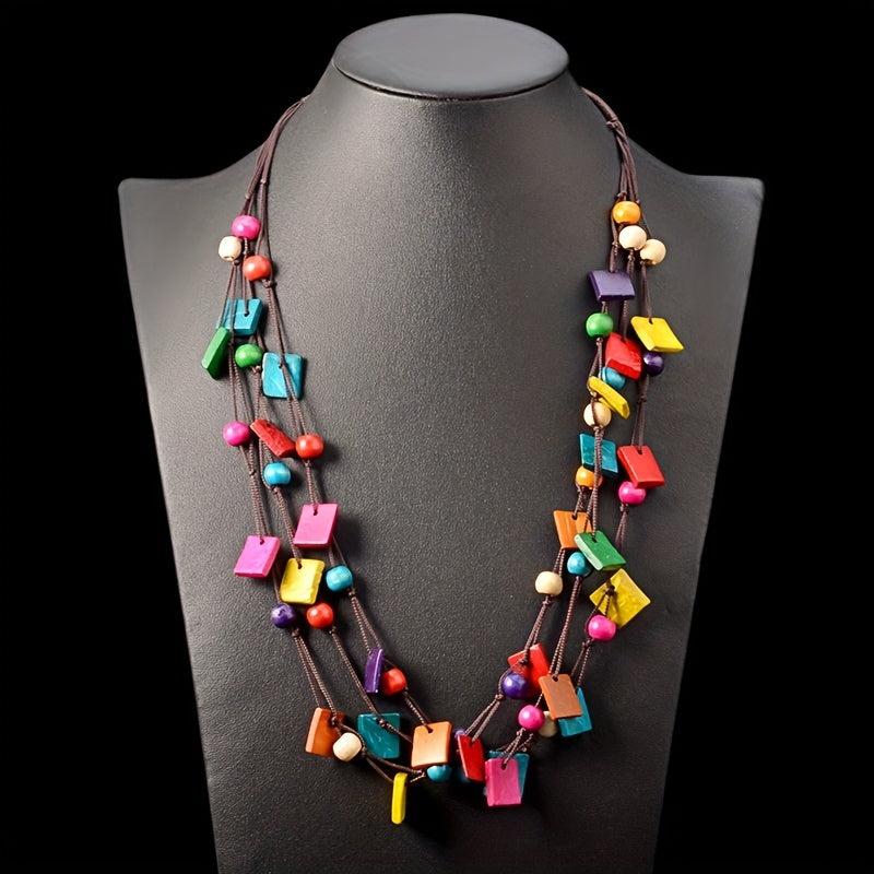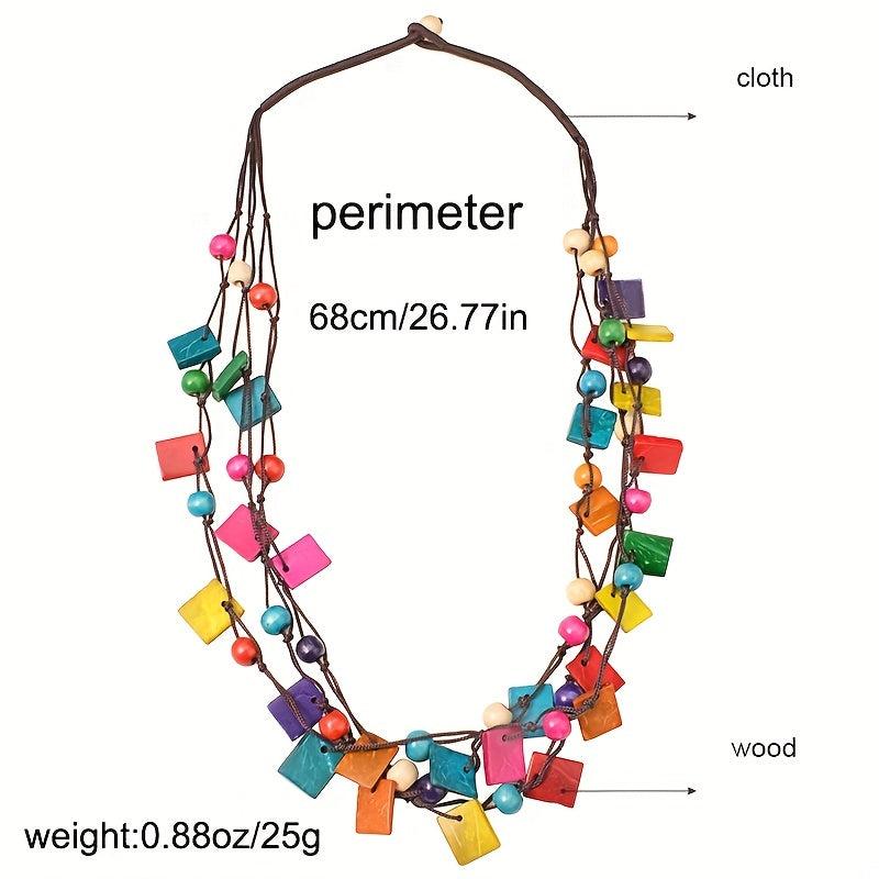 Add a touch of bohemian flair to your outfit with this multilayer square wooden rice bead necklace. Perfect for summer beach days or to add an ethnic touch to your look.