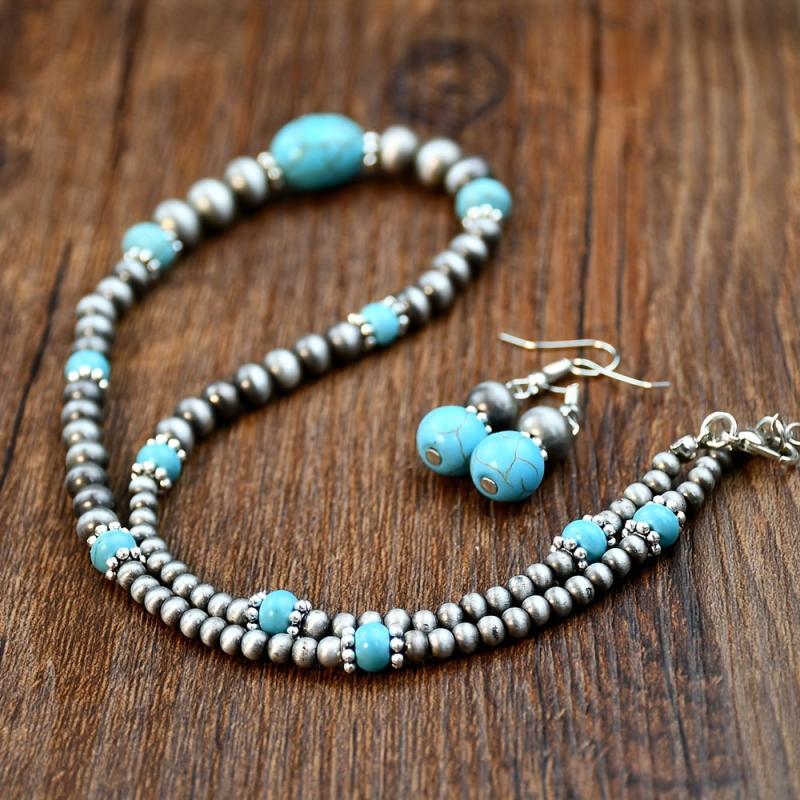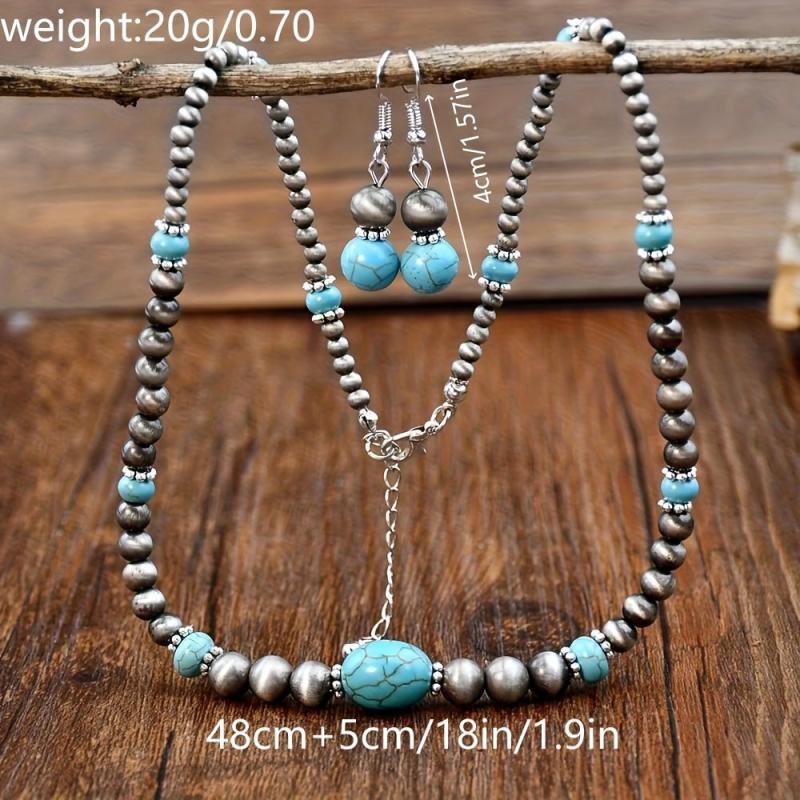 Add a touch of bohemian vintage ethnic style to your look with this stunning turquoise necklace and earrings set. The antique silvery beaded jewelry is perfect for women who love unique accessories.