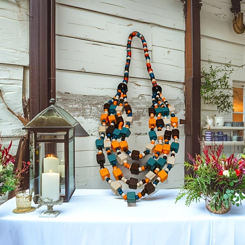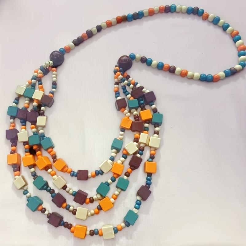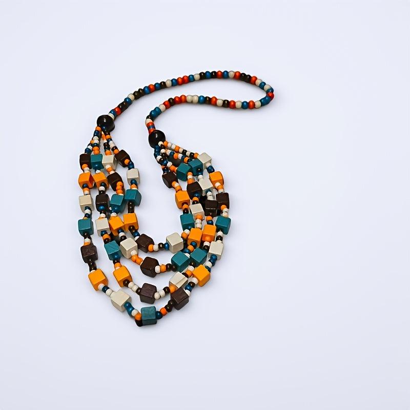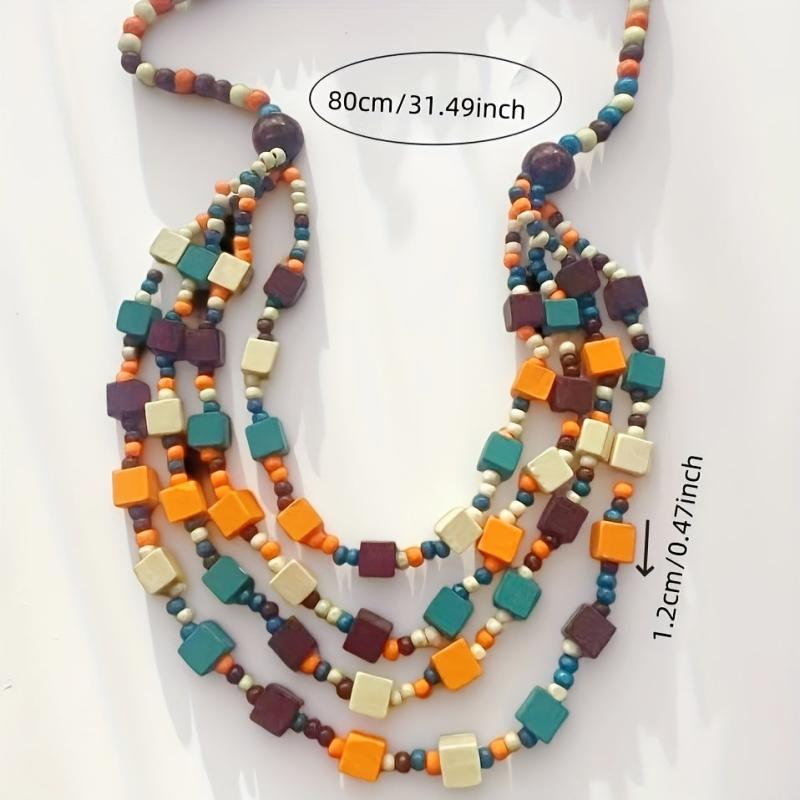 Elevate your look with this bohemian style necklace featuring vibrant multicolor recycled wood square beads. Perfect for daily wear or music festivals.