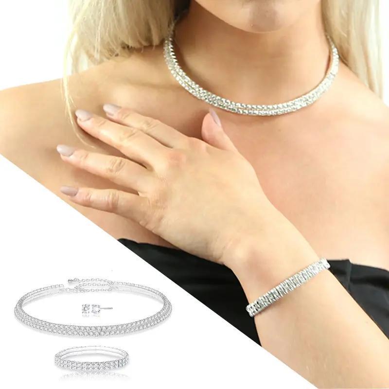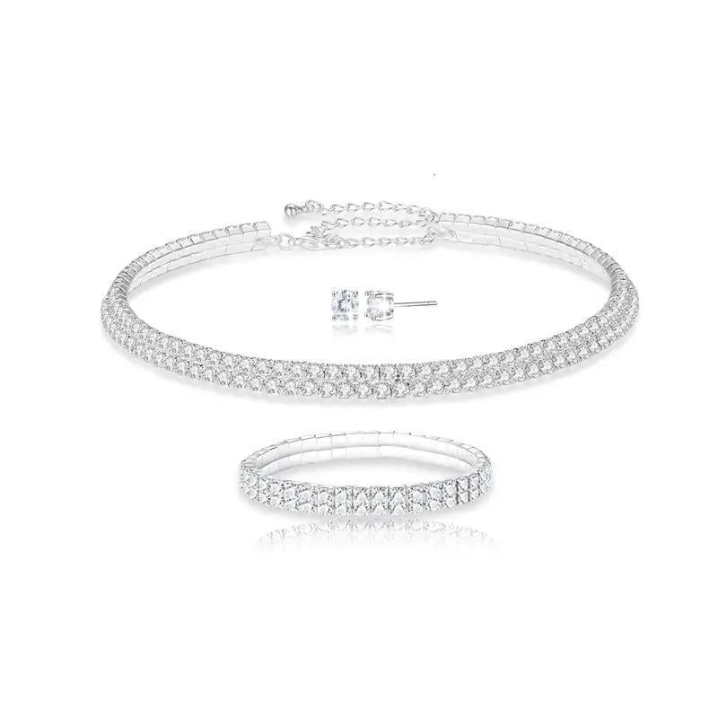 This stunning jewelry set includes a double row necklace, bracelet, and earrings all encrusted with crystals. Perfect as a gift for women.