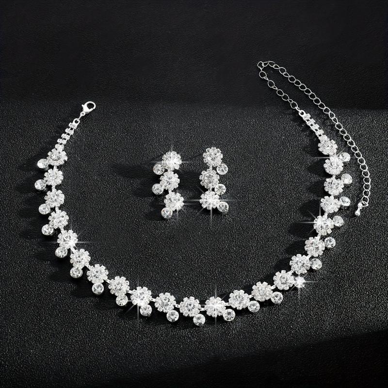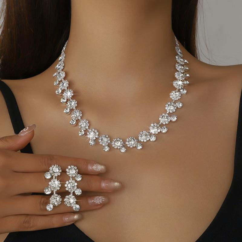 Elevate your wedding or formal event outfit with this exquisite cubic zirconia floral sunset necklace and earring set. The detailed craftsmanship and elegant design will make you stand out.