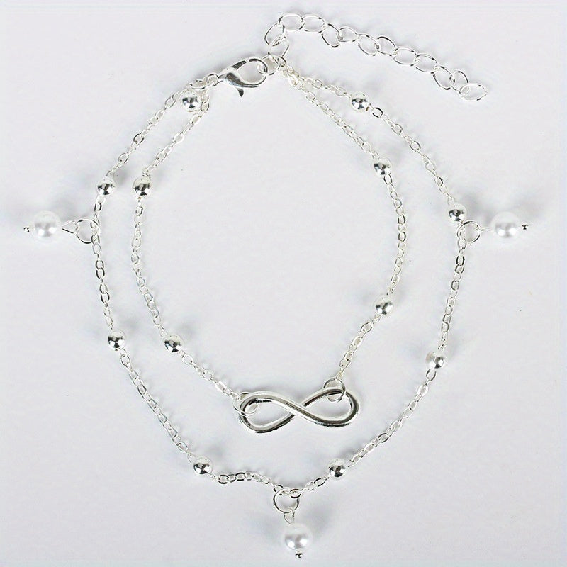 Elevate your style with this elegant double layer chain anklet featuring faux pearls pendant and infinity symbol beads. Perfect accessory for a chic look.