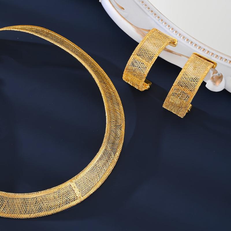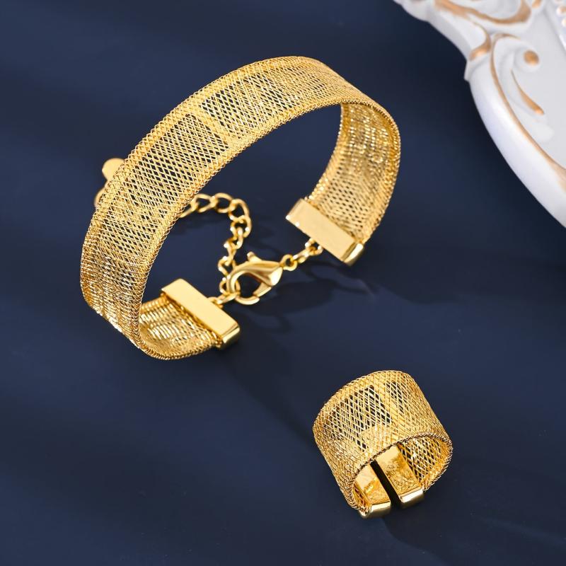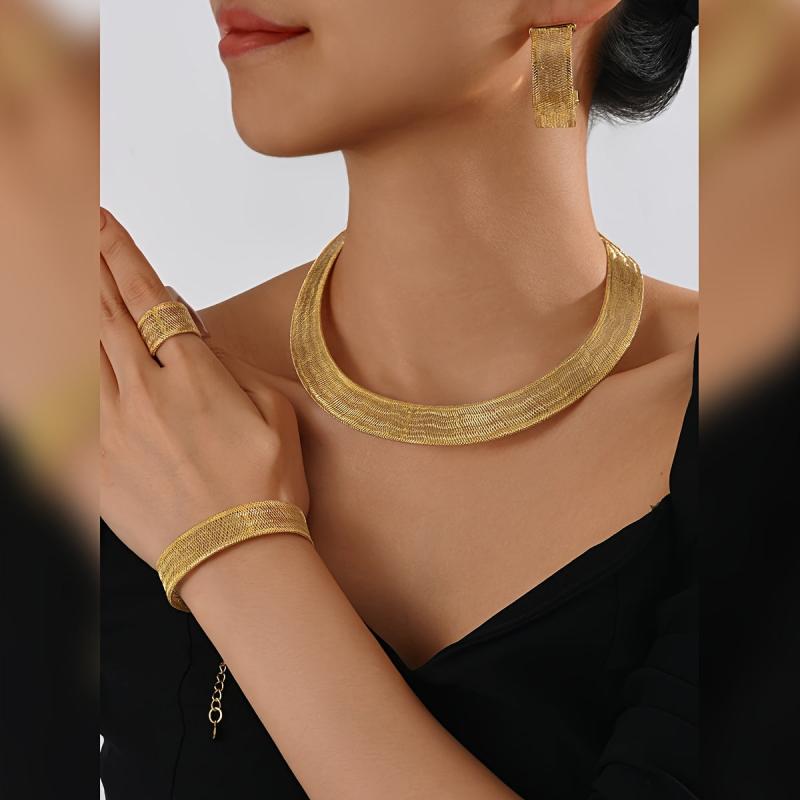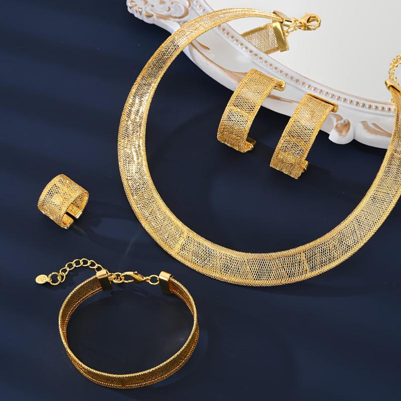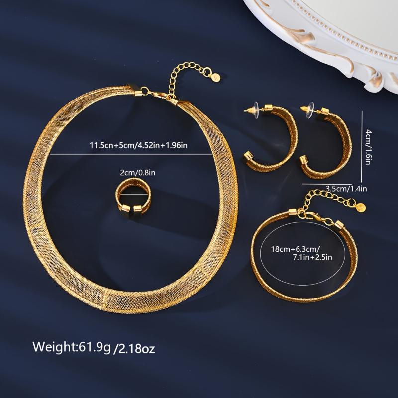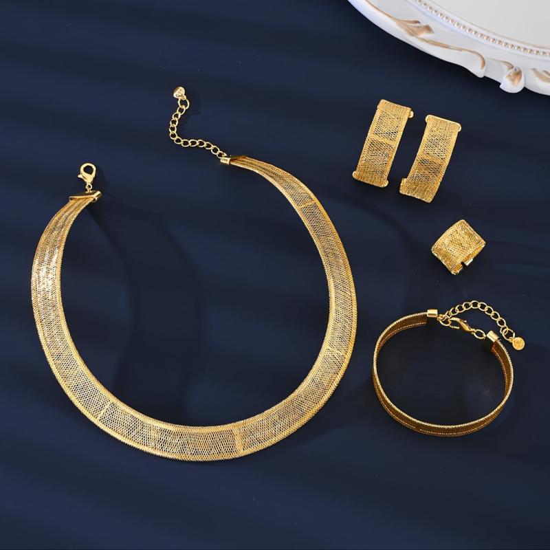 This 5-piece set features a fashionable and elegant design, perfect for weddings and engagements. Made of copper material, the set includes a necklace, ring, bracelet, and earrings.