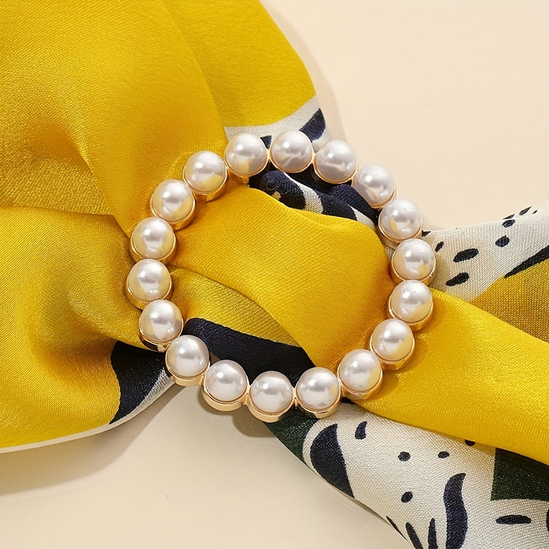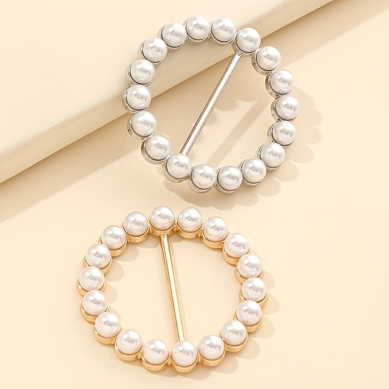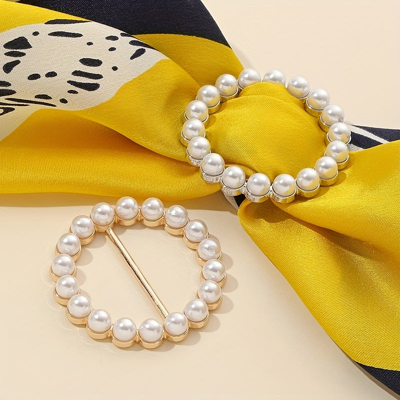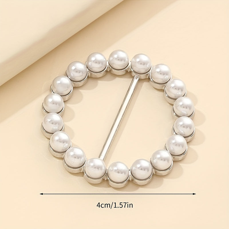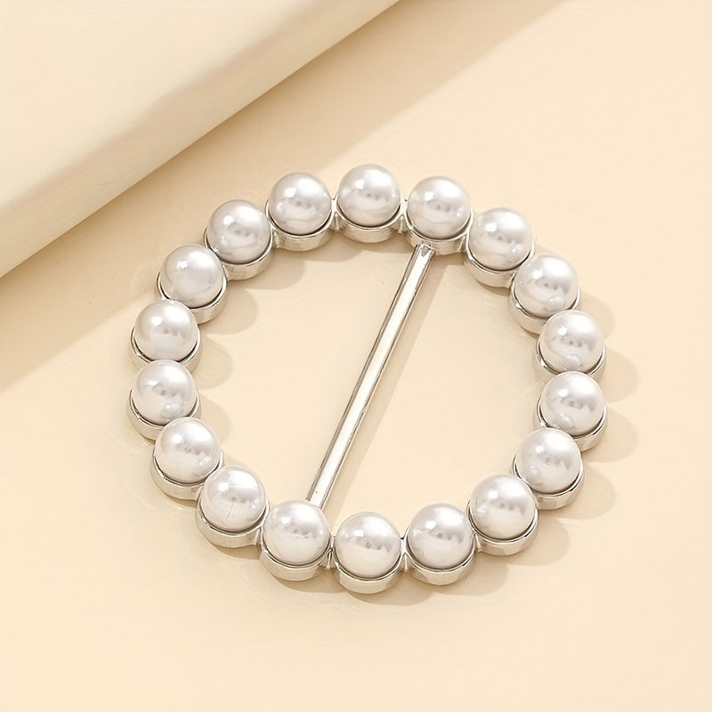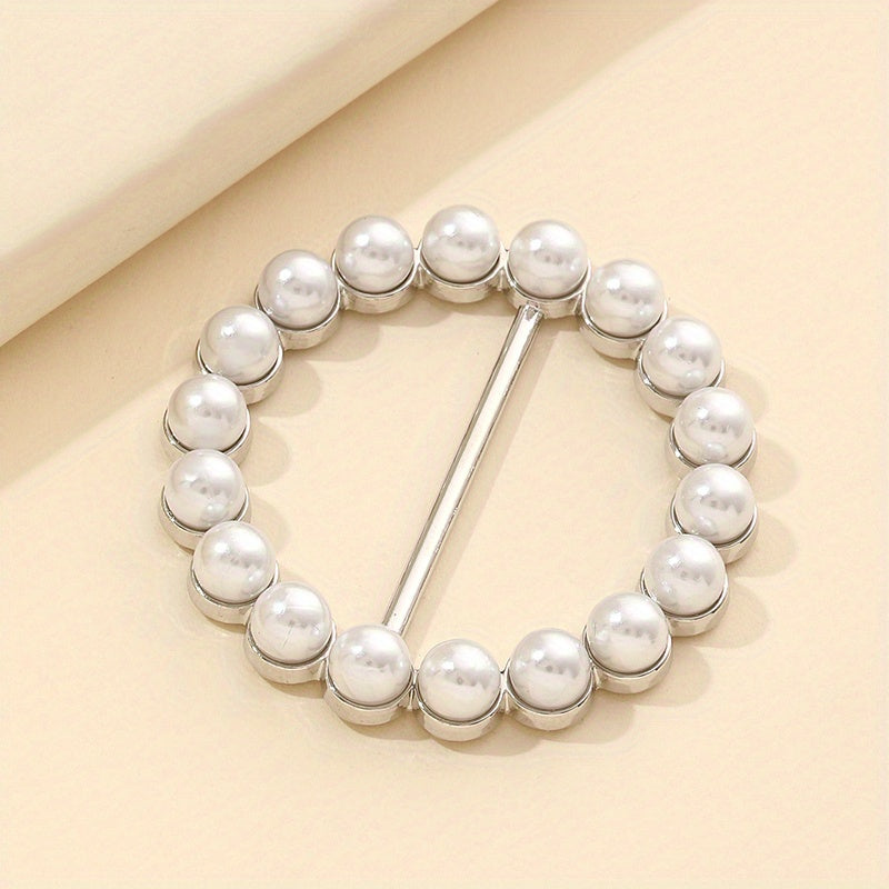 This elegant brooch features a round shape scarf buckle with faux pearls for a sophisticated look.