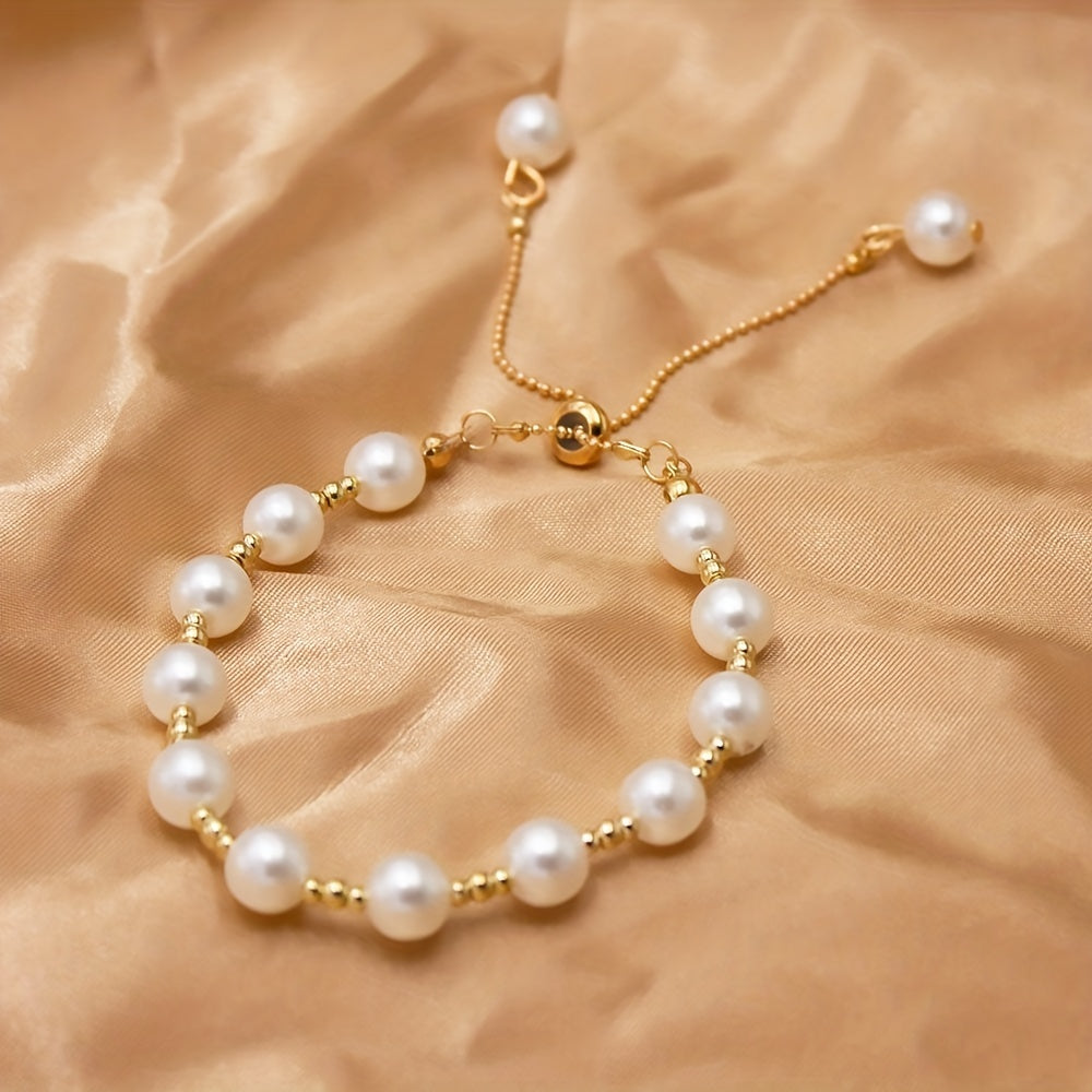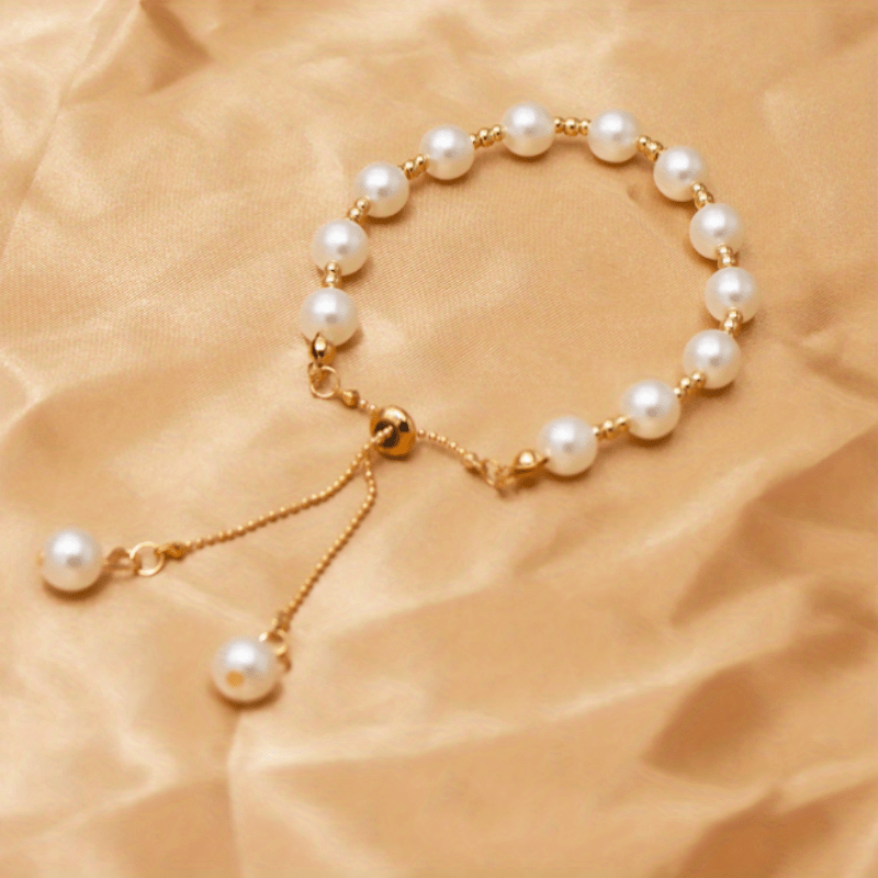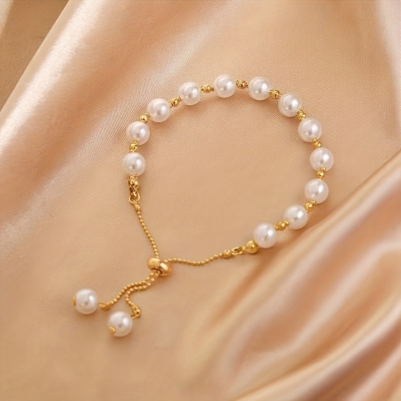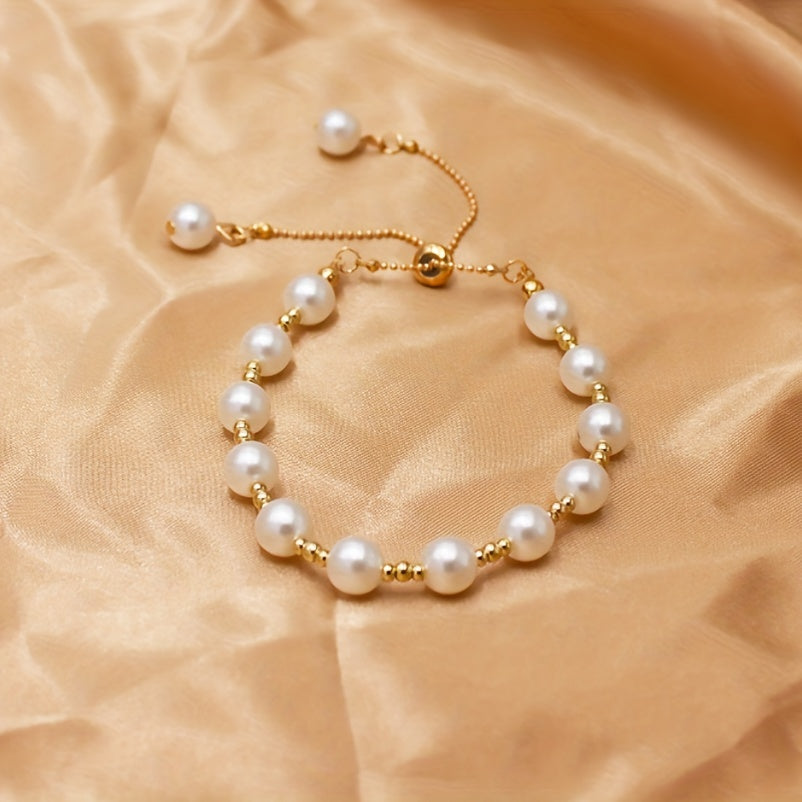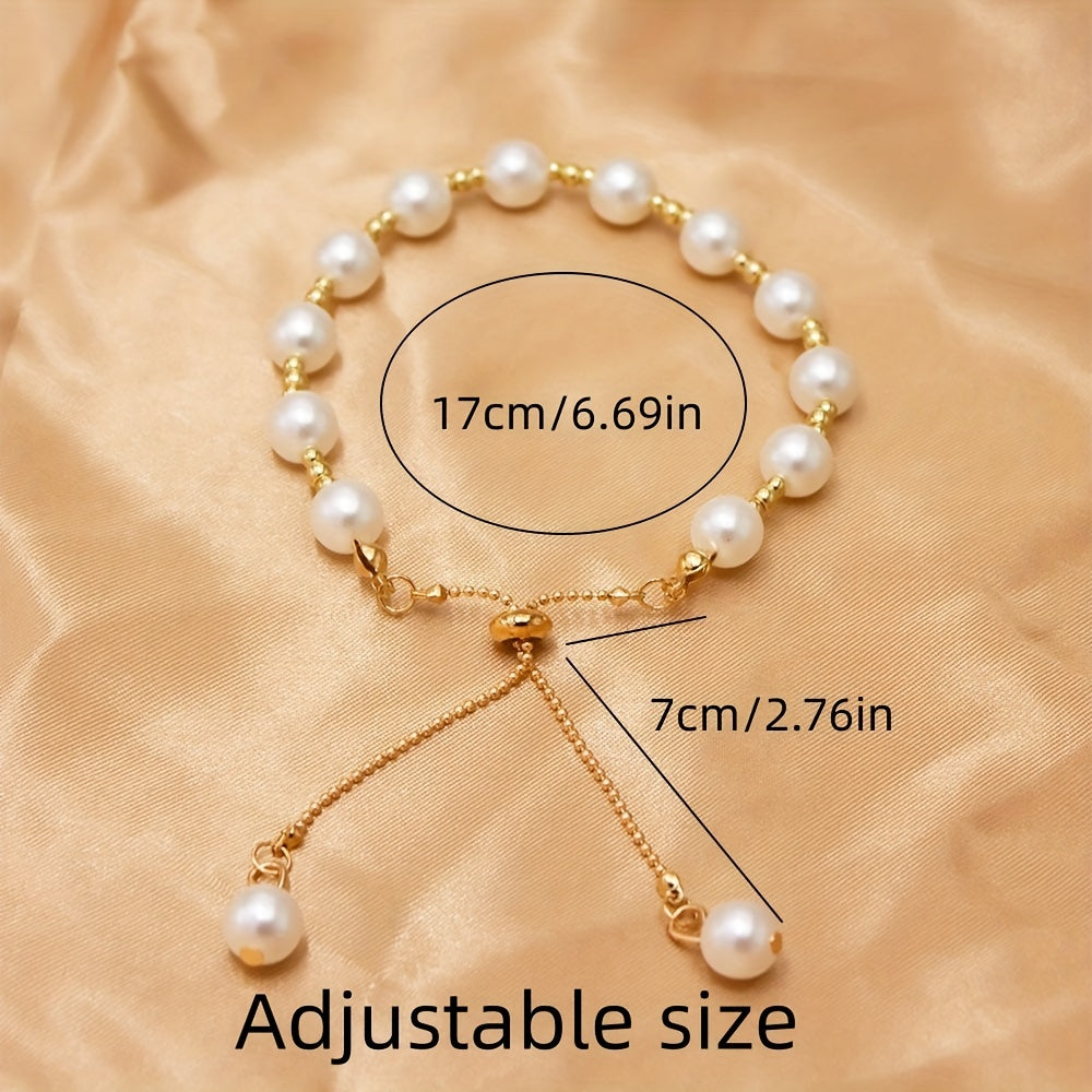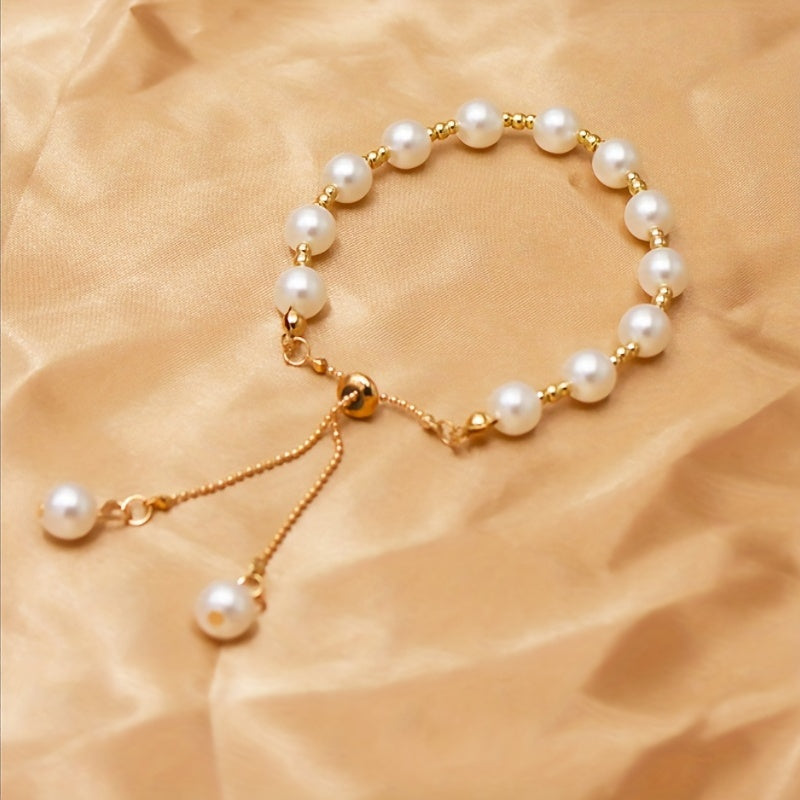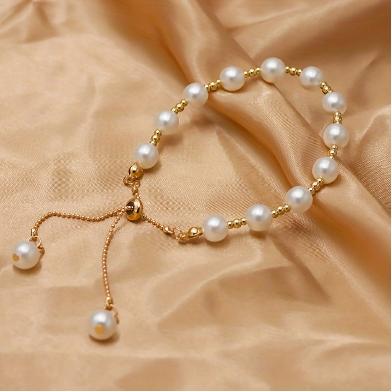 Elegant faux pearls beaded bracelet perfect for women and girls. Adjustable size for a comfortable fit. Add a touch of sophistication to any outfit.