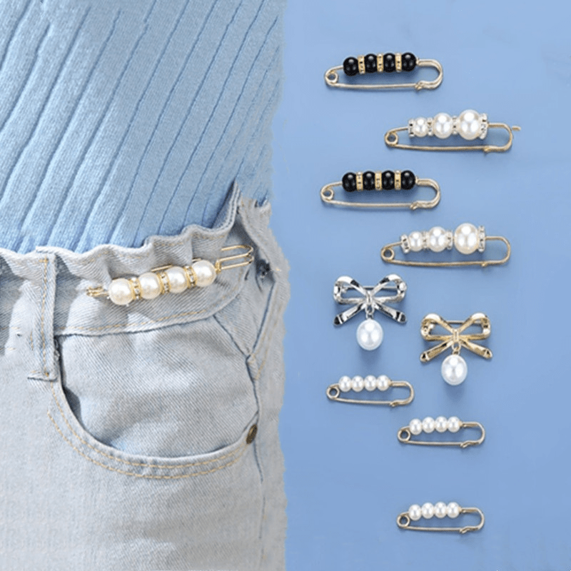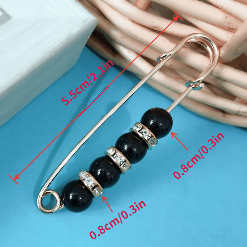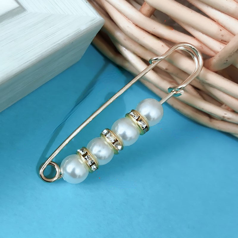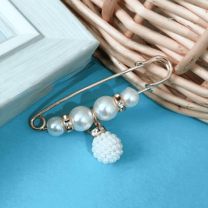 Add a touch of elegance to your outfit with this safety pin featuring faux pearls and inlaid rhinestones. Perfect for securing pants or scarves.