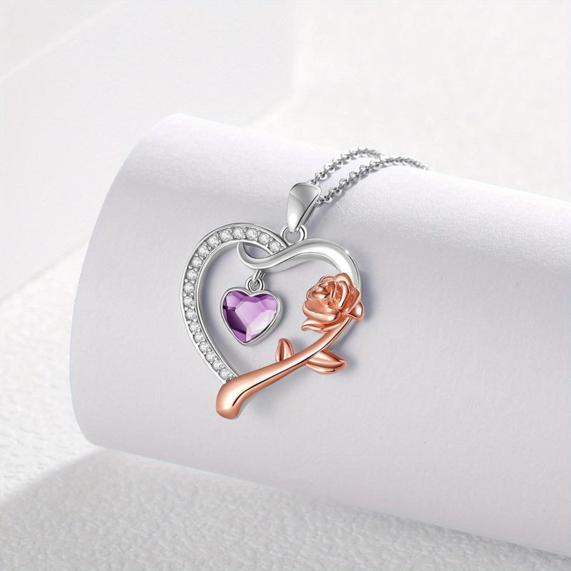 This elegant necklace features a heart-shaped rose golden pendant adorned with a stunning February birthstone. Crafted from 925 sterling silver and embellished with cubic zirconia, it makes a perfect gift for your wife or mother.