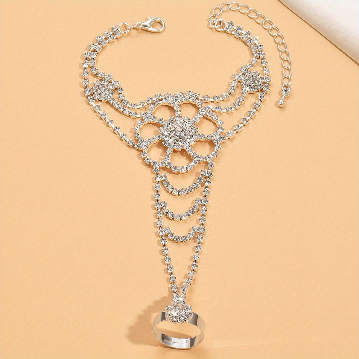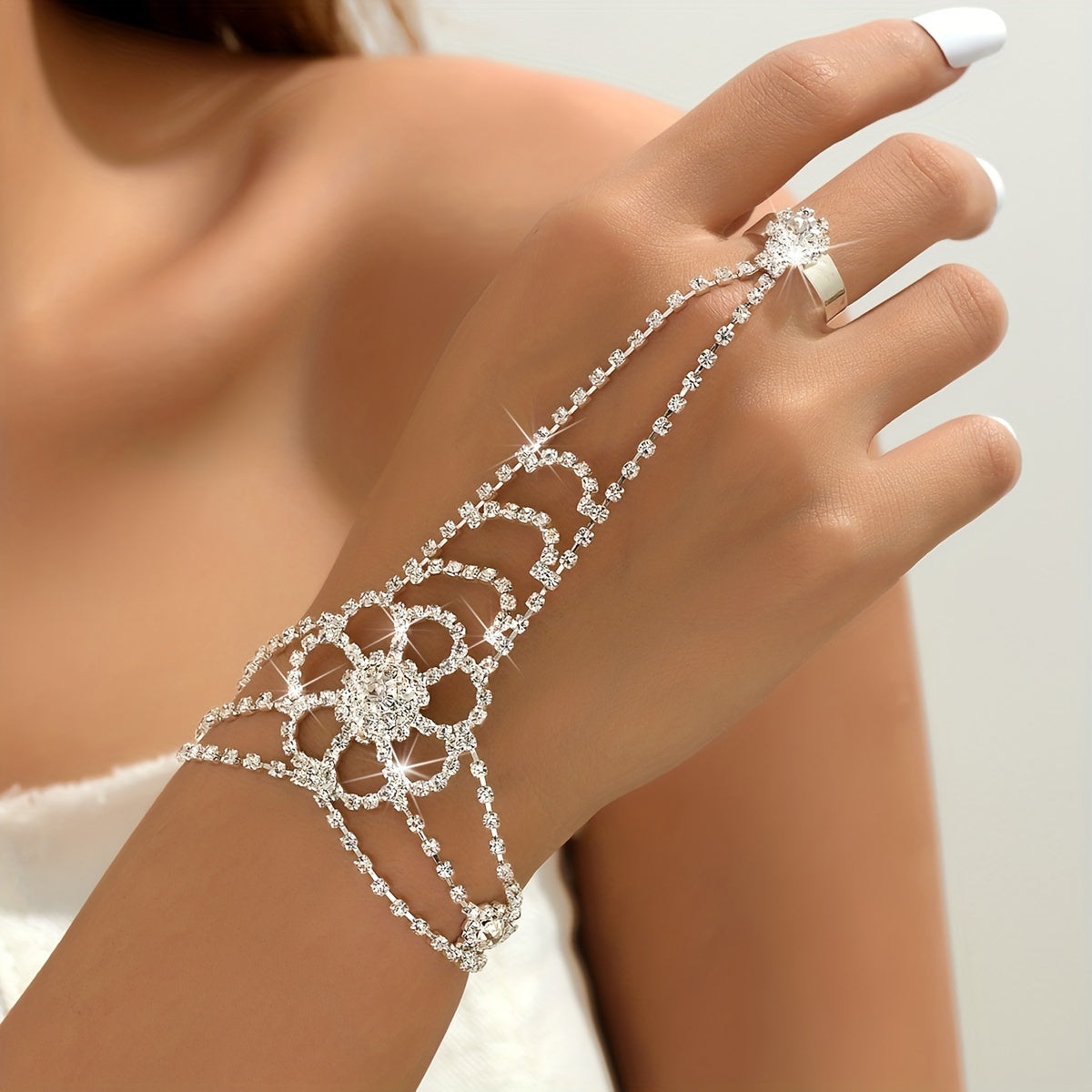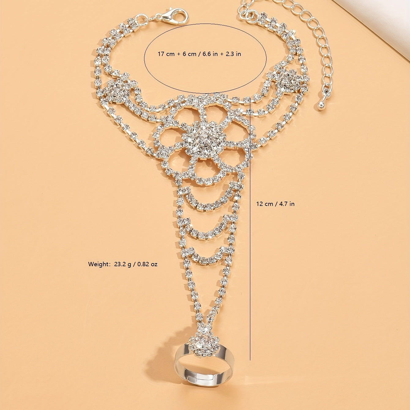Add a touch of elegance to your wedding attire with this exquisite flower geometric rhinestone zircon ring bracelet chain. Perfect for brides and bridesmaids.