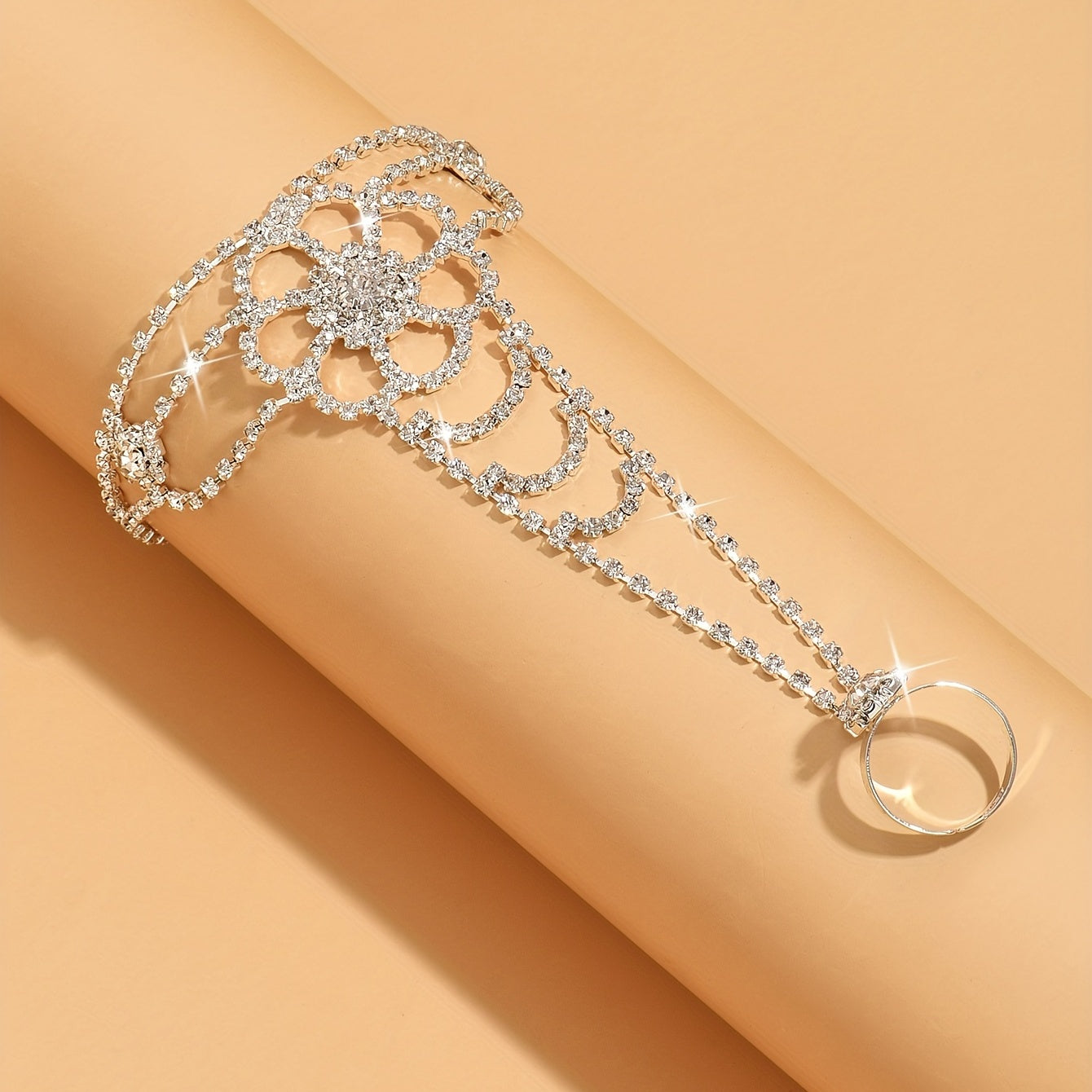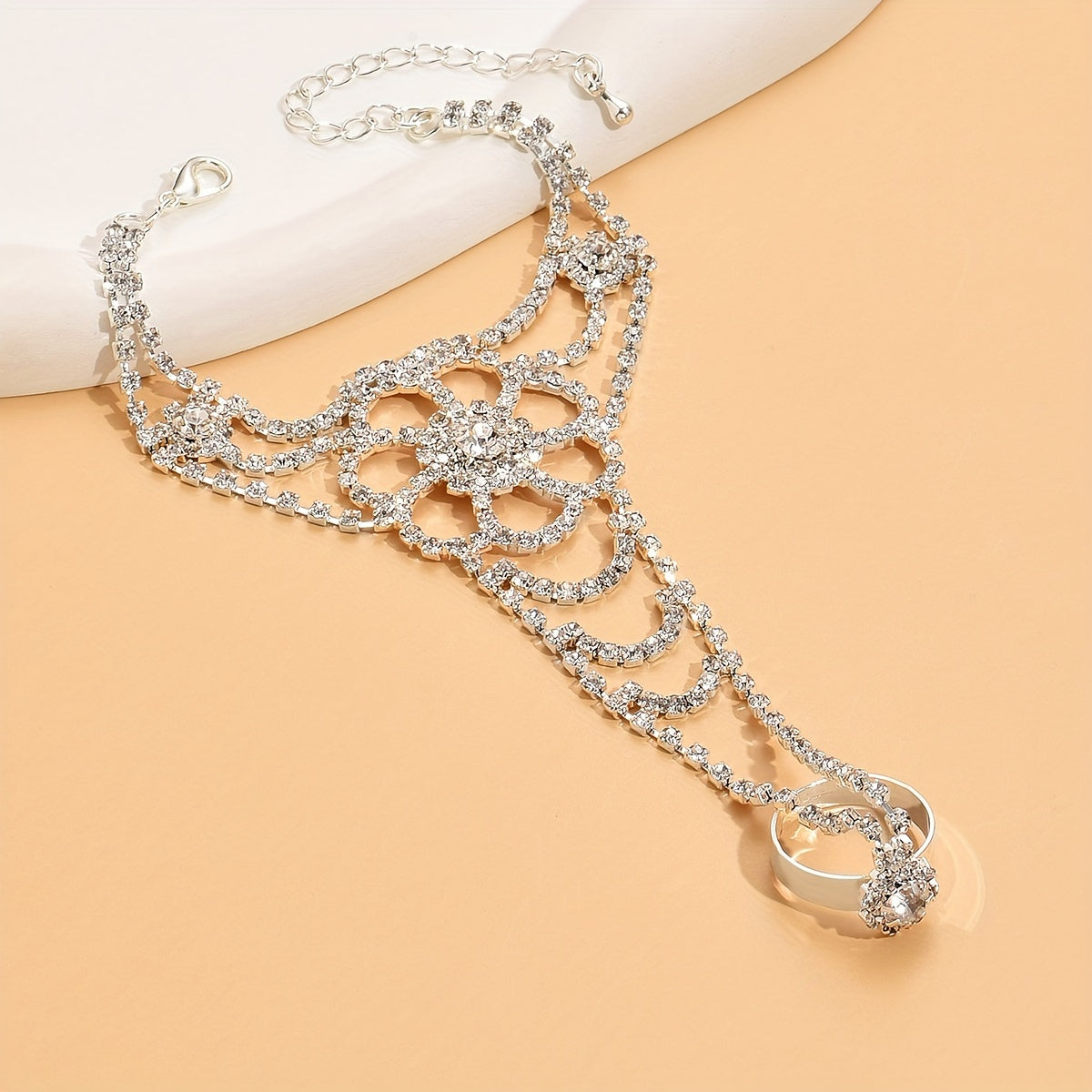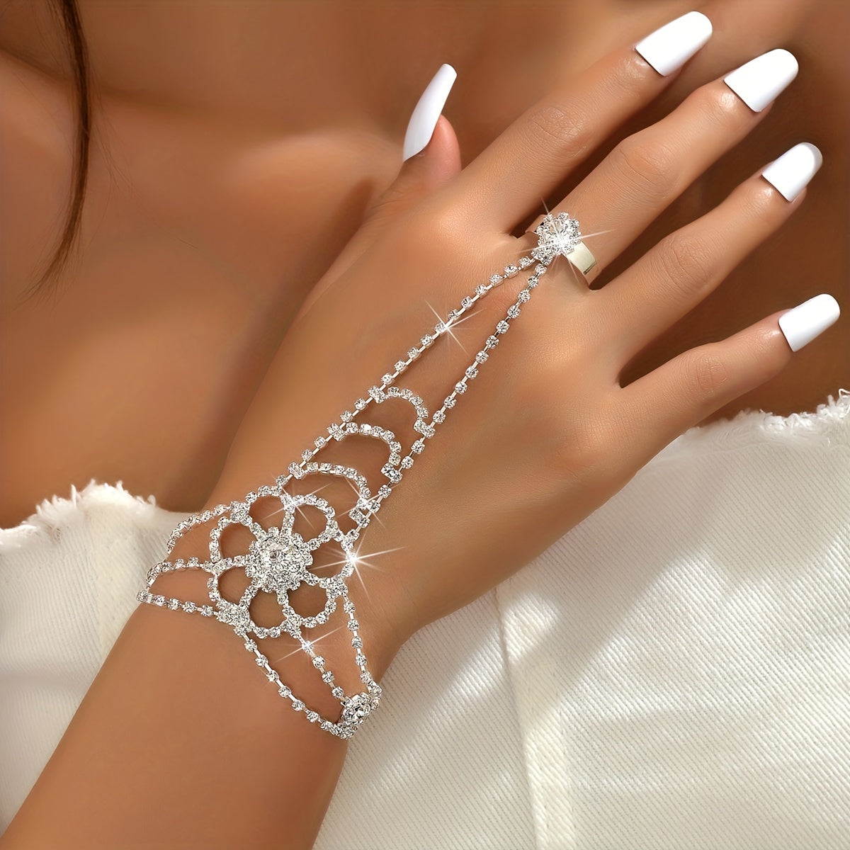 Add a touch of elegance to your wedding attire with this exquisite flower geometric rhinestone zircon ring bracelet chain. Perfect for brides and bridesmaids.