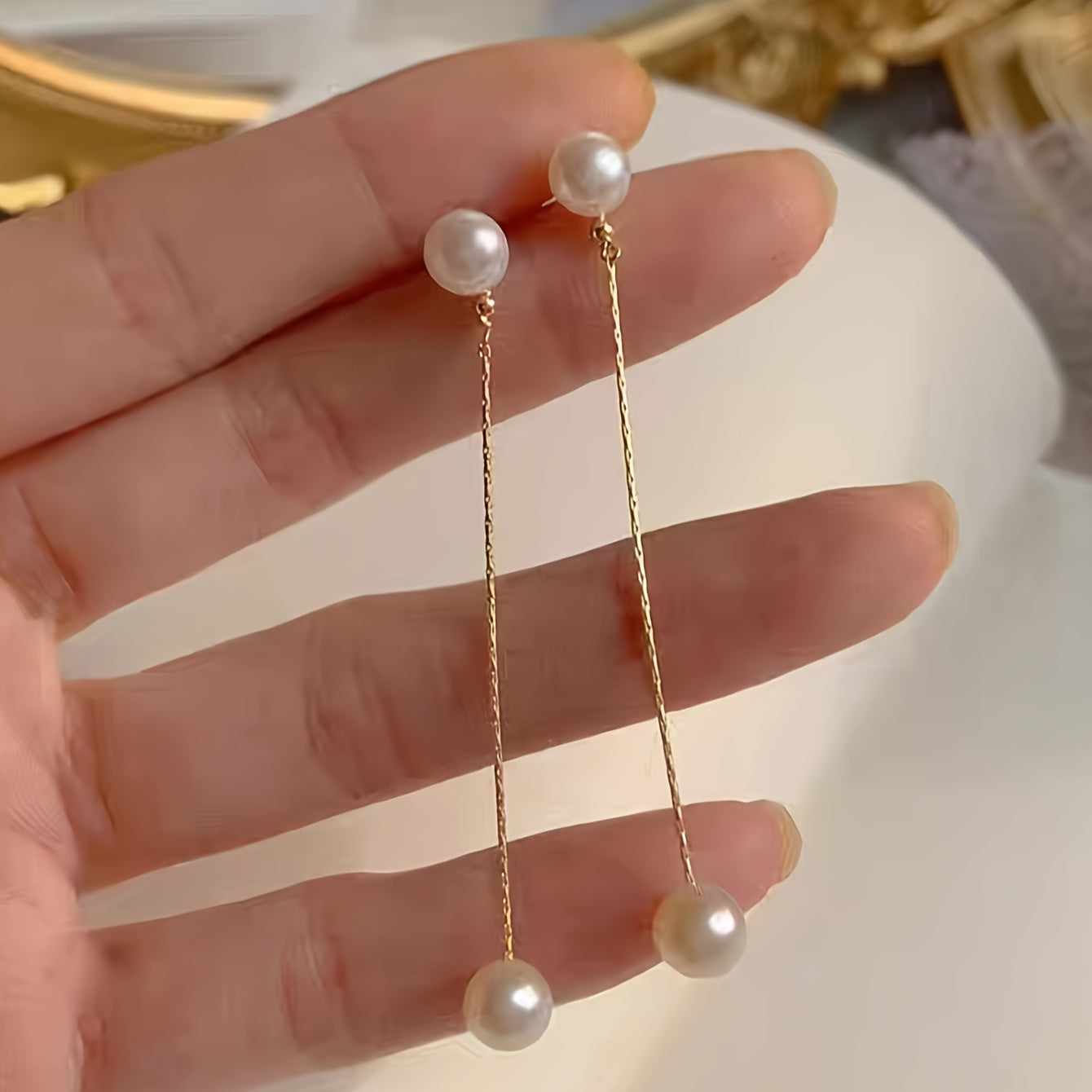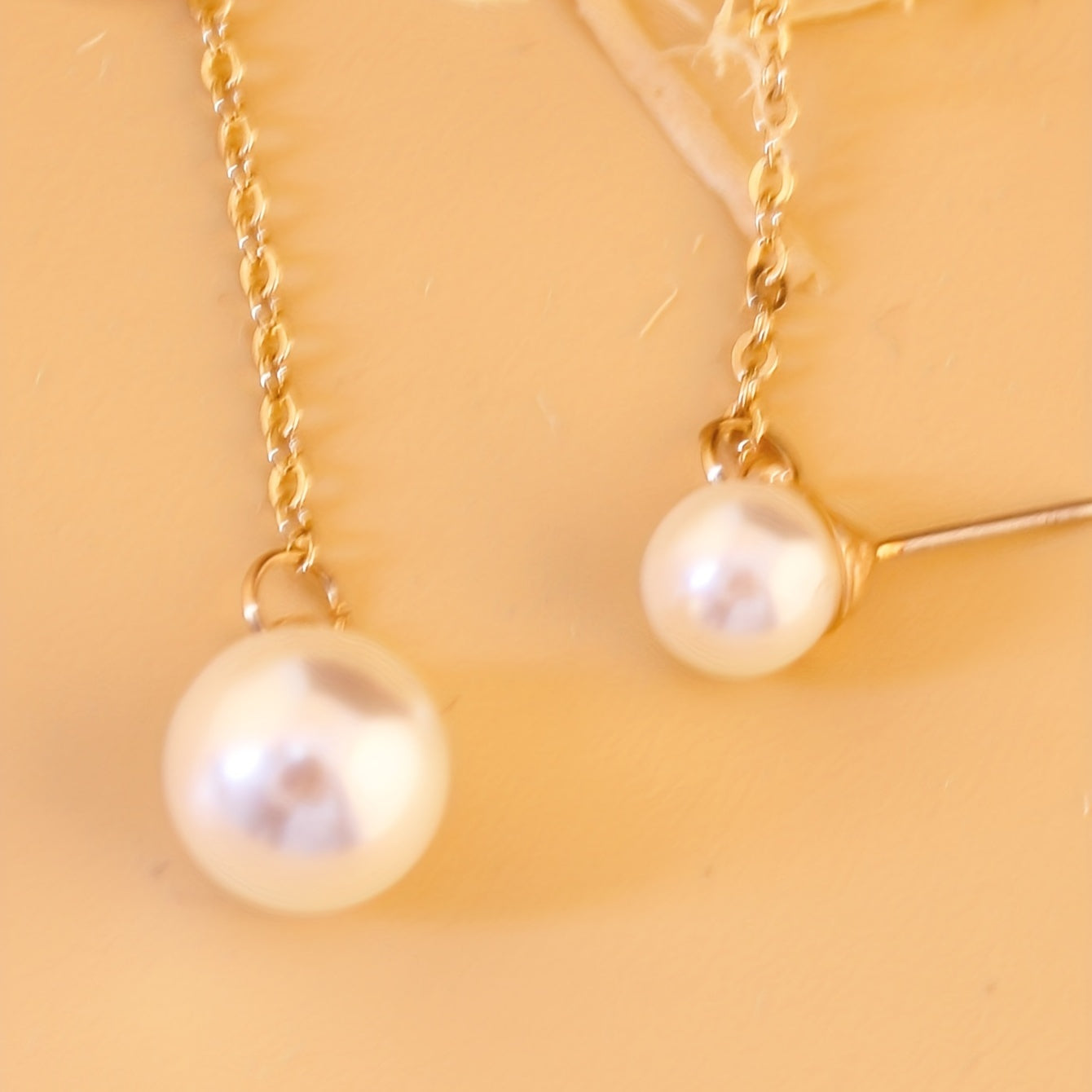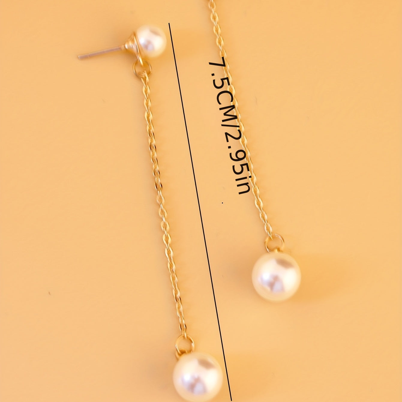 These elegant dangle earrings feature a golden chain design with faux pearl accents. Perfect for weddings, brides, or everyday wear.