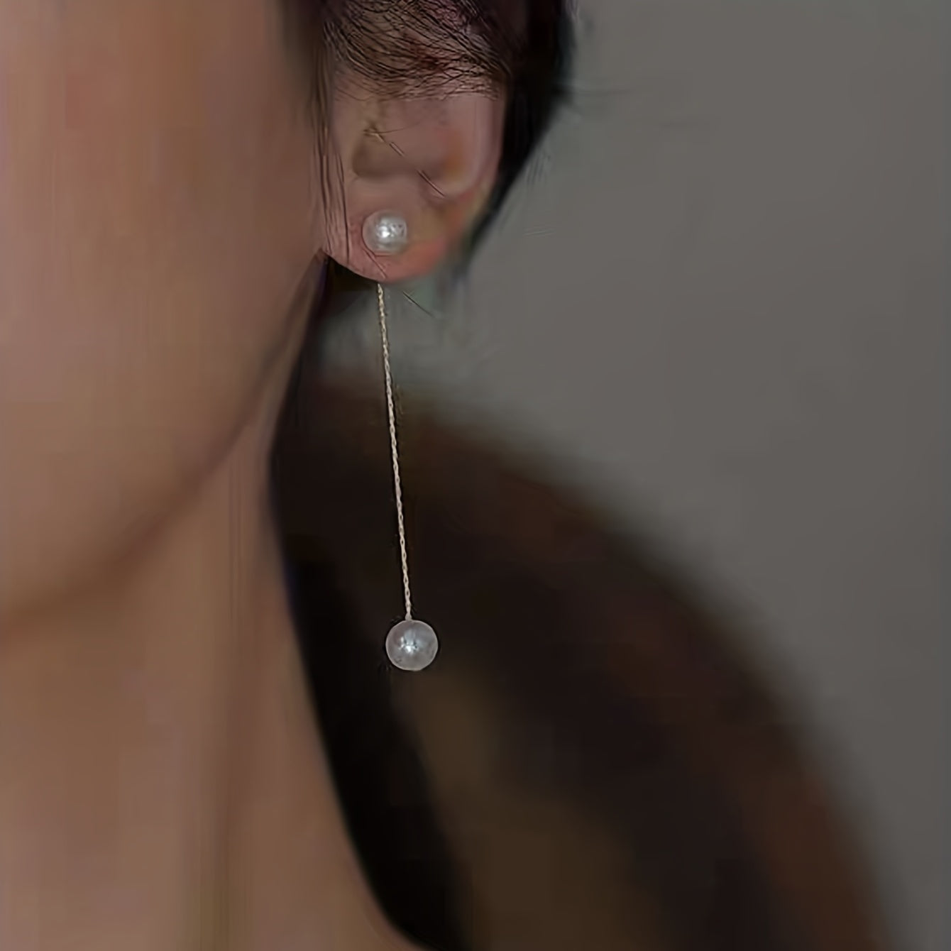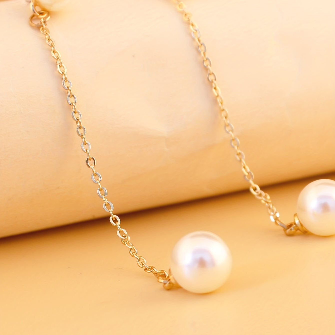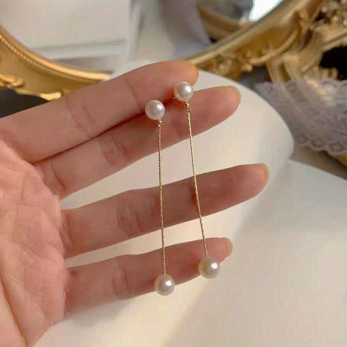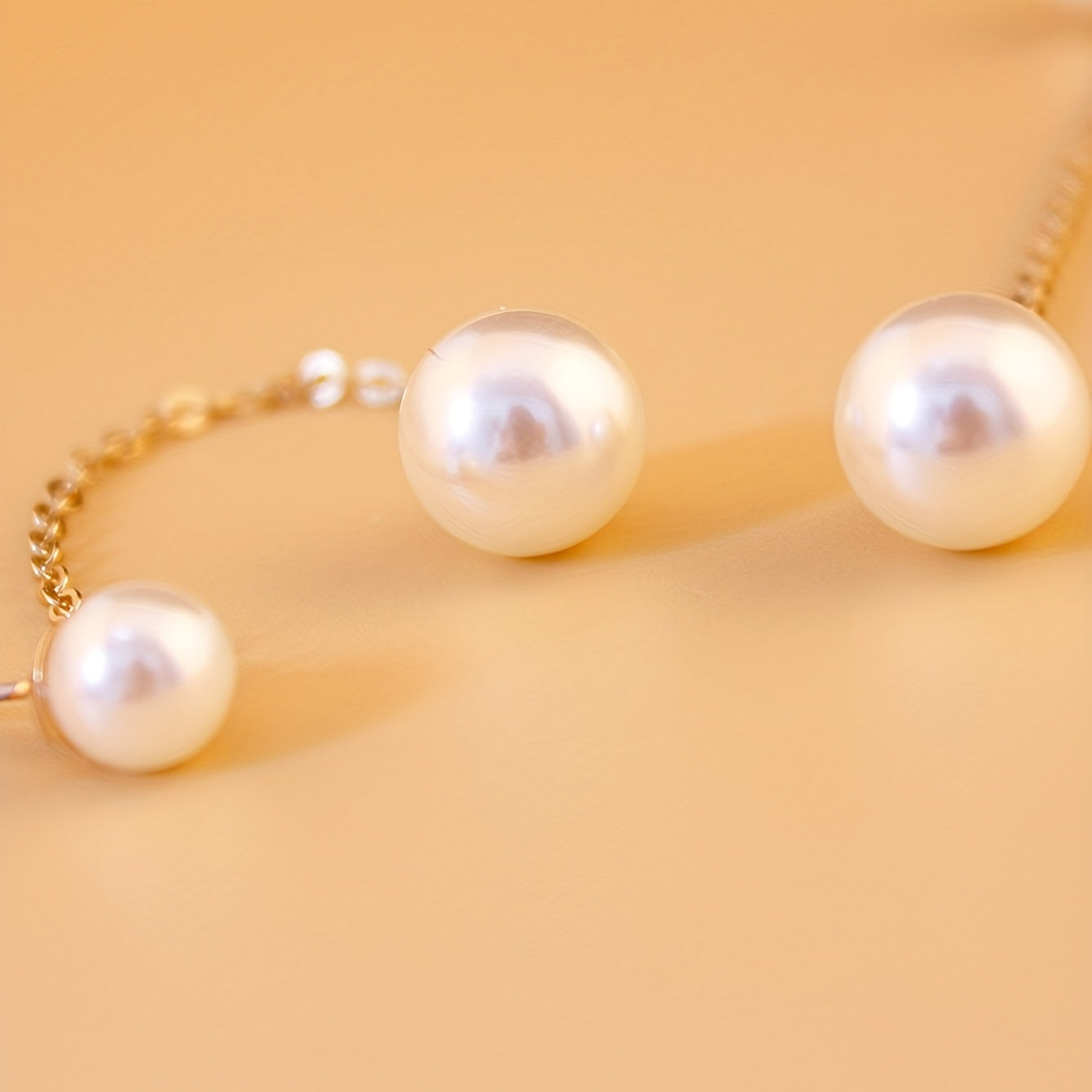 These elegant dangle earrings feature a golden chain design with faux pearl accents. Perfect for weddings, brides, or everyday wear.