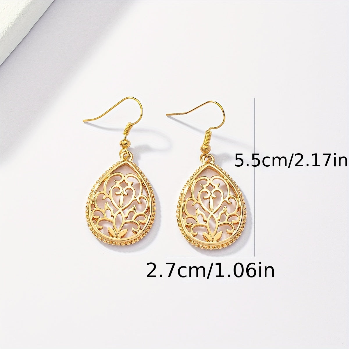These delicate teardrop dangle earrings feature a hollow golden flower pattern. They are made of high-quality alloy with 14K gold plating, making them an elegant and stylish accessory. Perfect as a gift for a special woman.