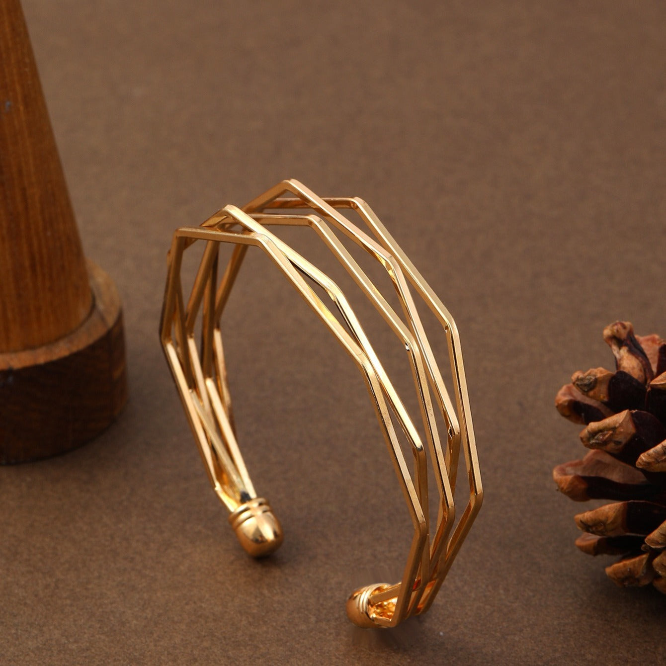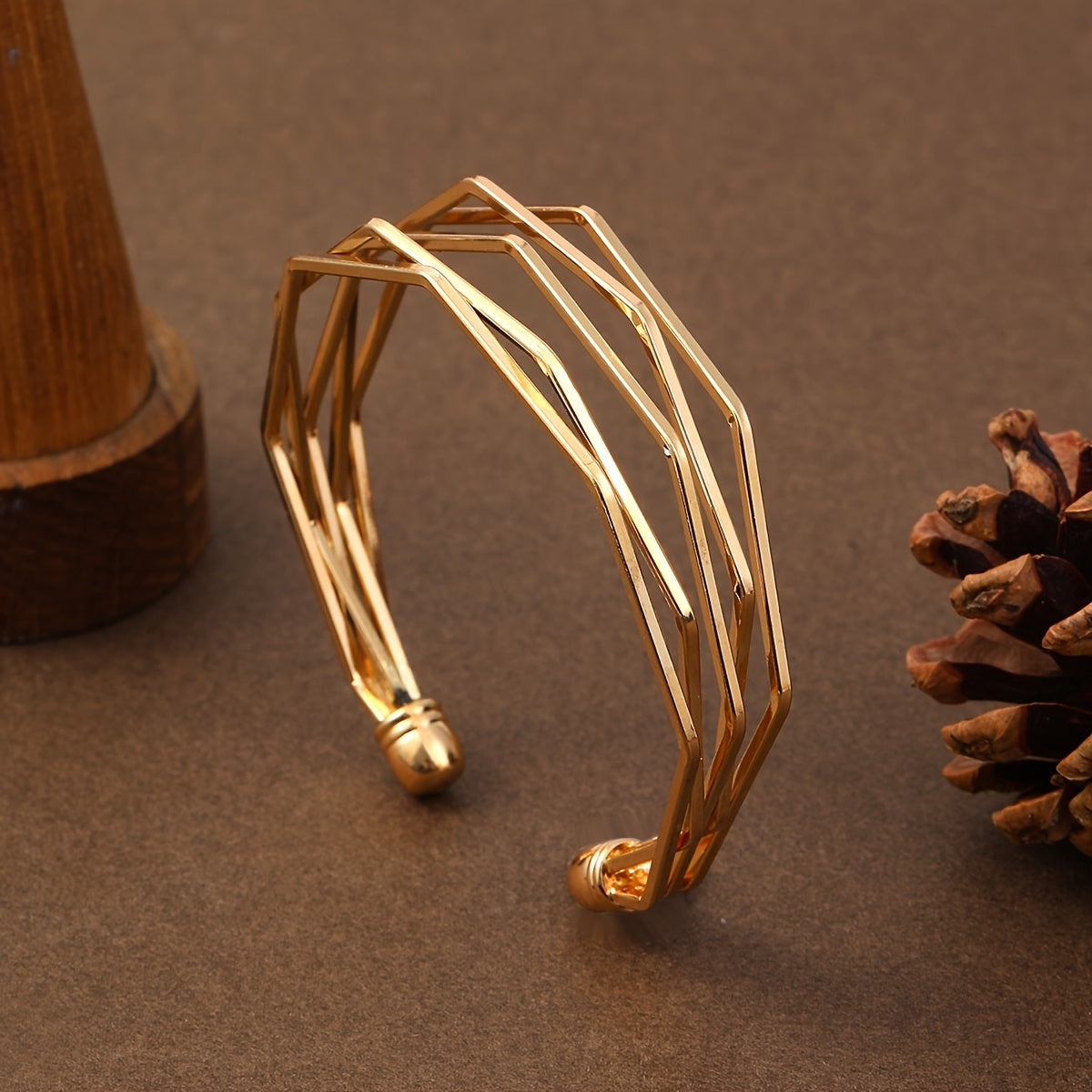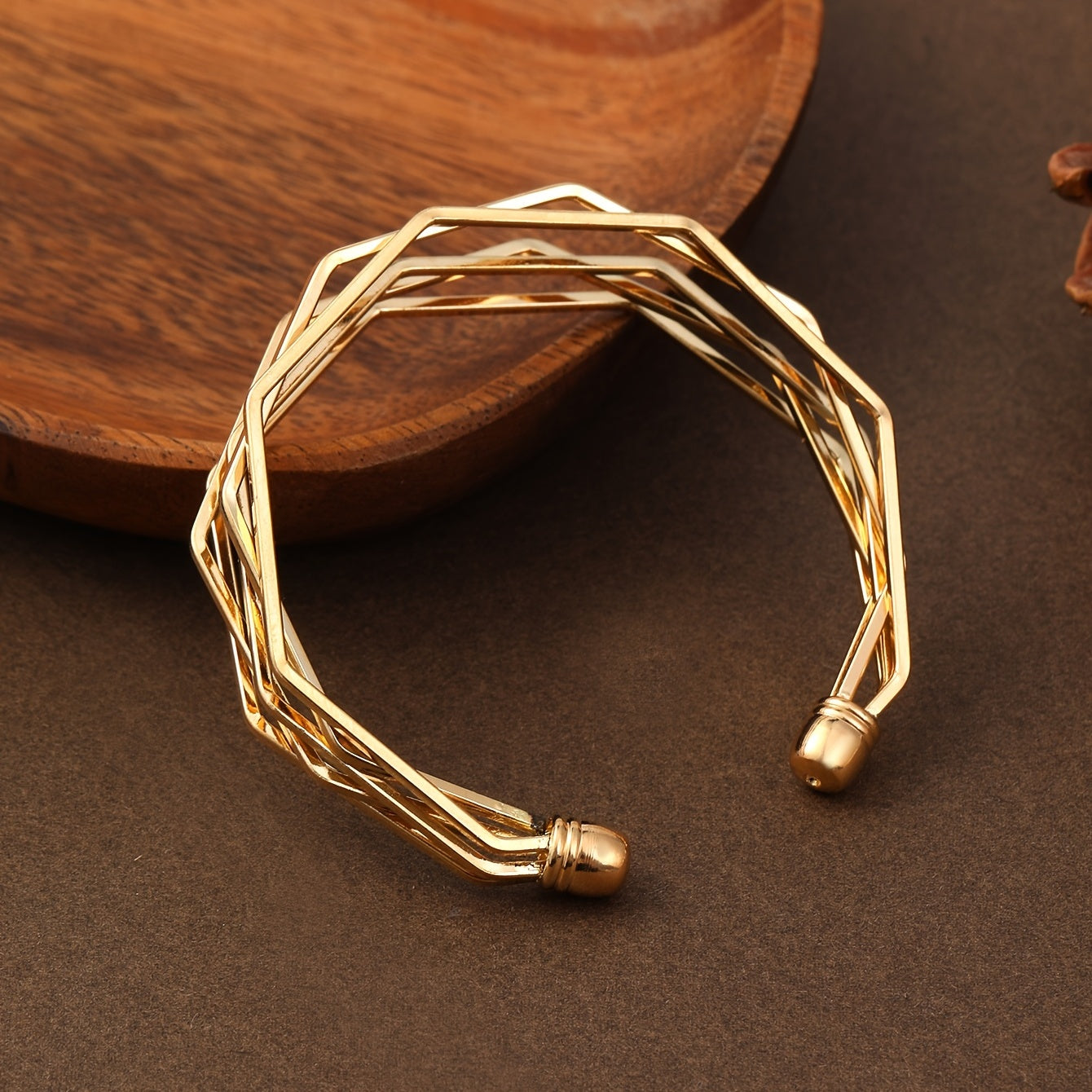 This stylish golden open bangle bracelet is designed with polygonal shapes. It is adjustable and made of alloy. Perfect for women's fashion.