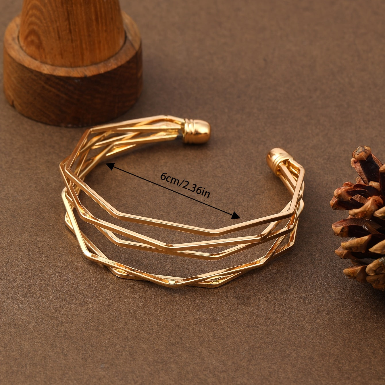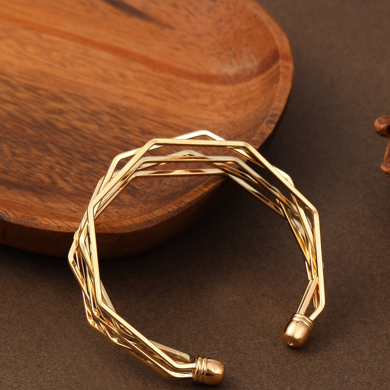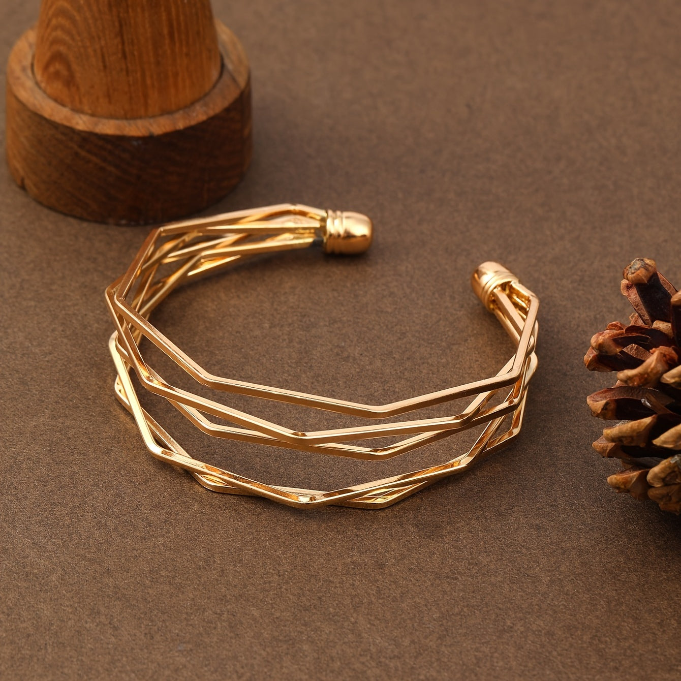 This stylish golden open bangle bracelet is designed with polygonal shapes. It is adjustable and made of alloy. Perfect for women's fashion.