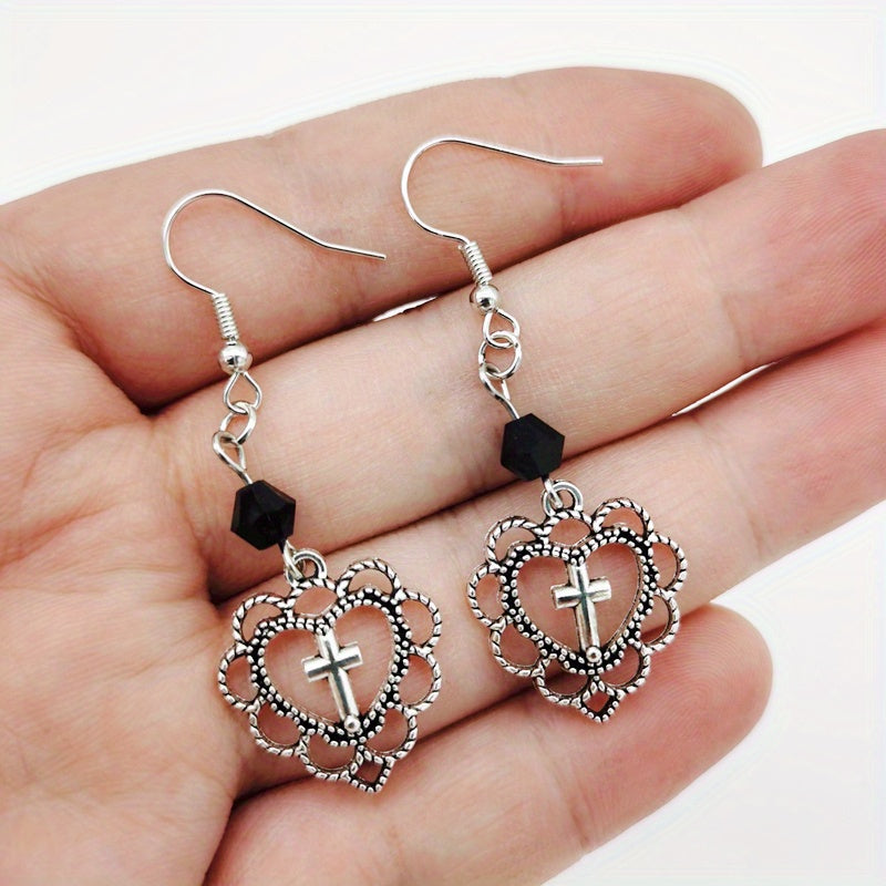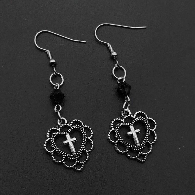 These vintage silvery hollow heart cross drop earrings are a perfect addition to any gothic or punk-inspired outfit. The intricate design and religious symbolism make these earrings a unique and stylish choice for women and girls.