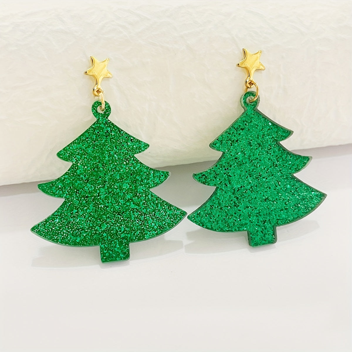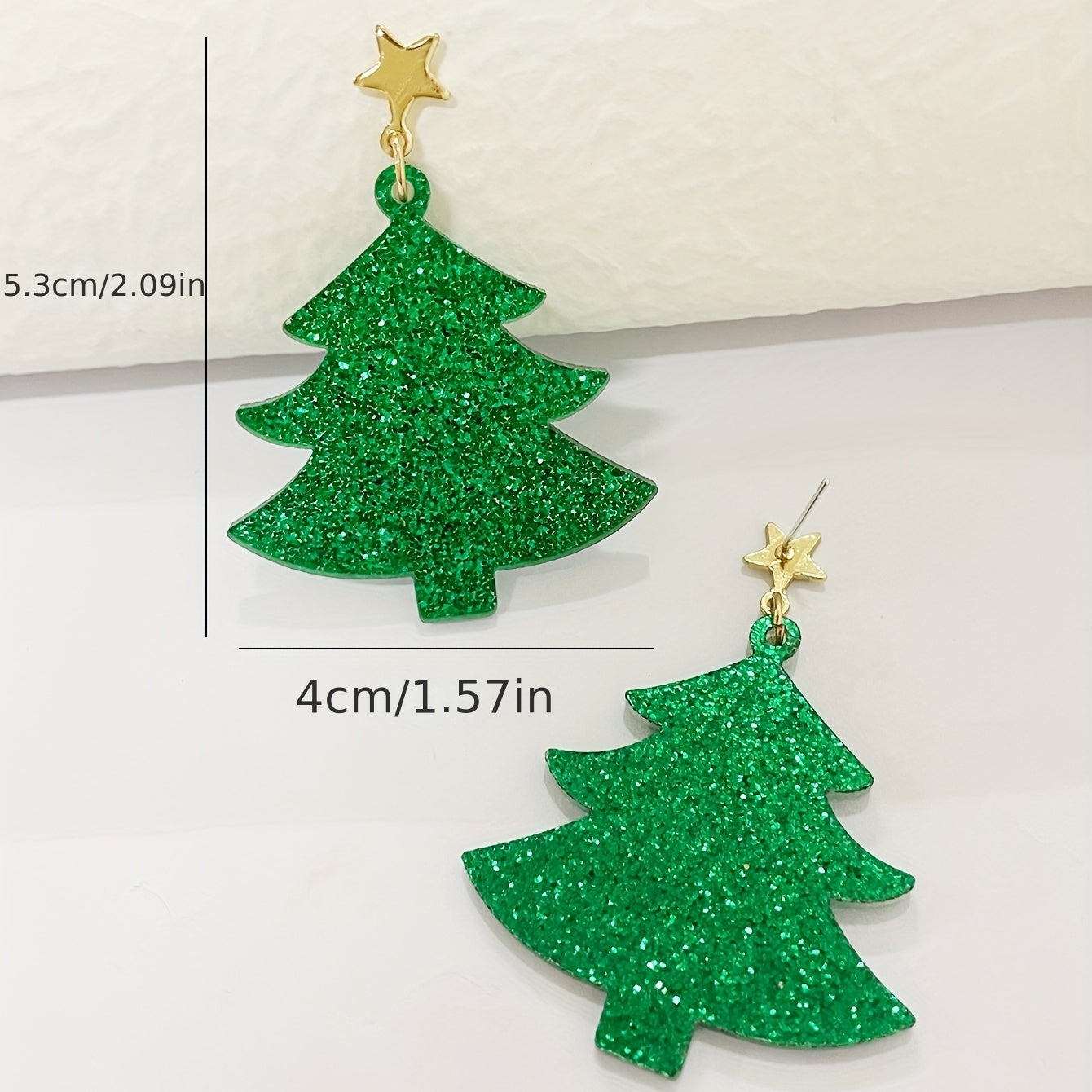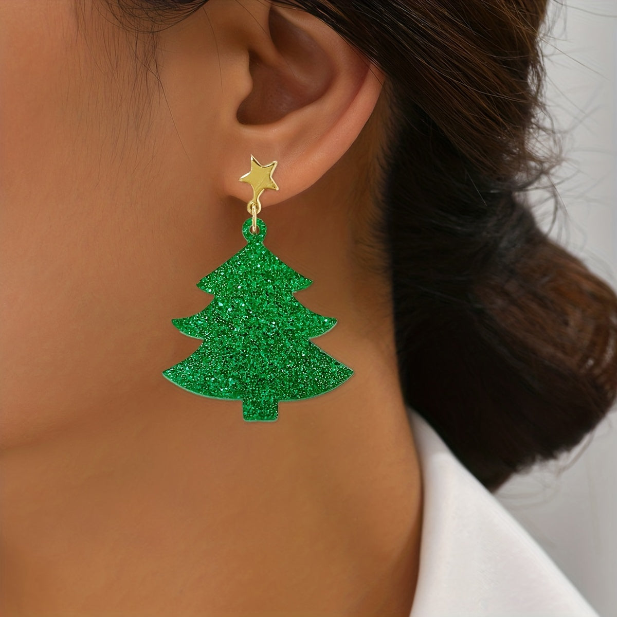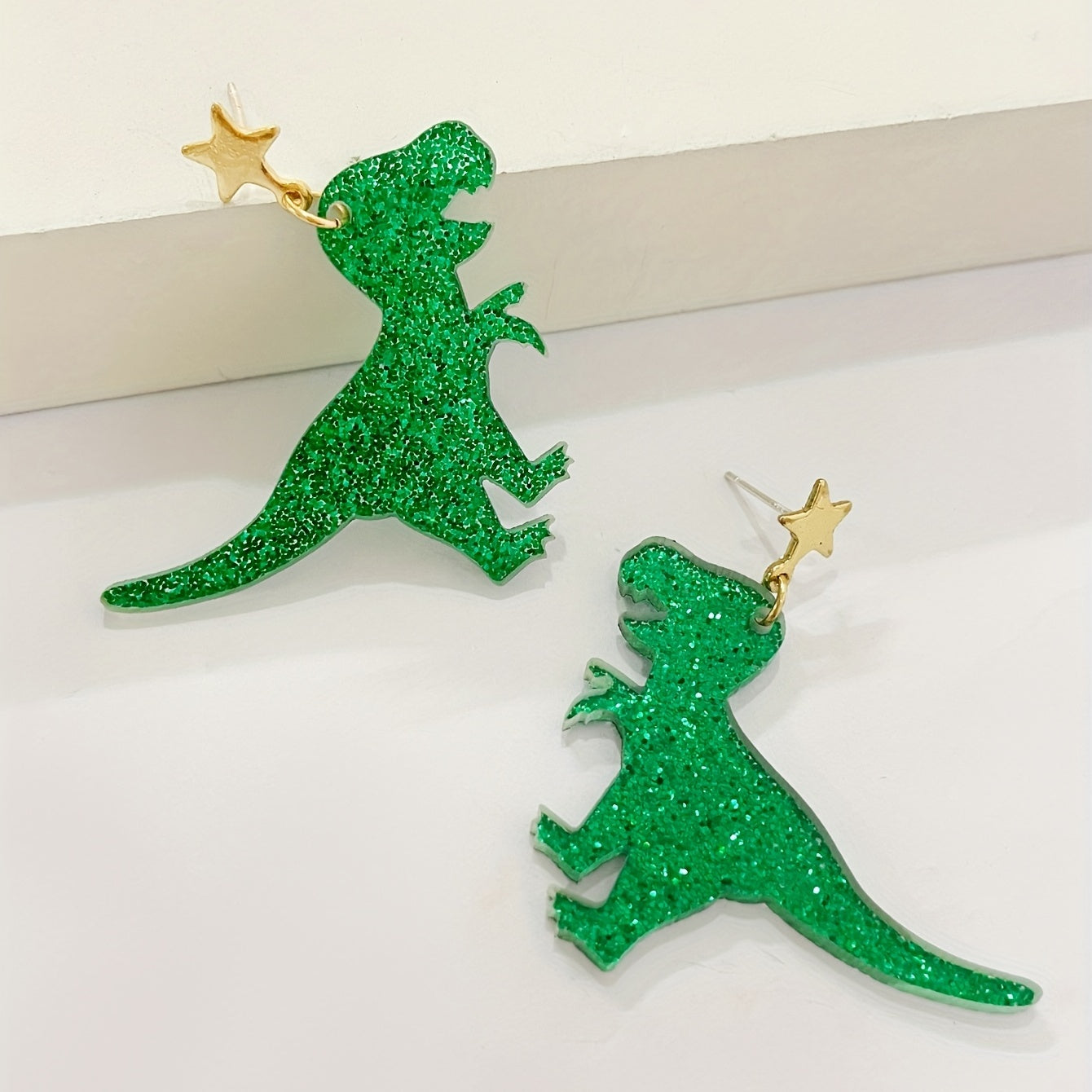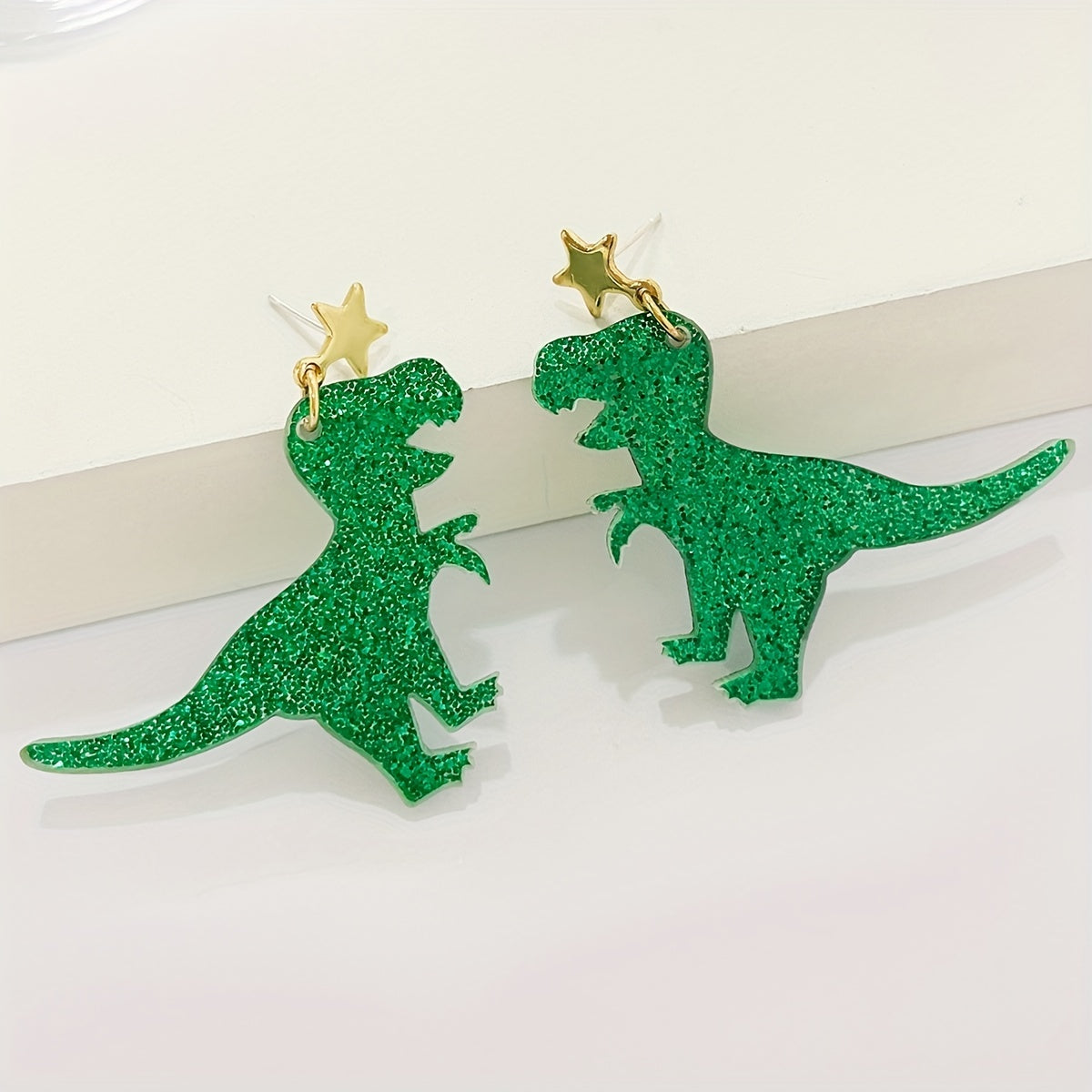 Add a touch of festive fun with these adorable dinosaur dangle earrings featuring a green sequined Christmas tree design. Perfect gift for anyone who loves bling and cartoons!