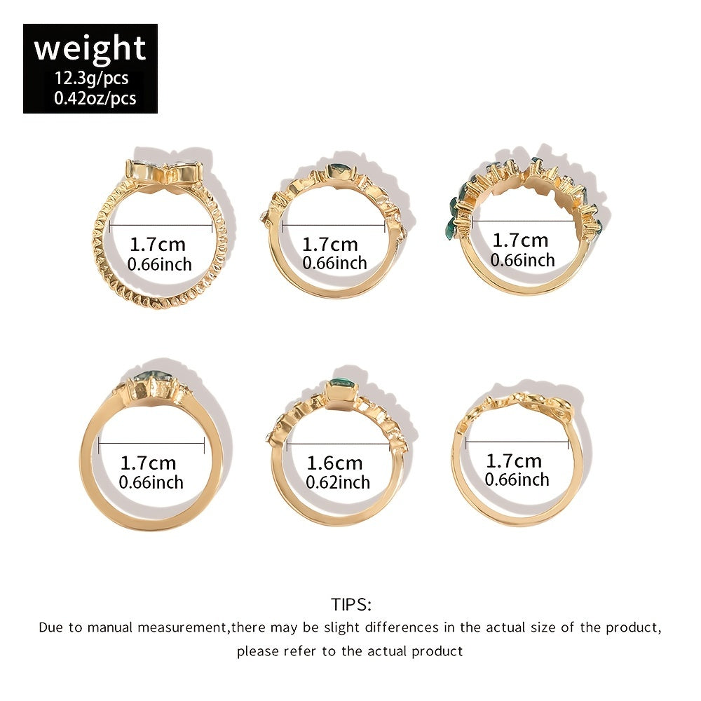 This set of 6 rings features a green vintage emerald heart, love alphabet, and butterfly designs in a geometric style. Perfect for adding a touch of elegance and charm to your outfits.